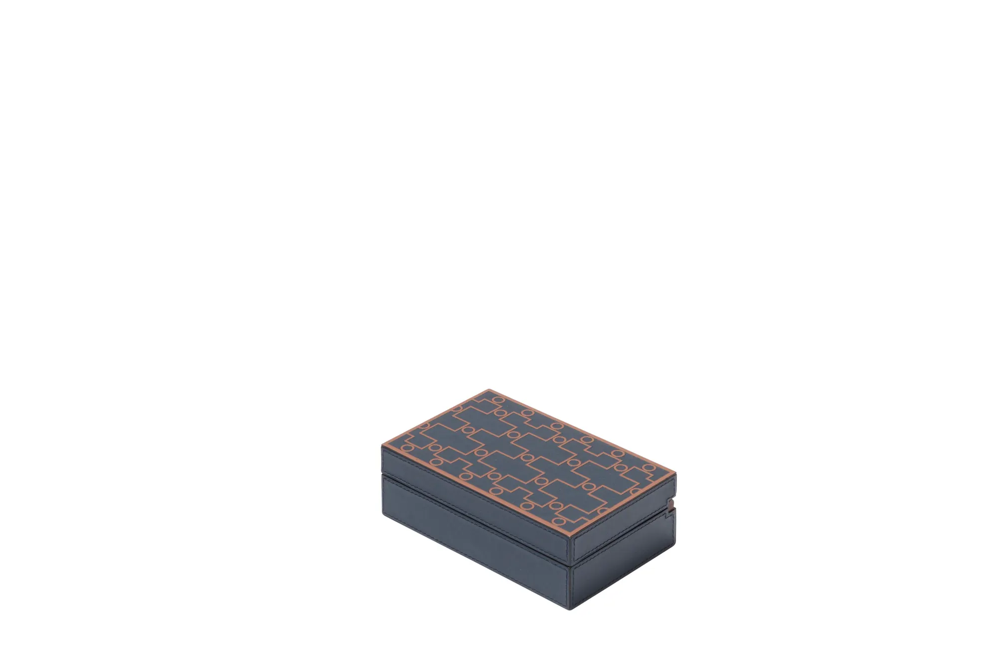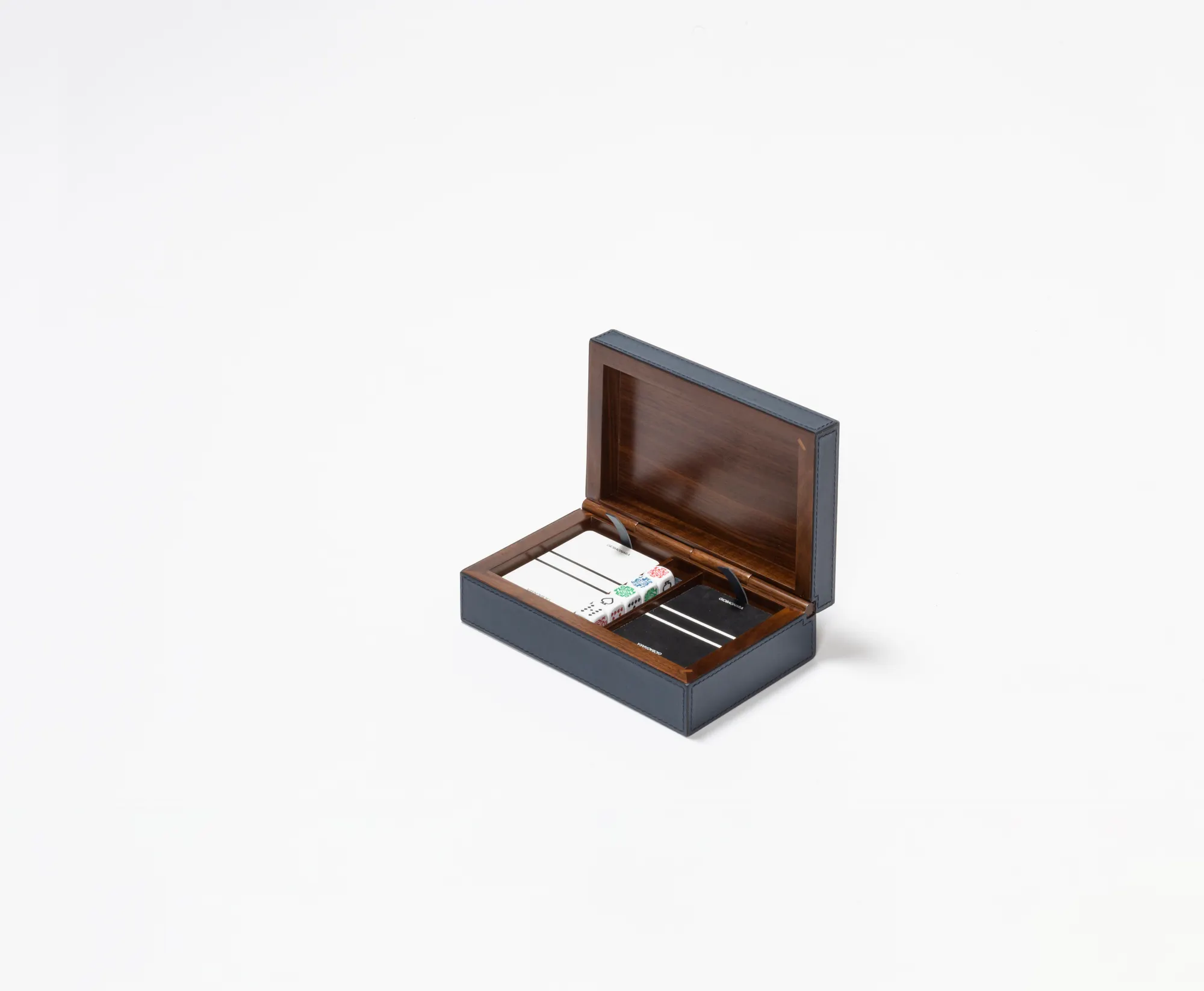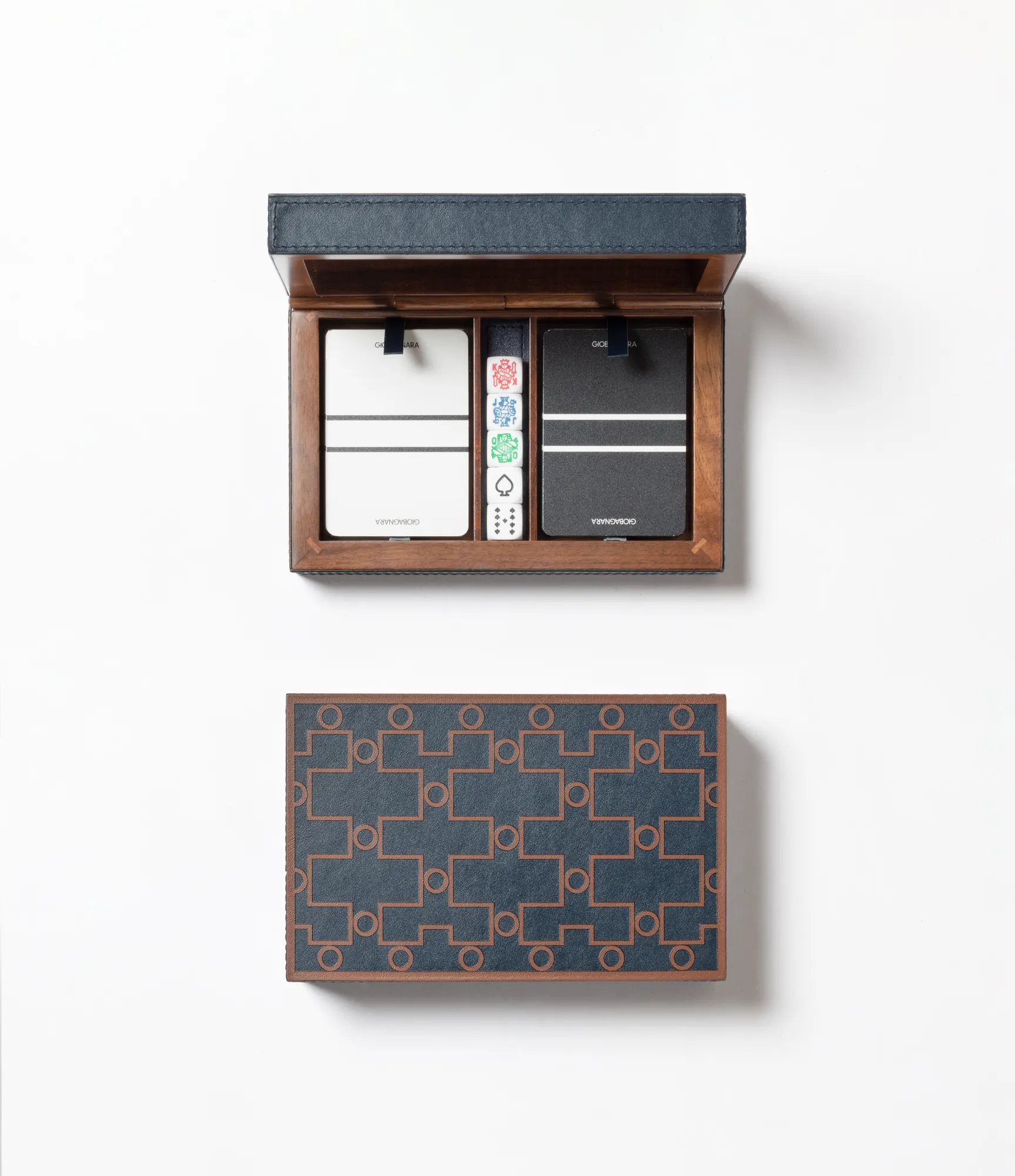 With patterns that directly take inspiration from characterizing details found in suggestive corners of Venice, these printed leather boxes are a celebration of the iconic city on water. Featuring different sizes, shapes and purposes, the San Marco collection of boxes combines historic legacy with modernity, and is the expression of the artistic and cultural vivacity that marked, and still does, this citys history. Leather covered walnut case with walnut hinge. Includes 2 decks of high quality playing cards and 5 poker dice.