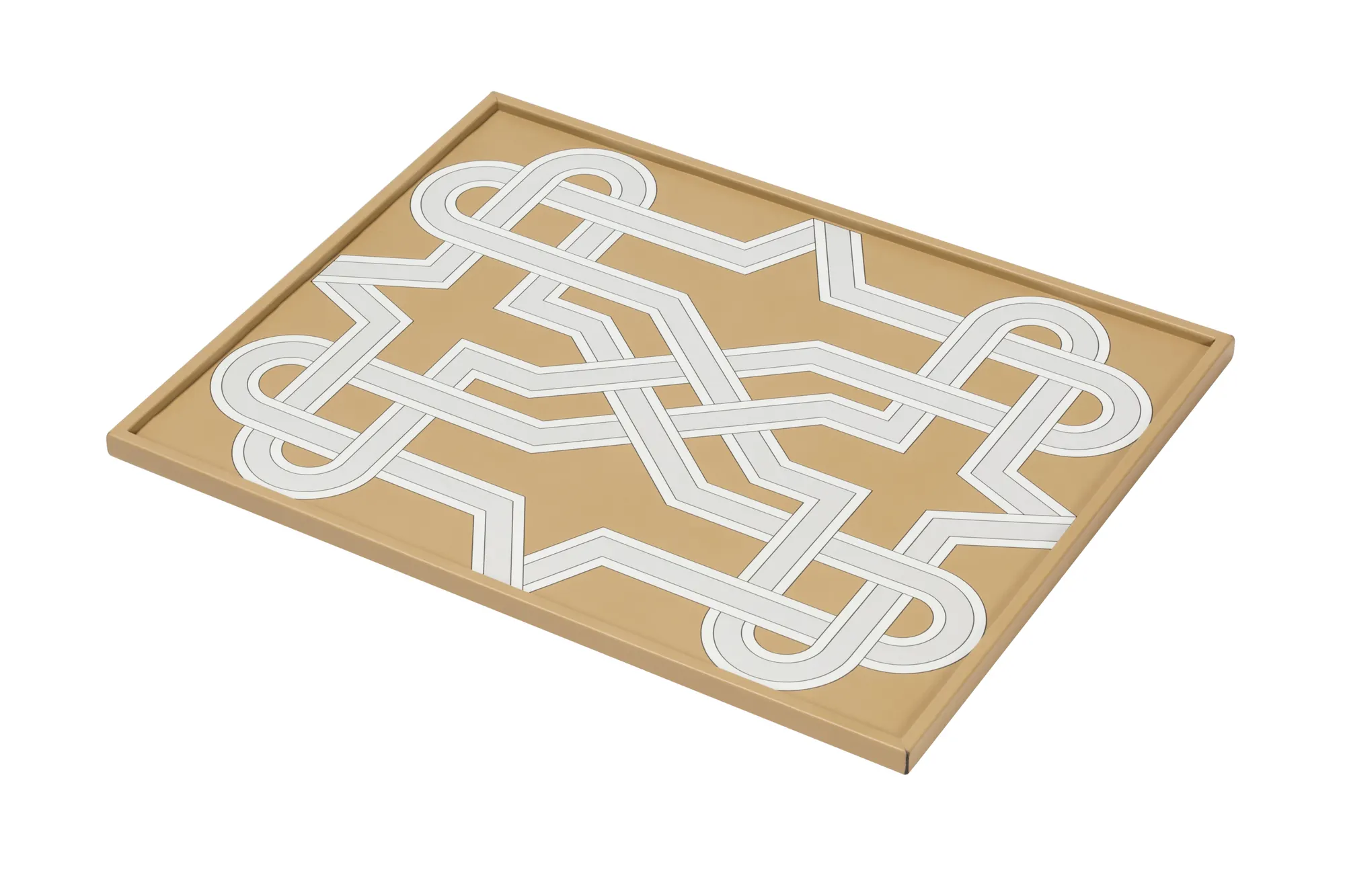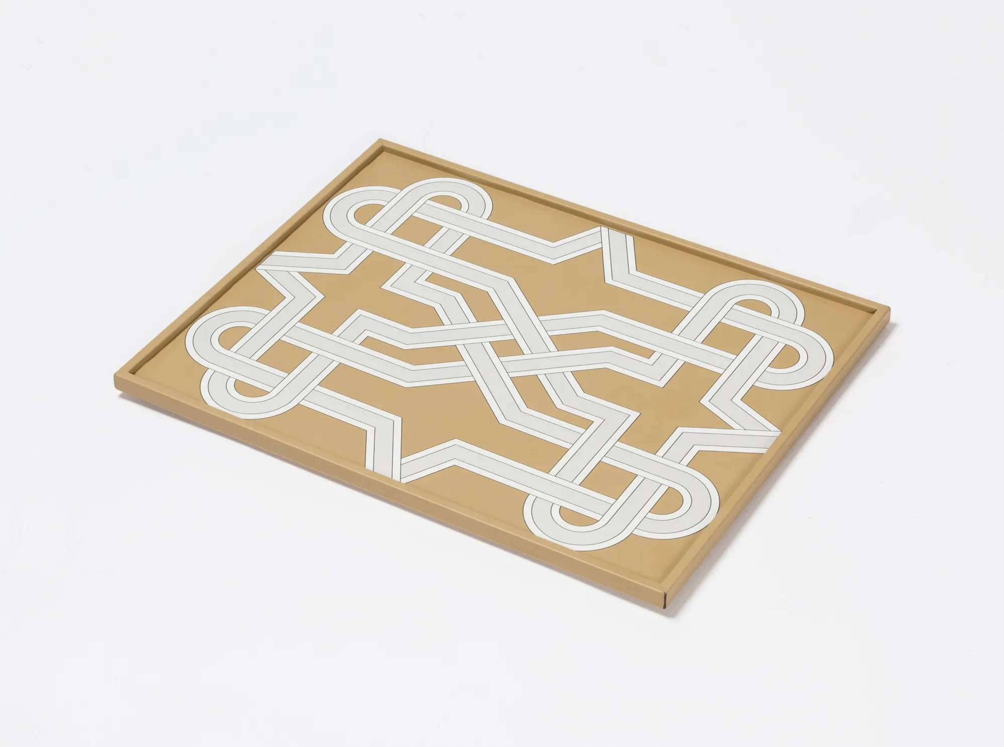 Leather-covered wood structure. Interweaving decorative motif from a marble grating of a window of the Prison of San Marco in Venice.