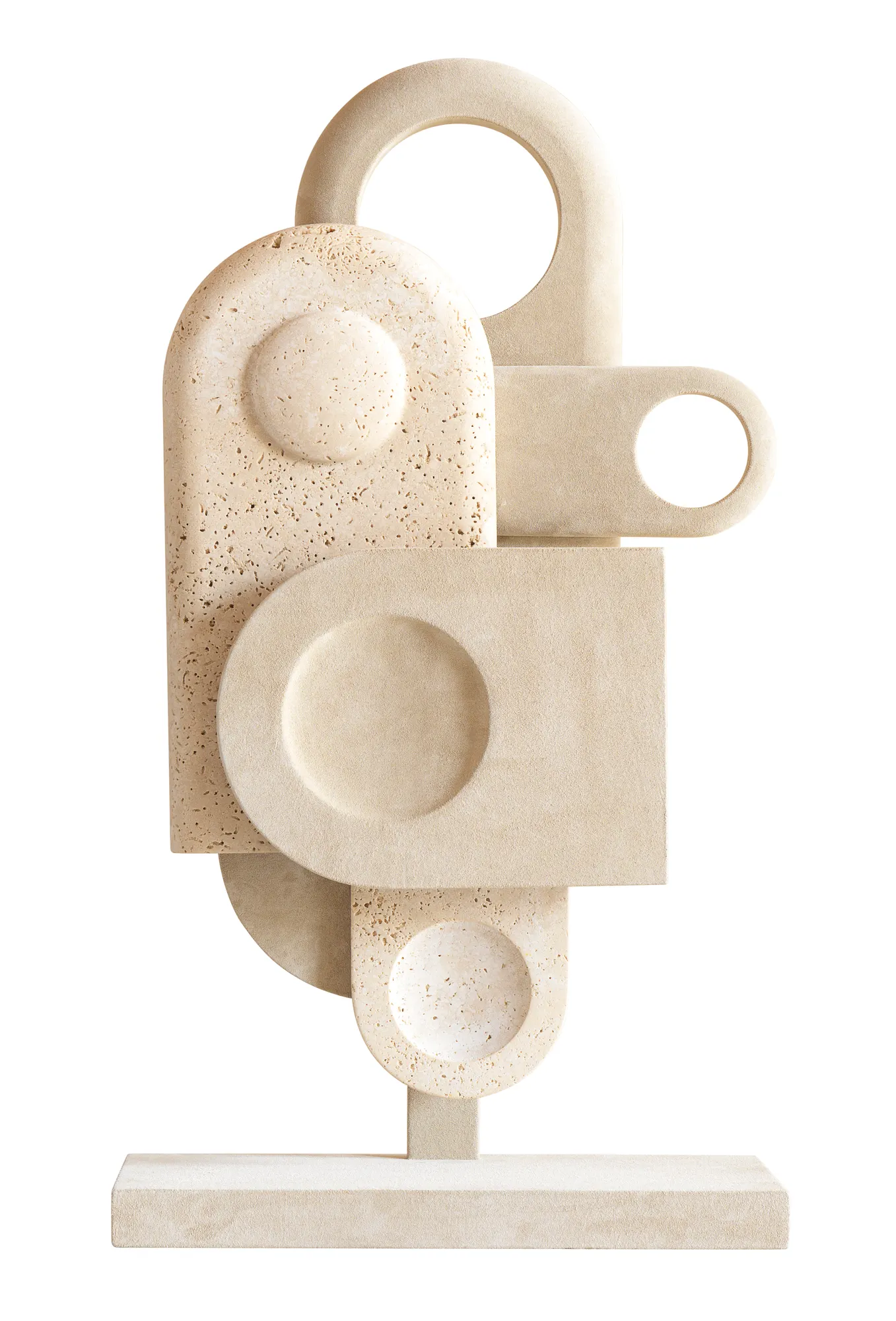 The San Marco sculpture is the result of a mix of space-age design and tribal art, this sculpture is able to create a connection between abstraction and figuration, and features an interplay of contrasting yet complimentary shades and textures due to the use of delicate, soft suede together with the sophisticated, naturally charming Osso travertine. Such juxtaposition enhances shapes and volumes, giving birth to an inimitable collectible piece with a timeless beauty.
