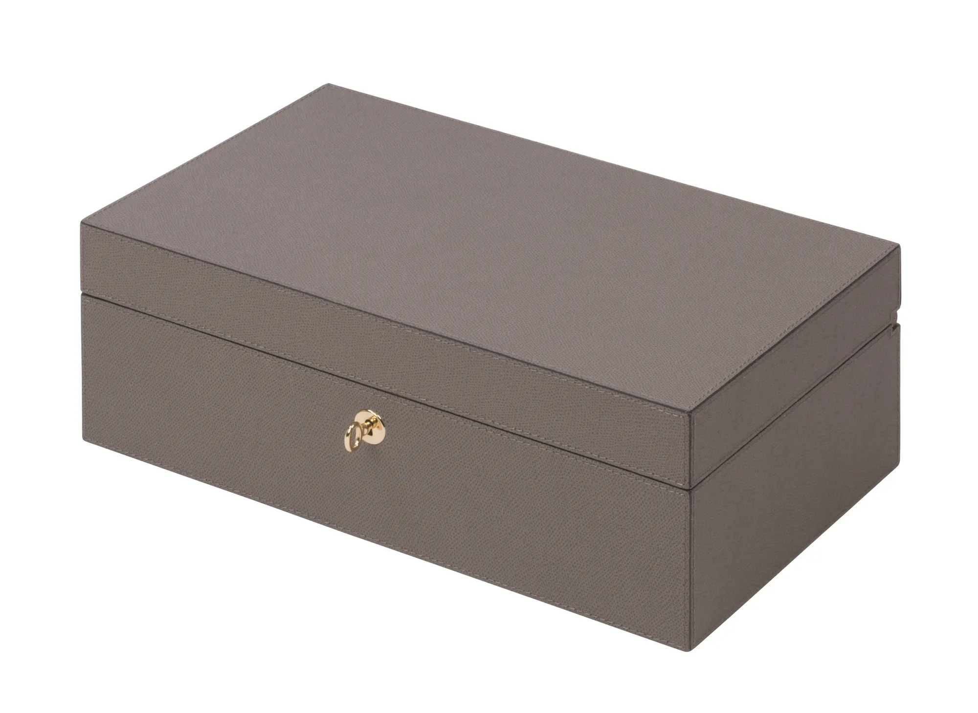 Leather covered walnut cigar case with aged cedar lining, 2 removable dividers, walnut hinge and lock. Includes humidifier and hygrometer.