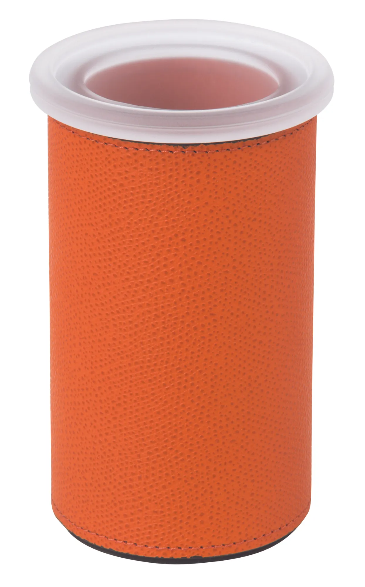 Leather covered mouth-blown frosted glass structure. Non-slip waterproof rubber base underneath.