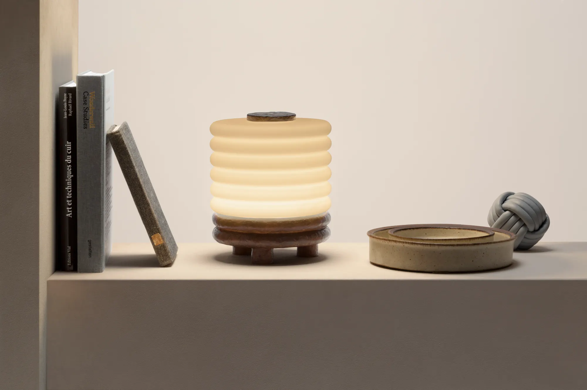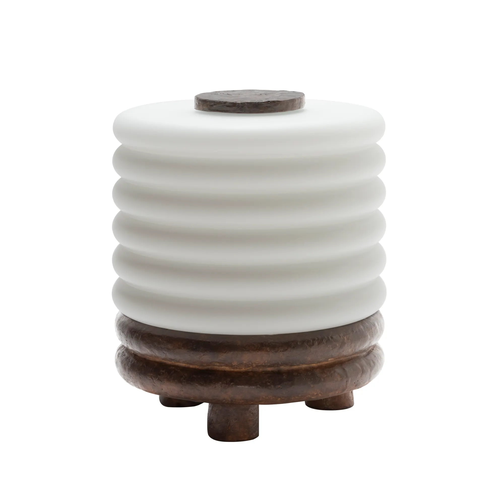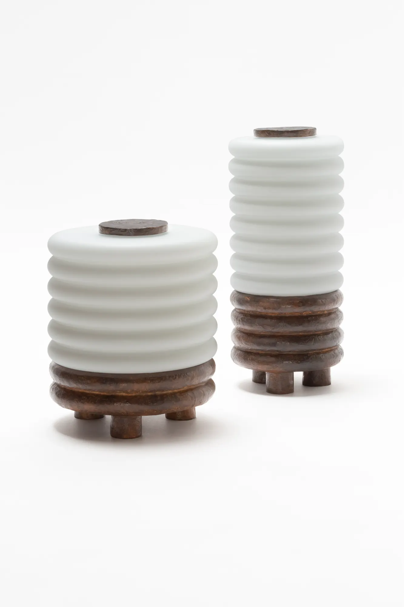This line objects was inspired by the “stacked” shape often seen at the base of some buildings in Italy, as well as Salvatore Ferragamo’s celebrated heel. The Scala collection features a selection of furnitures such as stools, tables, end tables, nightstands and sideboards, as well as small interior decor and accessories such as centerpieces, boxes, lanterns and vases, which all have an identical recurring motif, layered and highlighted by deliberately thick legs, that lends a delicate graphic line. The key to these pieces’ elegance is absolute precision of proportions. Wallpaper* Design Awards 2018 Winner. Artistic bronze casting base and opal glass lampshade.
