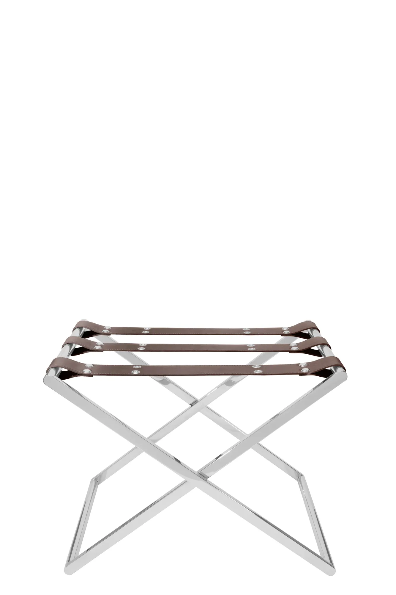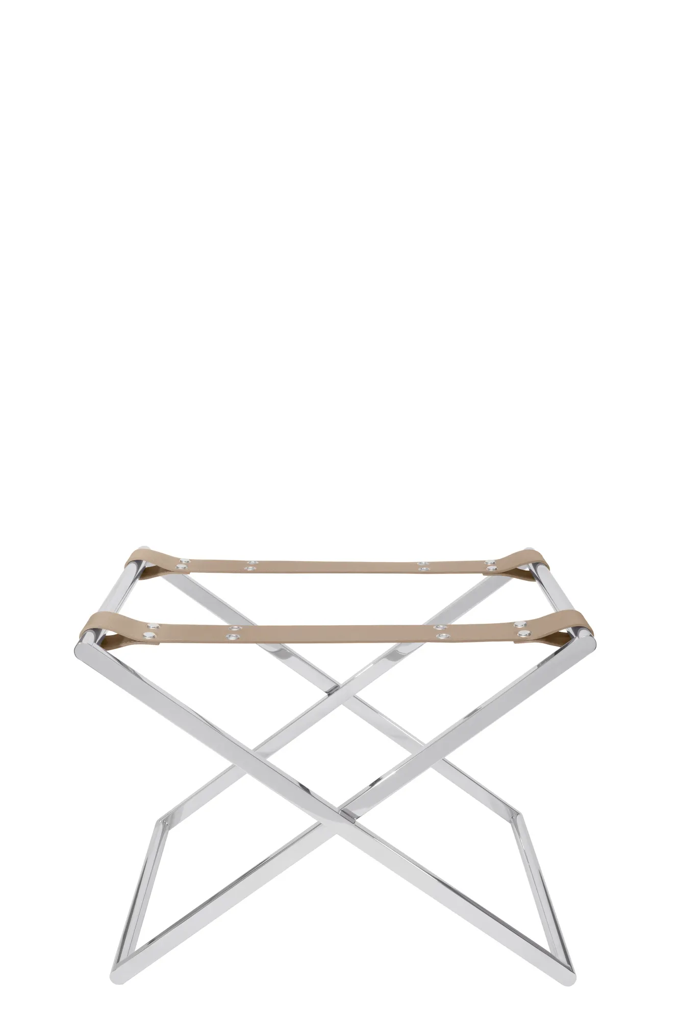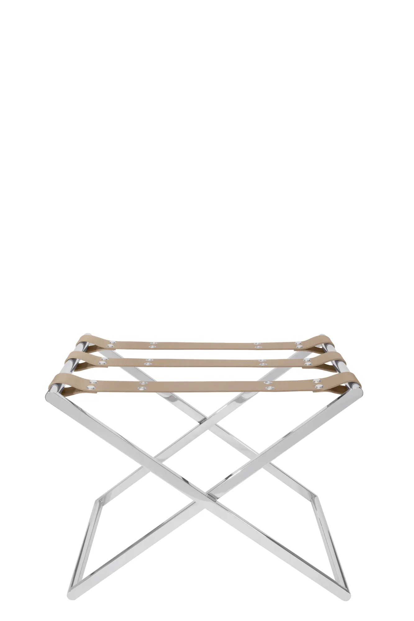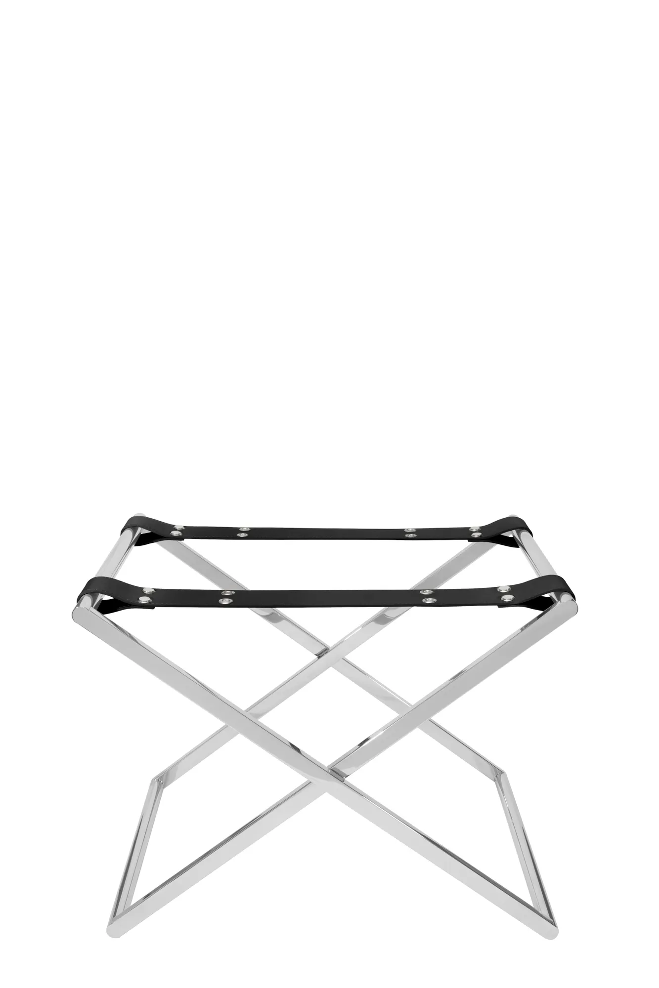 Folding luggage rack with 3 leather straps. Chrome or gold metal legs with adjustable height.