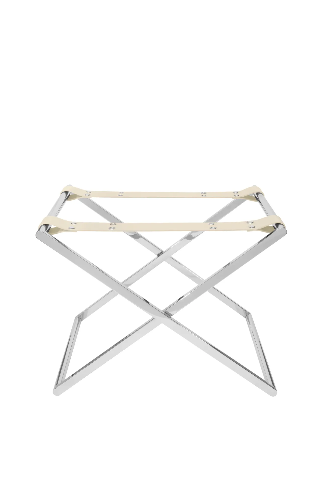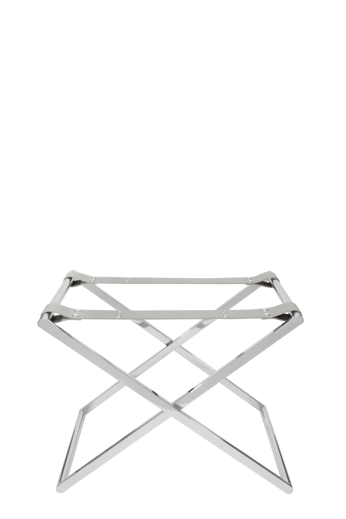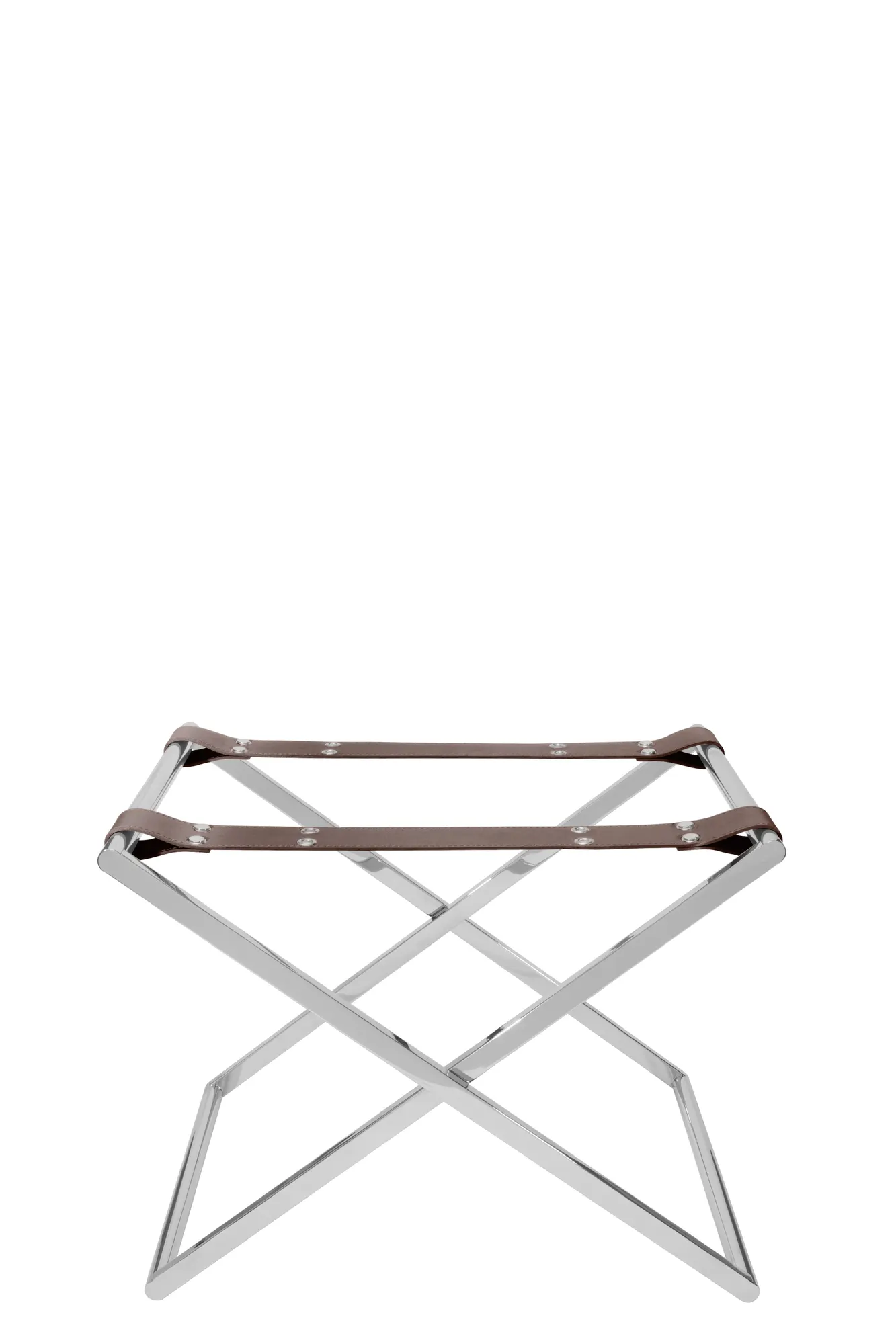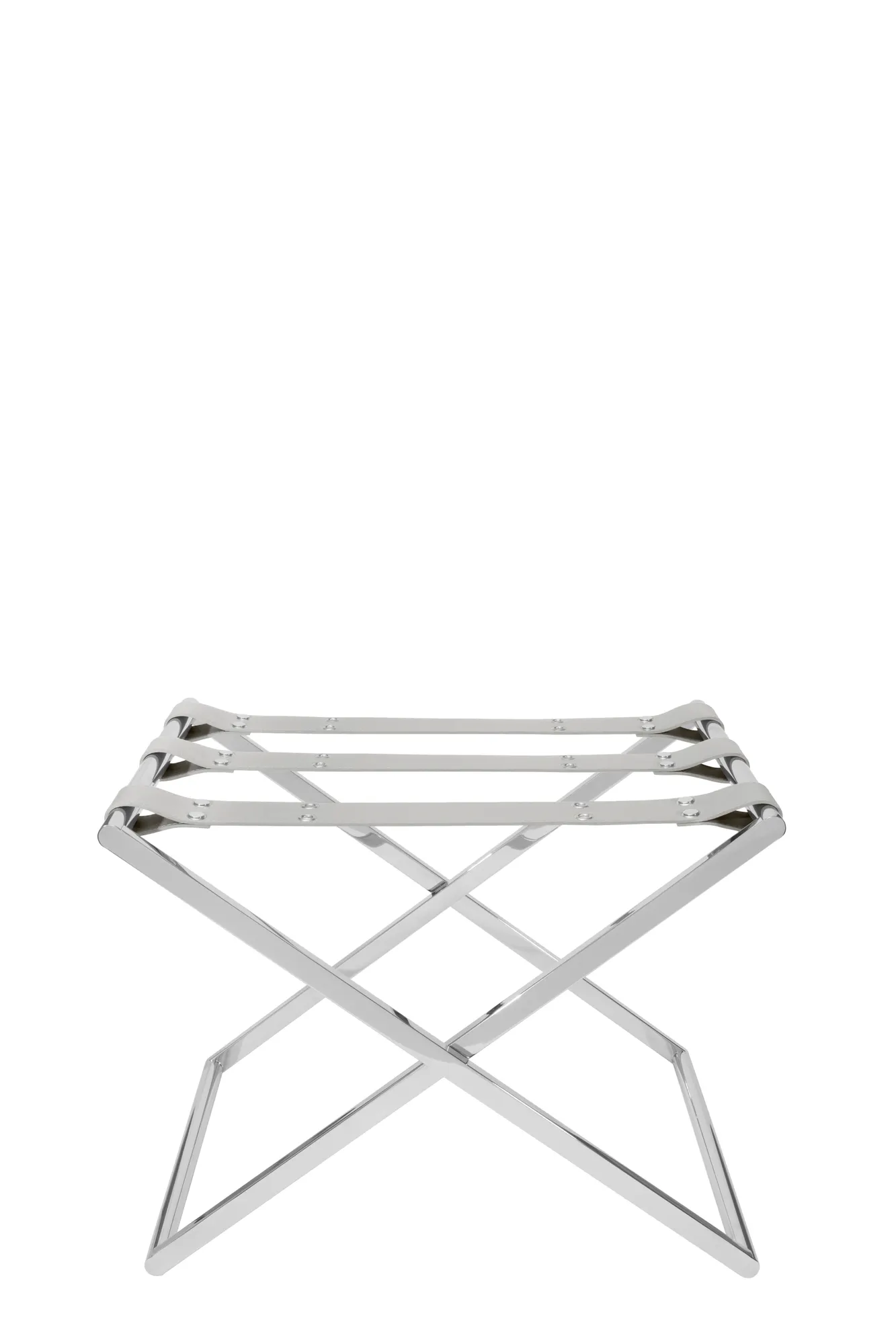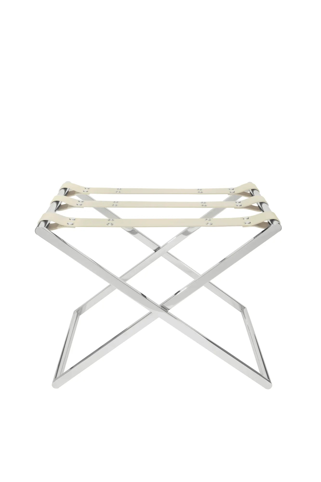 Folding luggage rack with 3 leather straps. Chrome or gold metal legs with adjustable height.