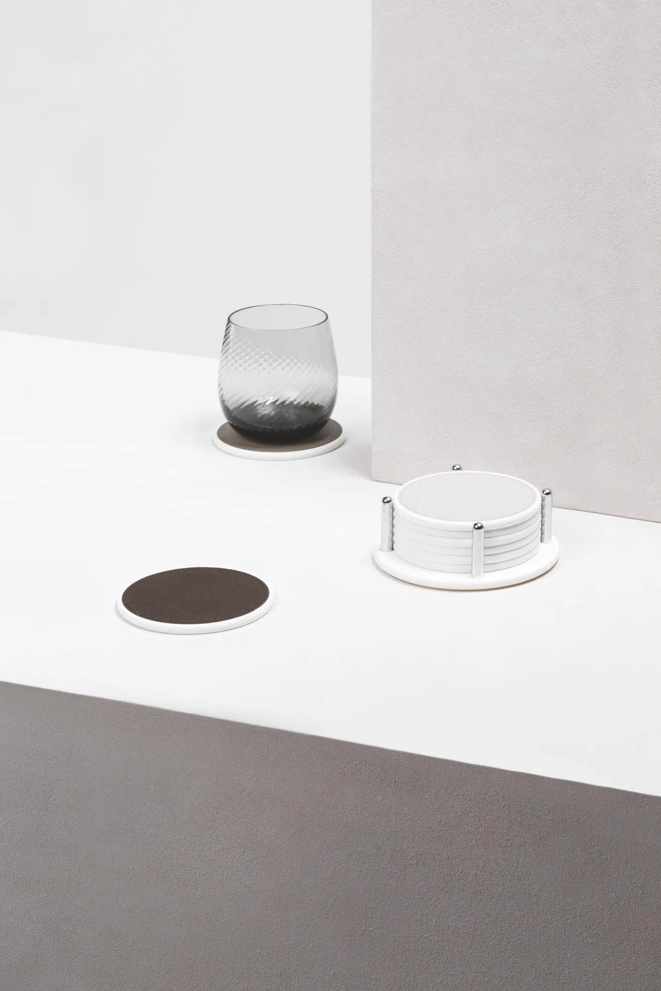 A collection of tableware accessories made of white Corian® with a leather insert. This new combination of materials will give a fresh and modern look to any table setting, with high functionality and aesthetic performance.