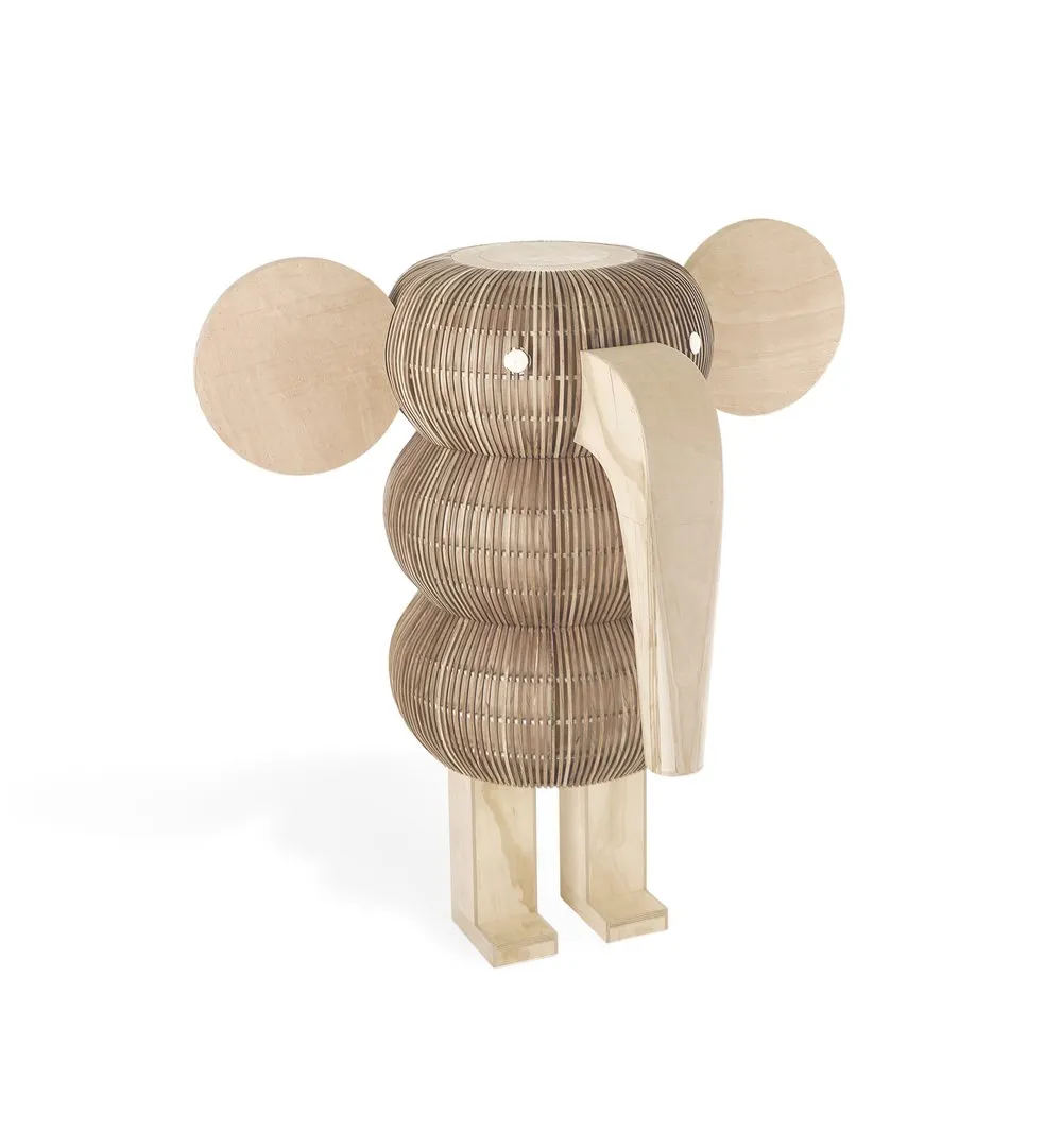 SMELLY FANT THE ELEPHANTOID LIGHT. Literally speaking, this elephant in the room is one that cannot be ignored. Standing 163 centimetres tall (that’s over 1 1/2 metres), Elephant is the life-size creation of Isidro Ferrer’s kindred Funny Farm character—Smelly Fant. An inspired light sculpture, Elephant is certain to bring a smile to every face and arouse a feeling of wonderment. To produce the Elephant light, craftsman Manolo Martin employed the ‘vareta’ technique (used in creating the life-size Fish). The result is a handsome handmade wooden structure: an elephantoid lamp with big ears, a trunk, legs and body. A soft and cheerful light is diffused through Elephant’s natural wood veneer inner lining. Perfect for a myriad of public and private settings, Elephant is happiest when surrounded by loving and curious individuals. Each Life Size piece is unique, as evidenced by the artisan’s handcraftsmanship in each one of them, the finish of each one is different and the raw materials used, without hiding their original nature, highlight their uniqueness, providing a coherent discourse with the artist’s intention.