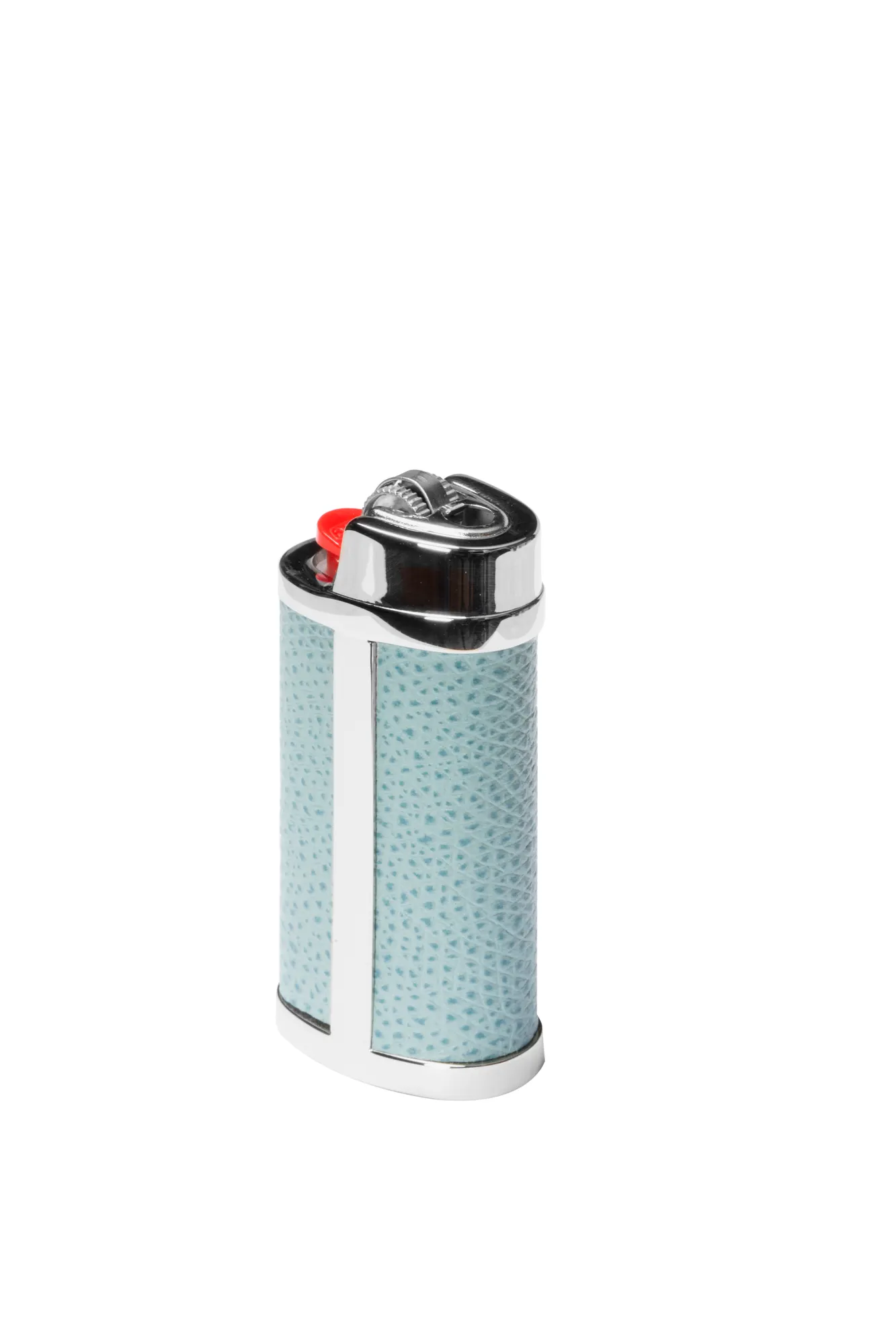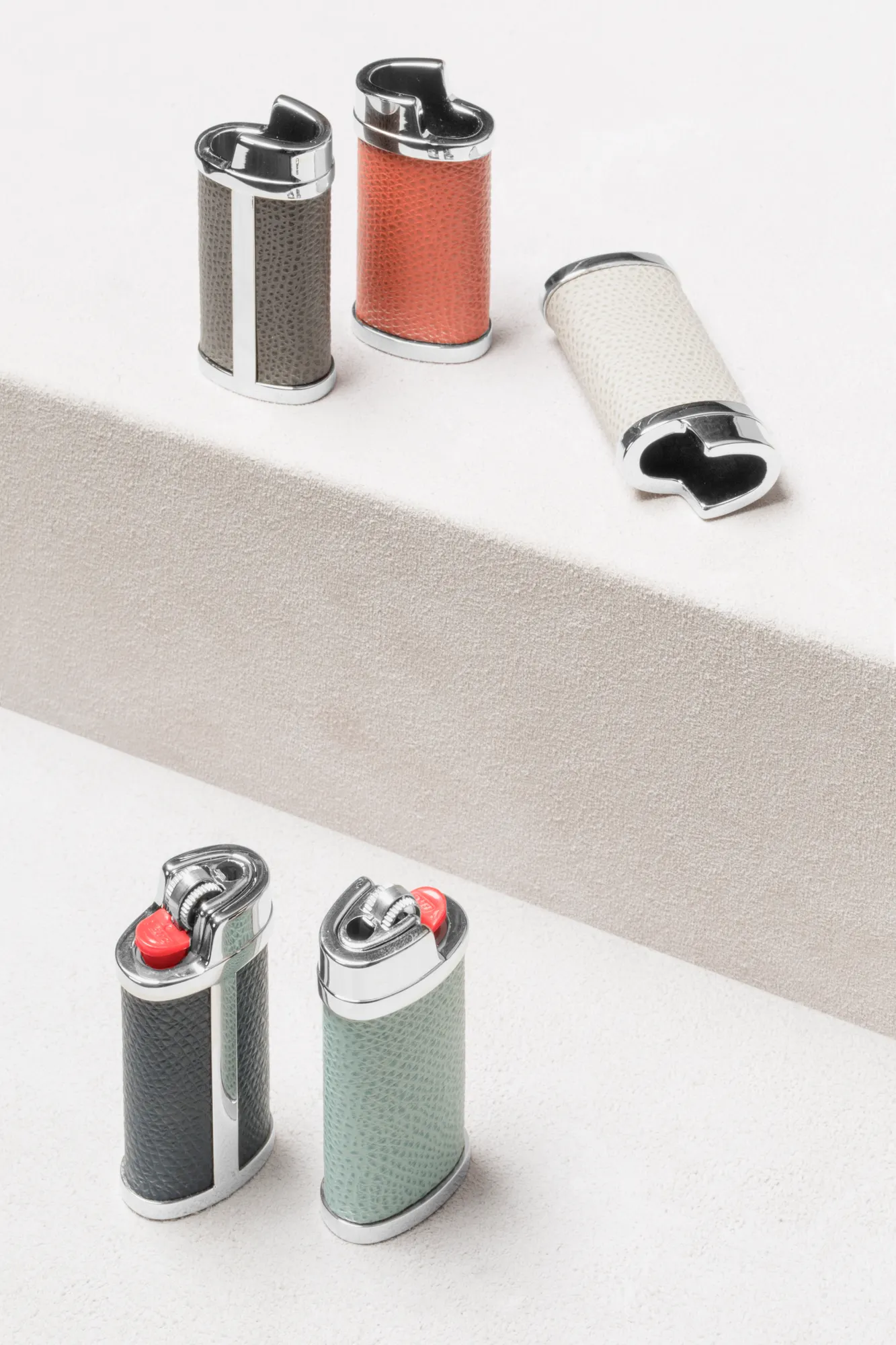Polished chrome structure featuring fine leather inserts. This leather case is ideal to host a BIC mini lighter.