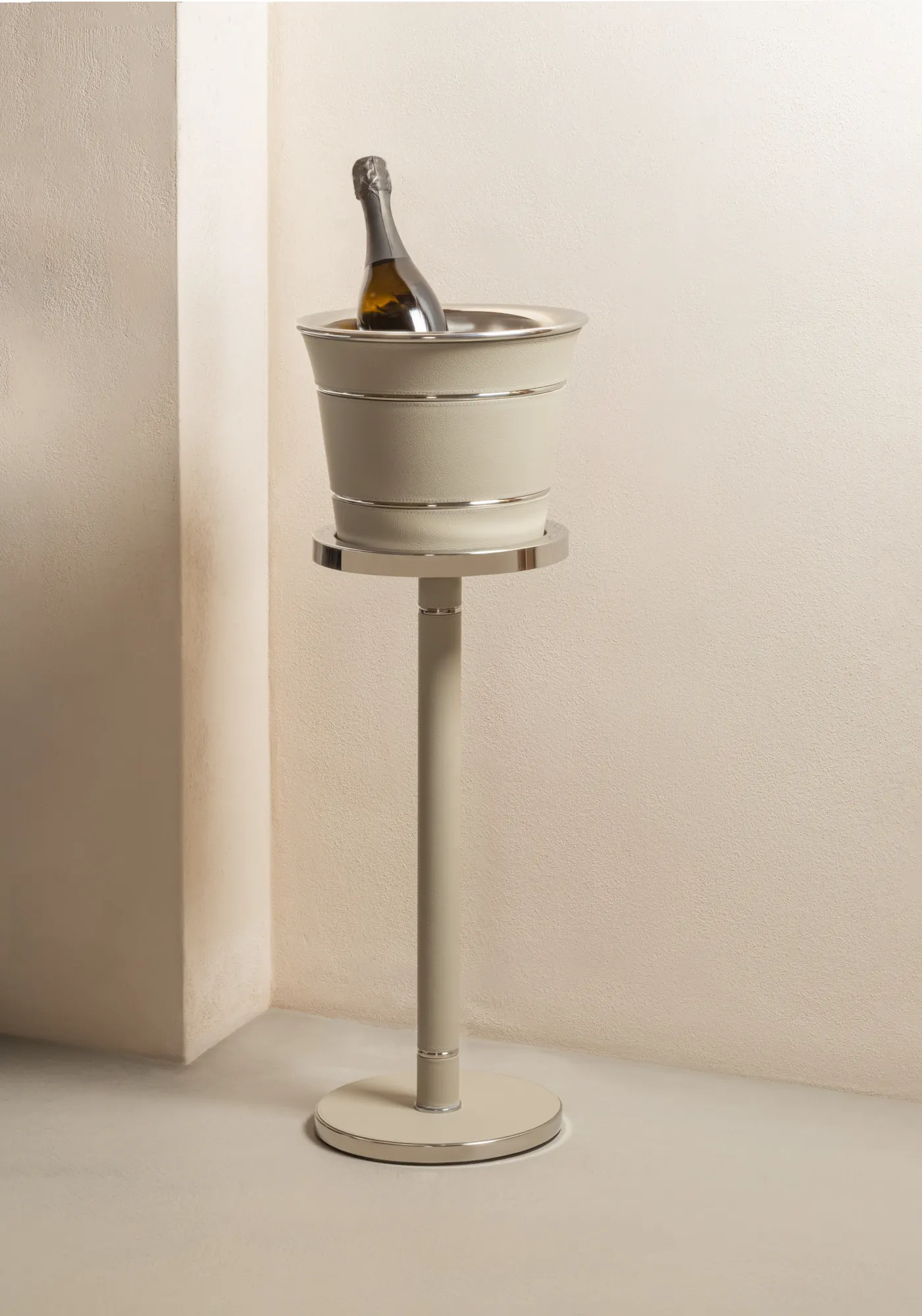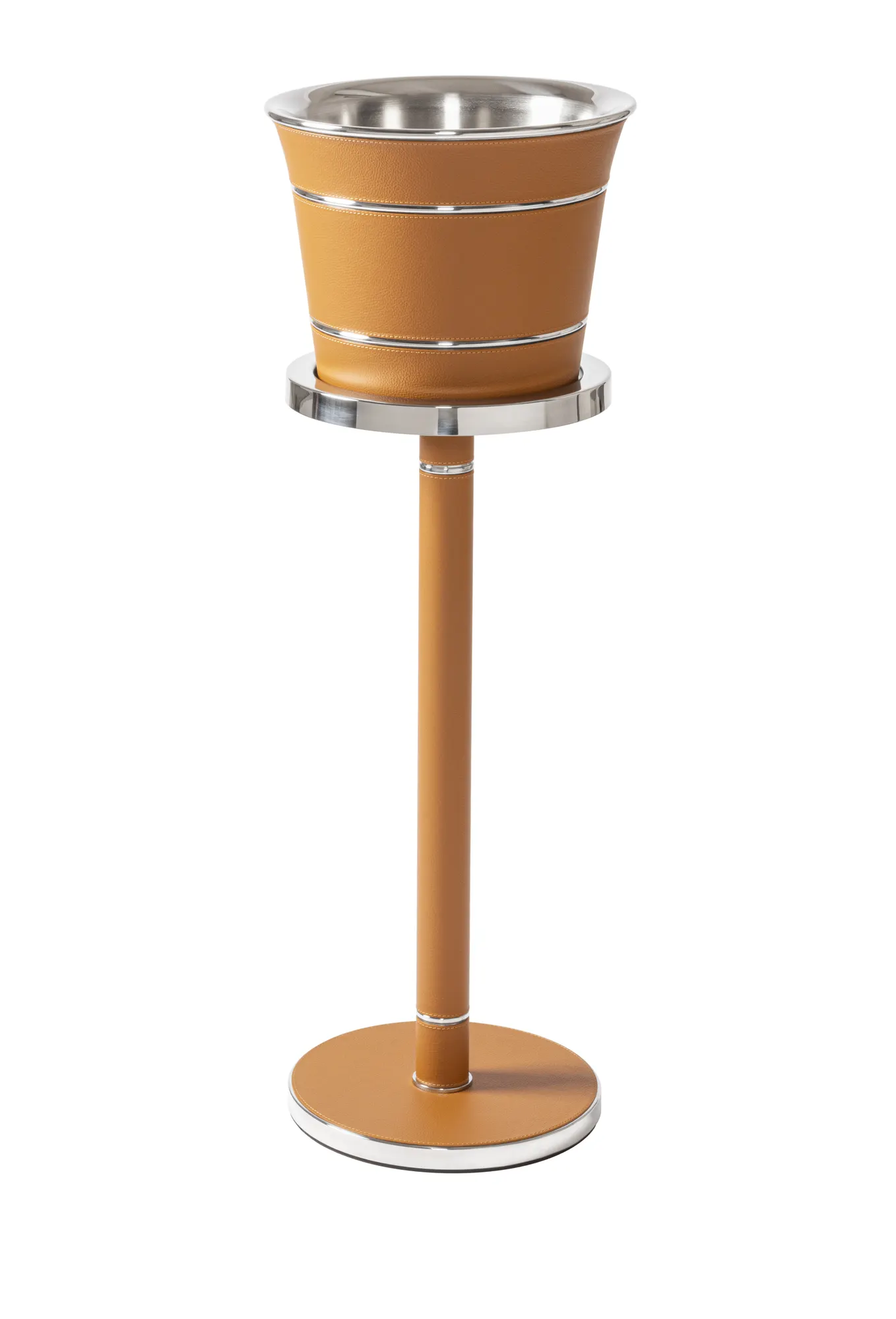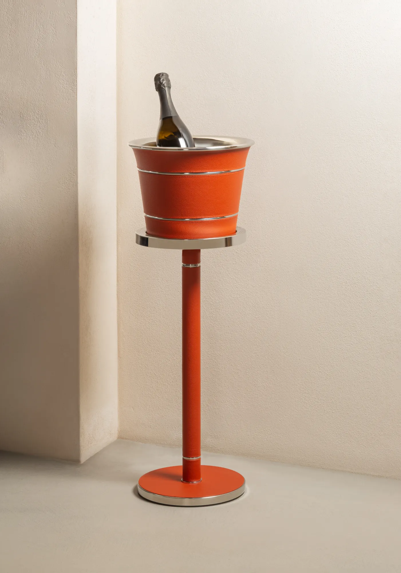 This champagne bucket features an insulated double-chamber polished steel structure. The rich leather detailing complements the sturdy metal construction beautifully. Entirely made in Pelle Frau®. Available in all the colors from the Giobagnara x Poltrona Frau finishes chart.