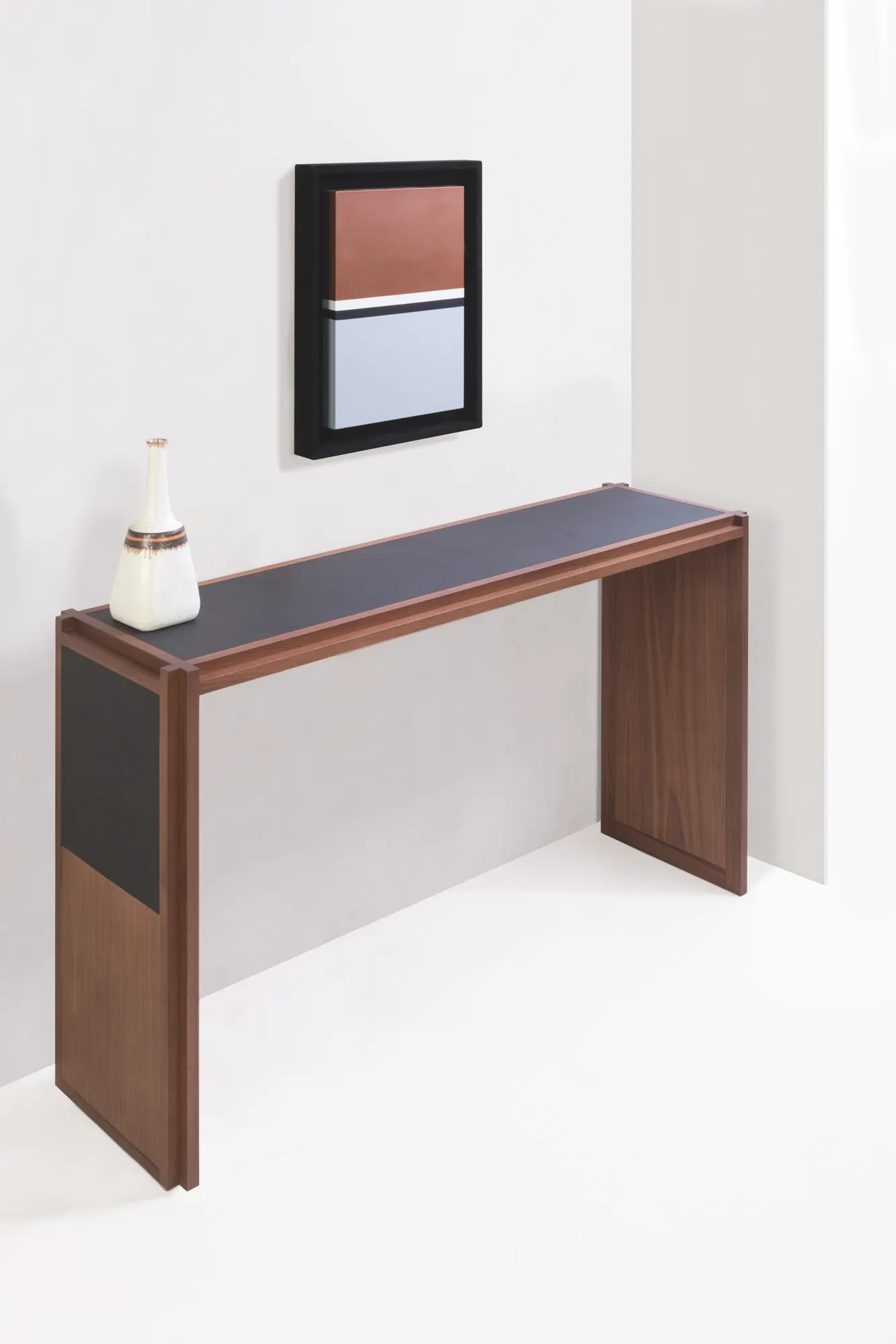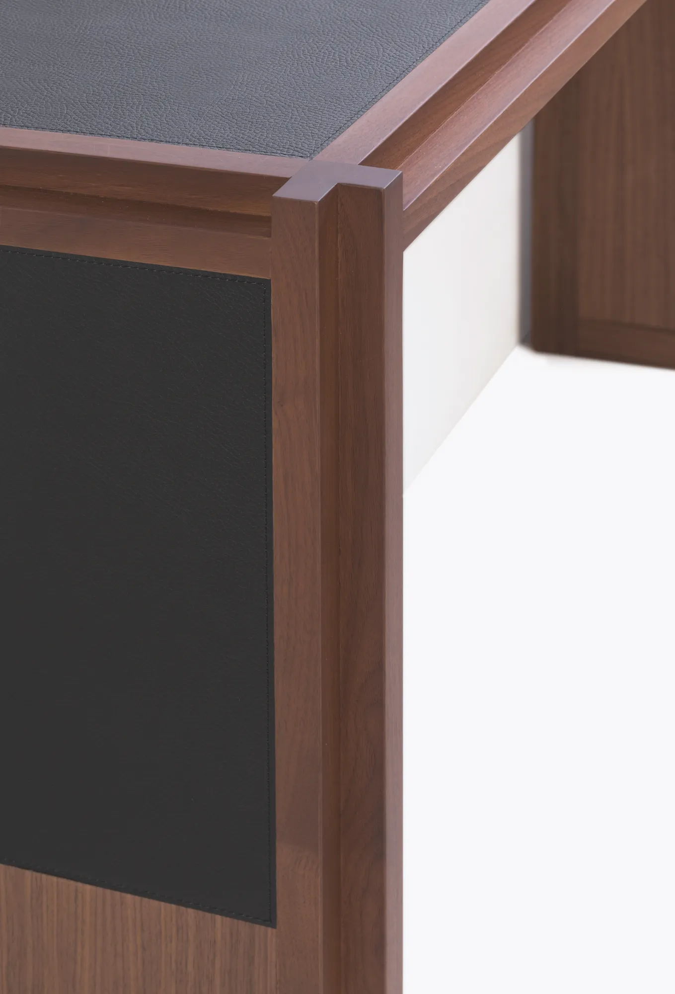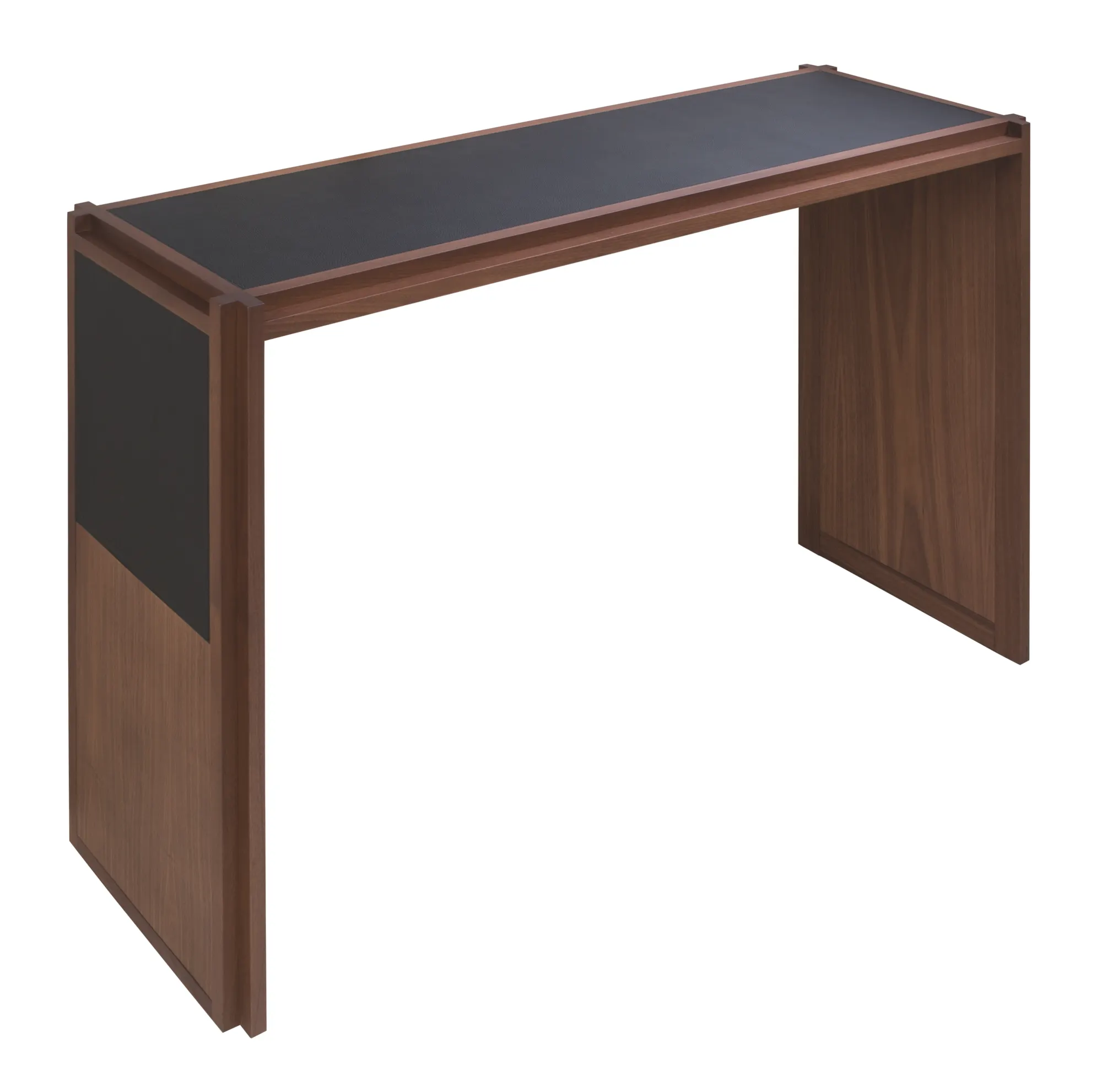 Structure in solid walnut or dark stained oak with leather inlays and sleek architectural lines.