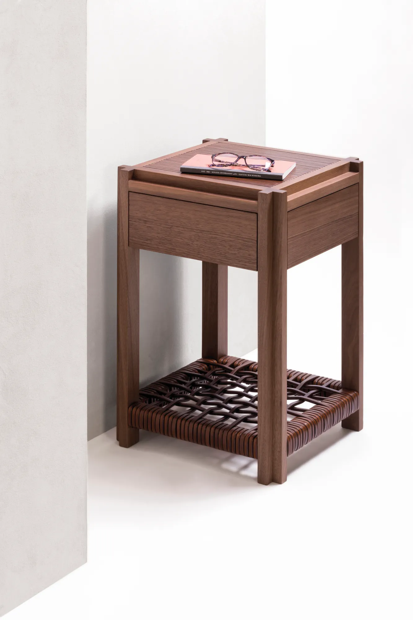 A collection of furnishing elements that features a crisscross leather pattern in brown (SL09) or black (SL20). The design is solid yet light in appearance. The material projects a vintage look that will age gracefully.