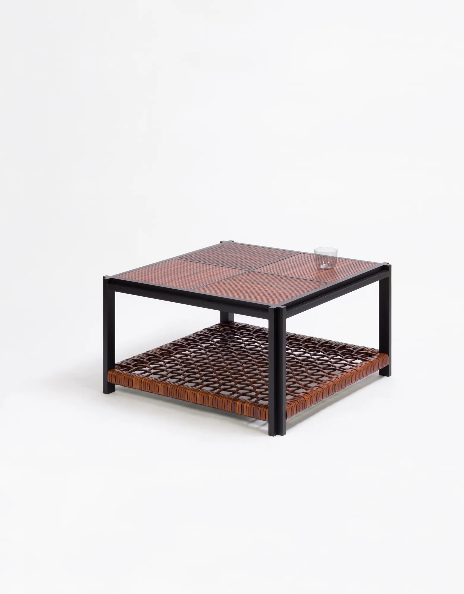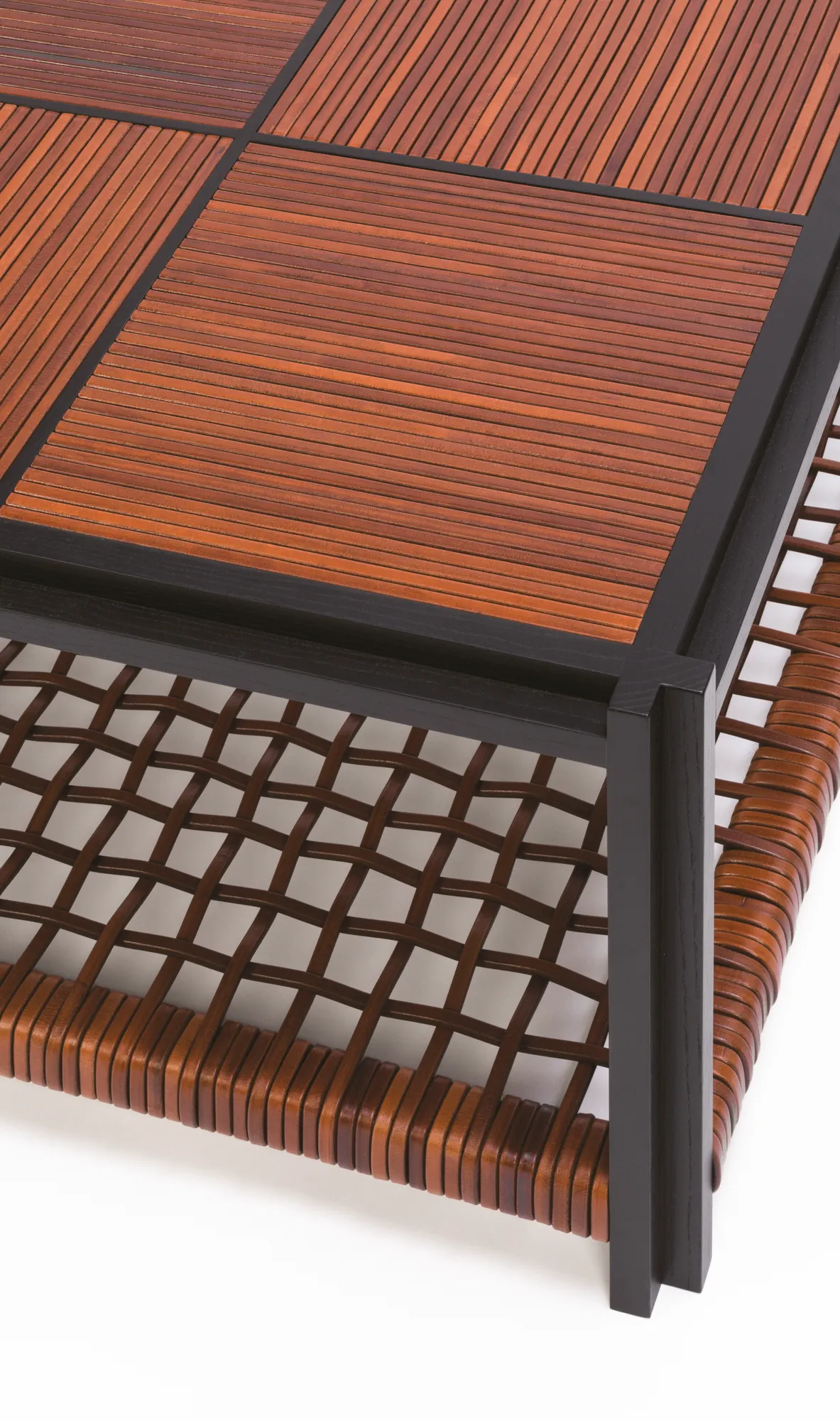 A collection of furnishing elements that features a crisscross leather pattern in brown (SL09) or black (SL20). The design is solid yet light in appearance. The material projects a vintage look that will age gracefully.