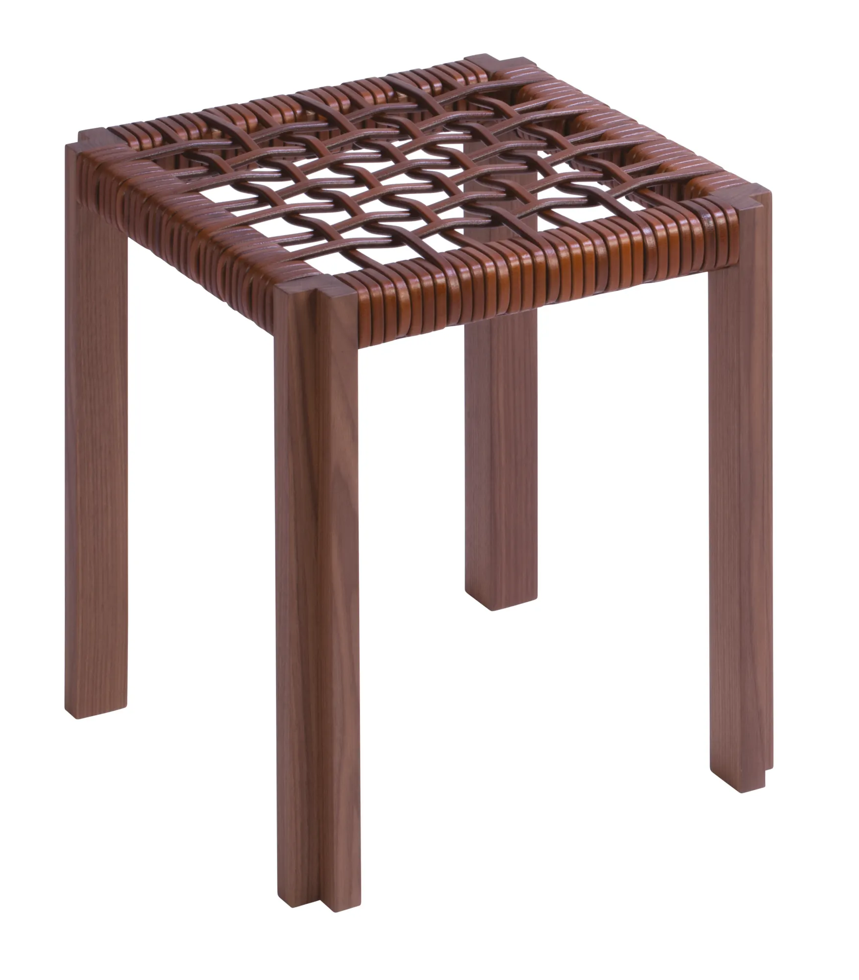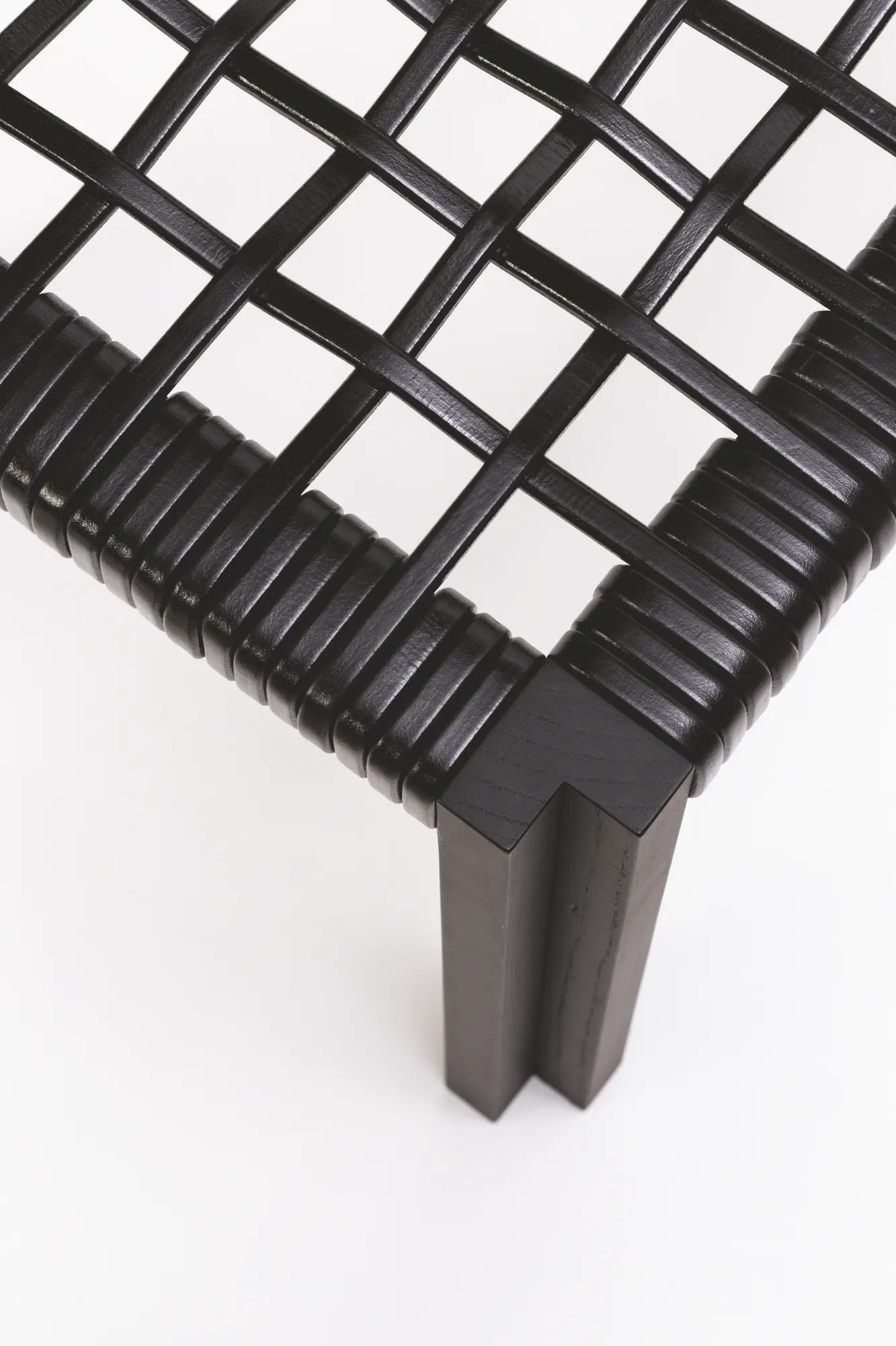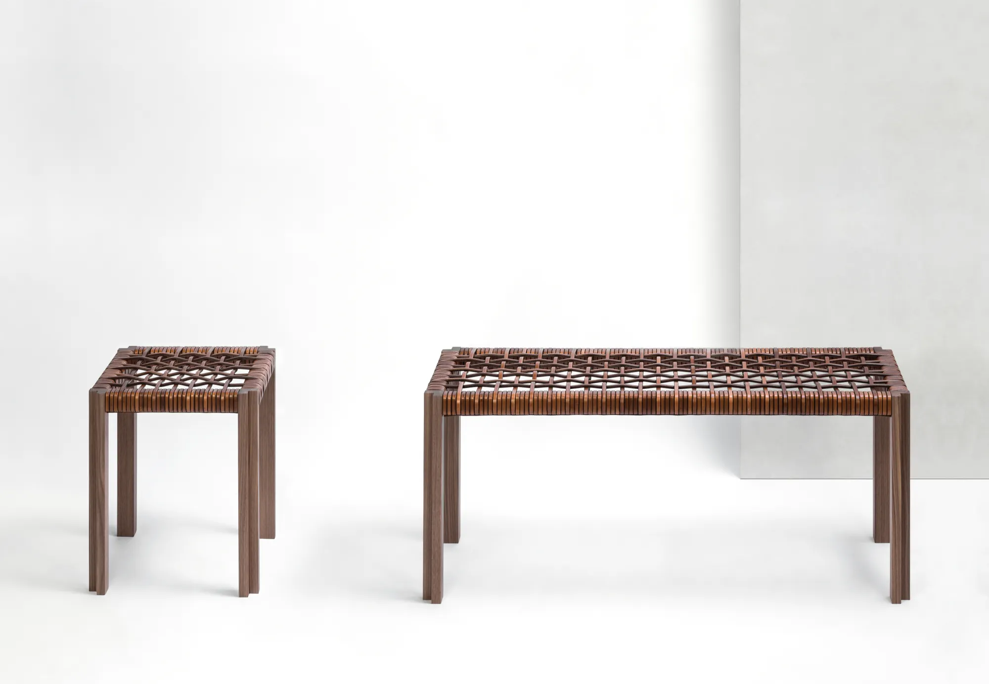A collection of furnishing elements that features a crisscross leather pattern in brown (SL09) or black (SL20). The design is solid yet light in appearance. The material projects a vintage look that will age gracefully.