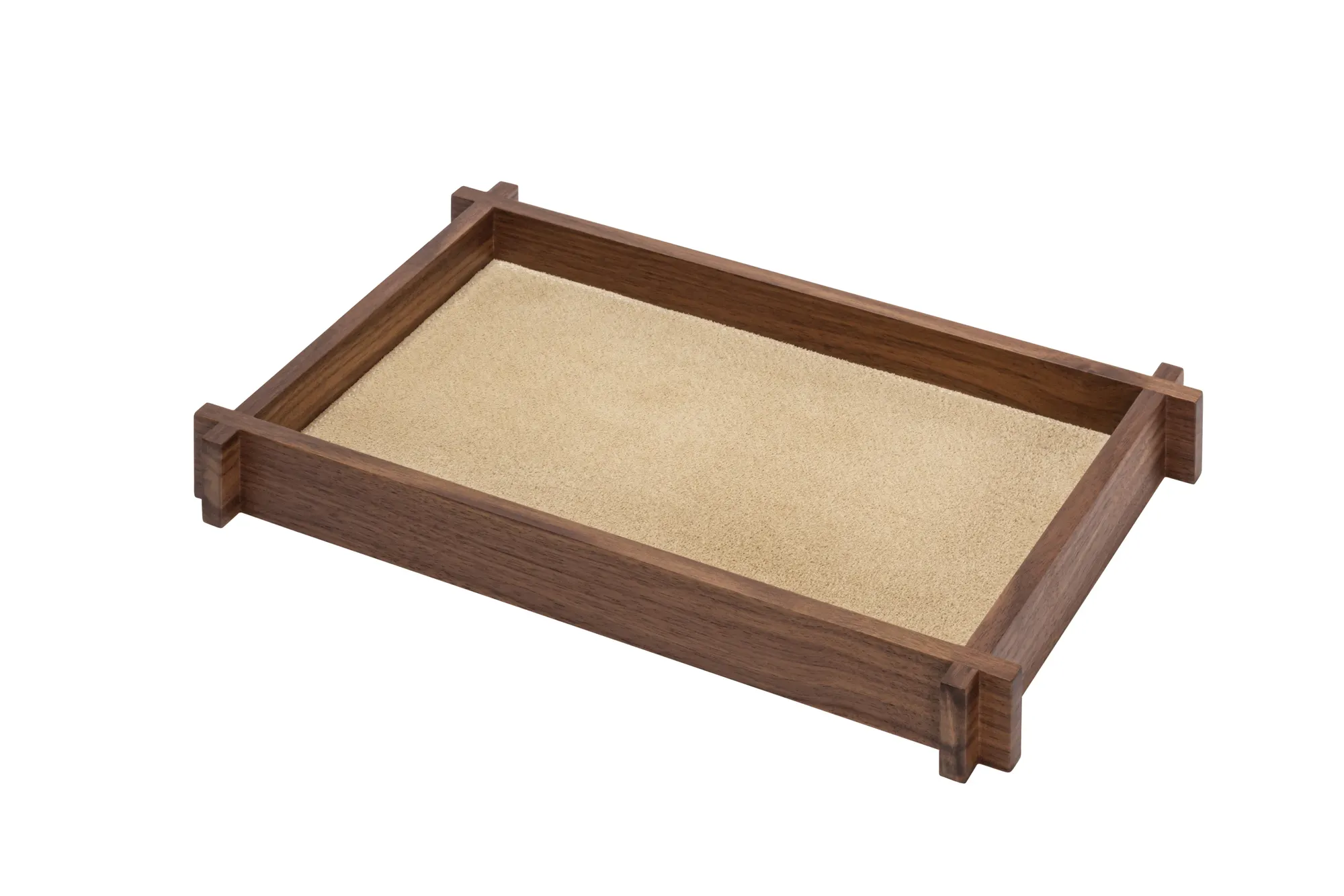 With their minimal formal line enhanced by distinctive 'L' shaped corners, these valet trays are perfect accessories for any space. The combination of two precious natural materials, such as walnut wood and the finest Italian leather, generates a perfect aesthetic balance. Custom sizes available on request.