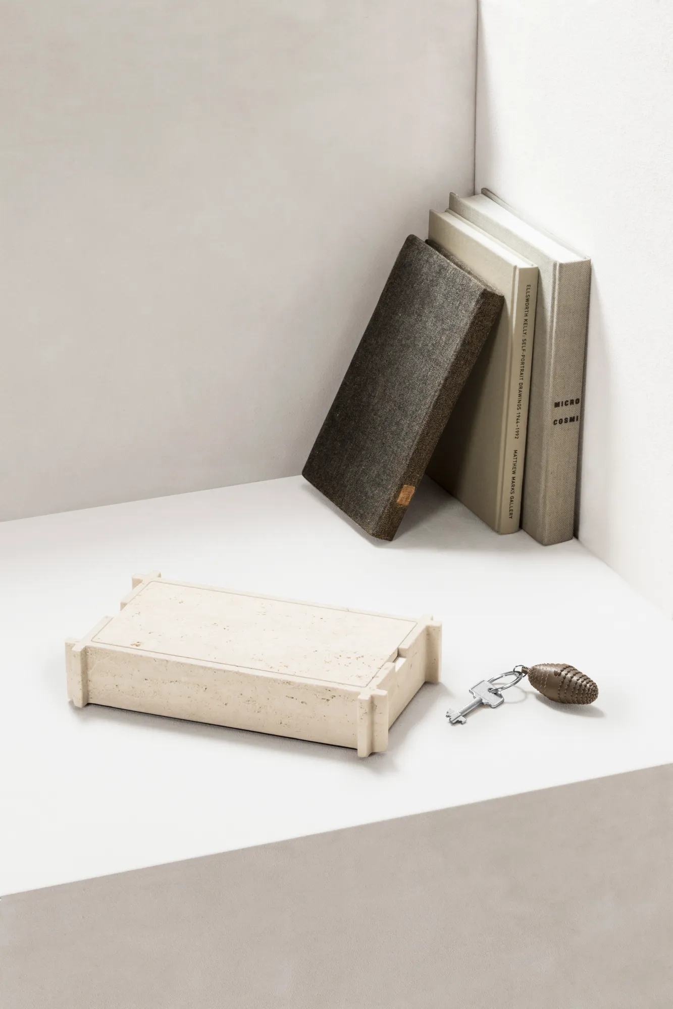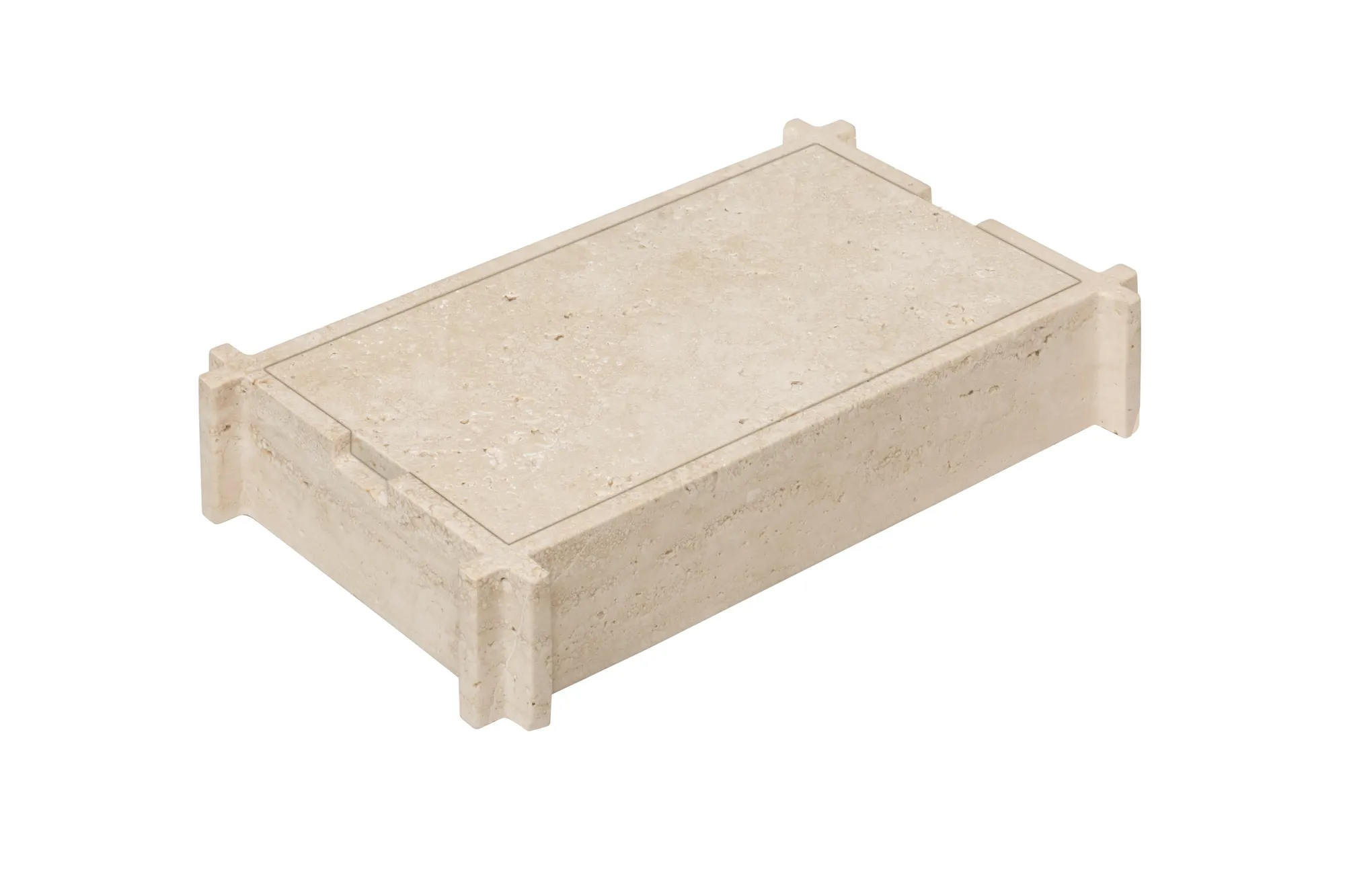 With their minimal formal line enhanced by distinctive "L" shaped corners, these boxes are perfect accessories for any space. The use of a precious natural material such as travertine generates unique texture contrasts and motifs. Custom sizes available on request.