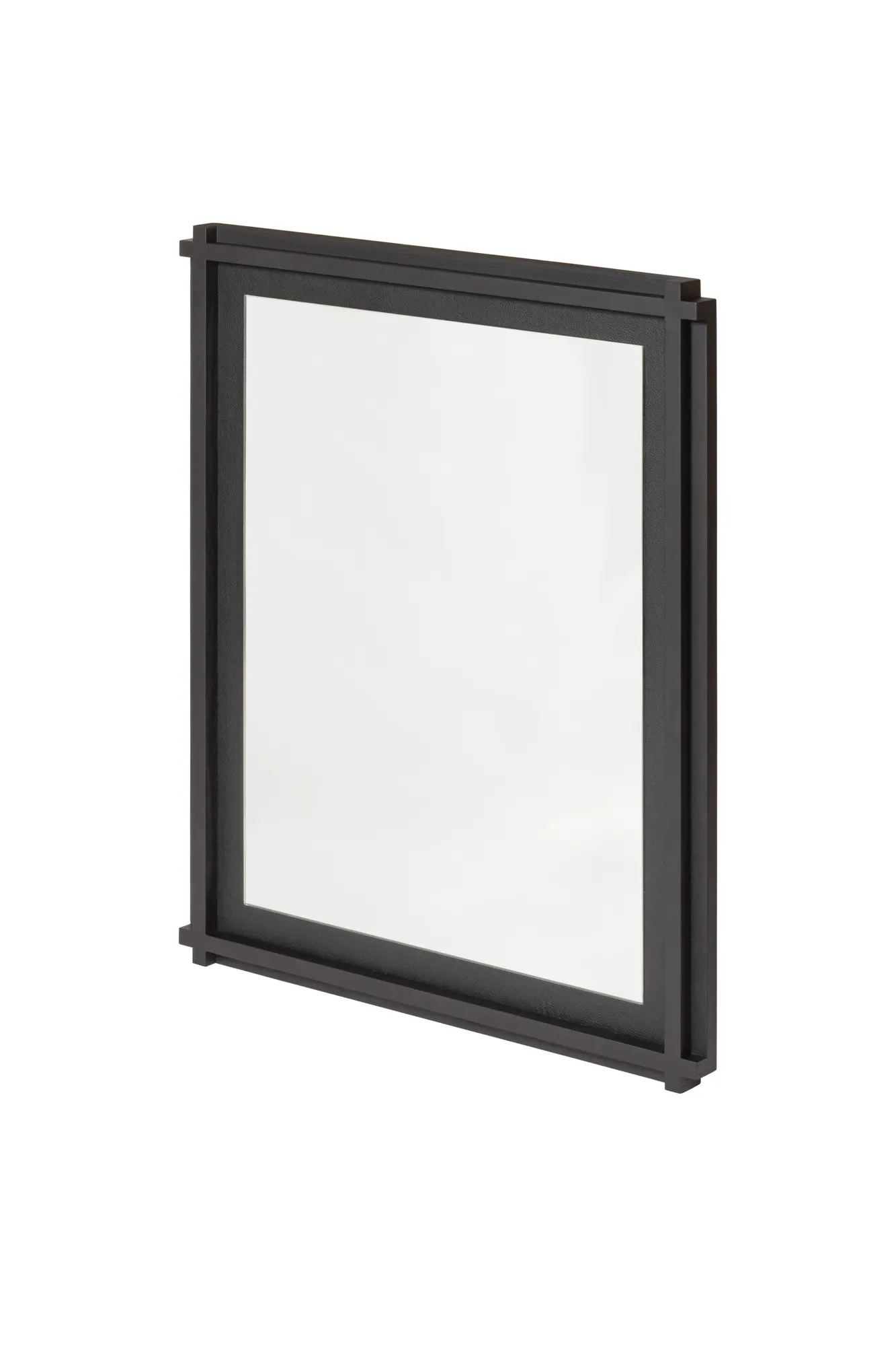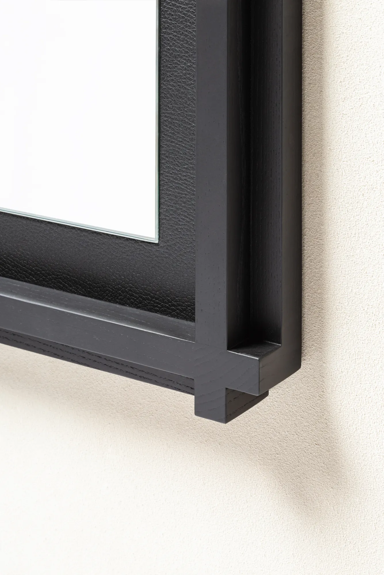 A collection of furniture that features a wooden structure in massif walnut or dark stained oak with an architectural shape and fine leather inserts. Custom sizes available on request.