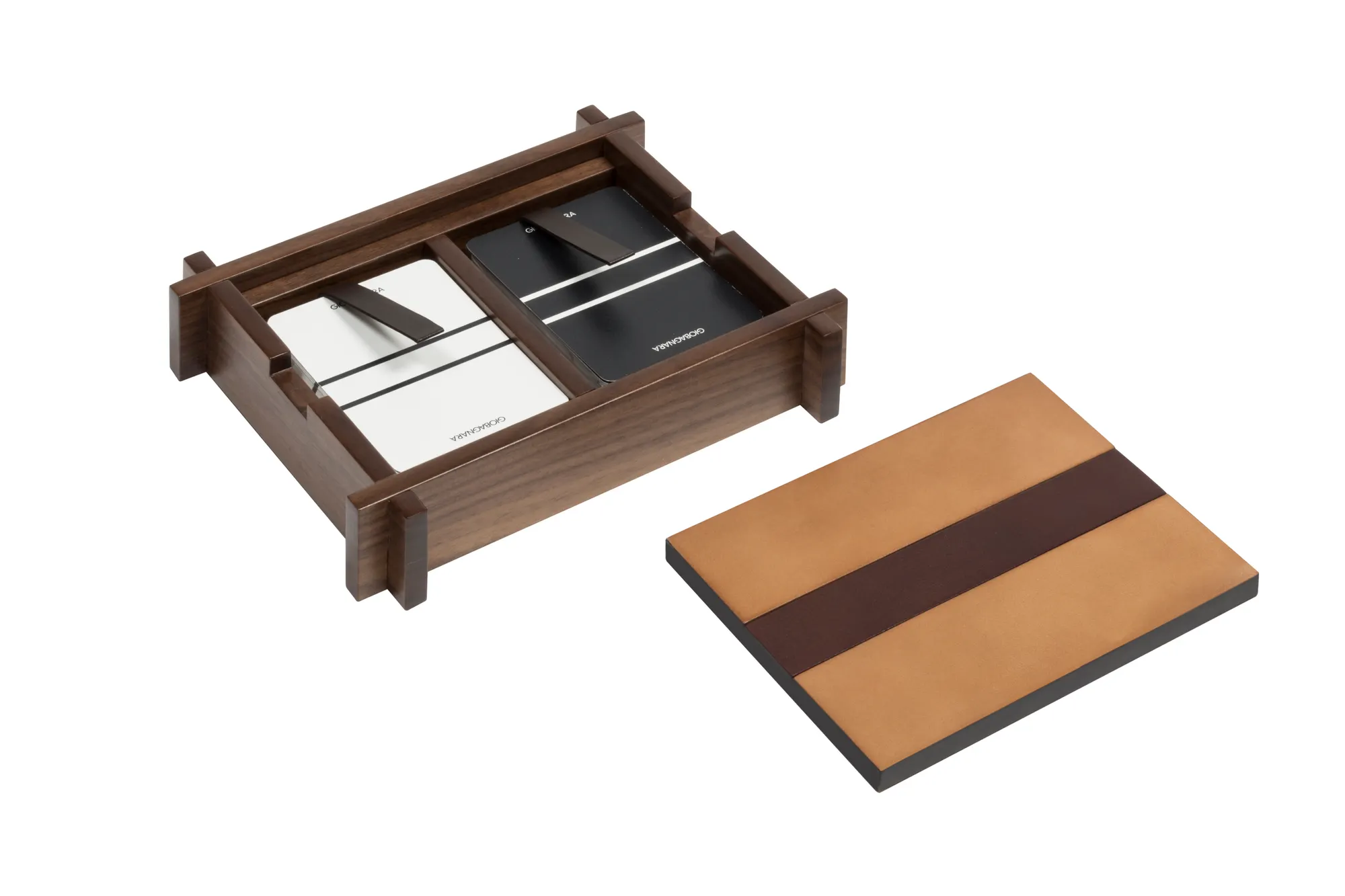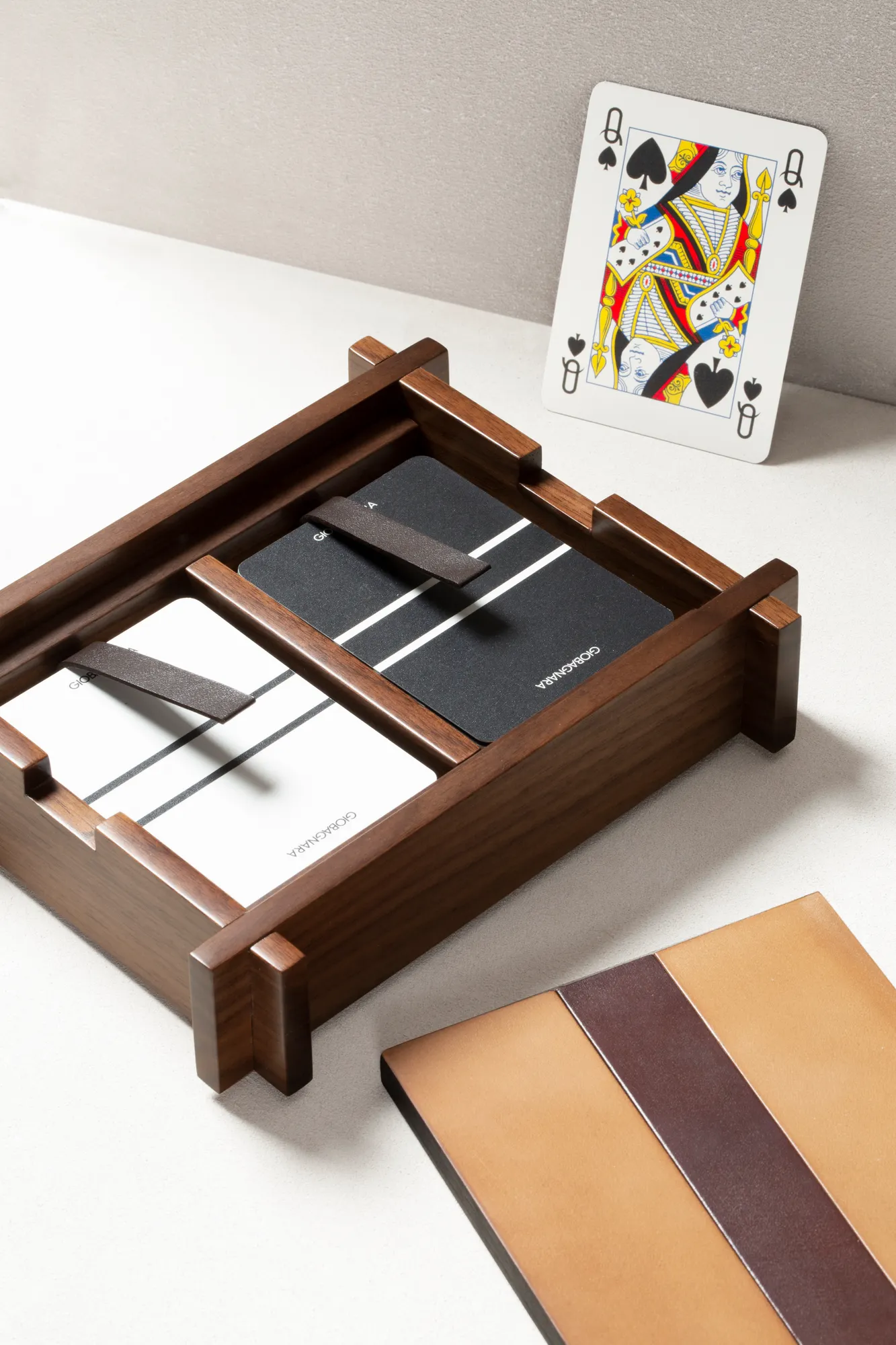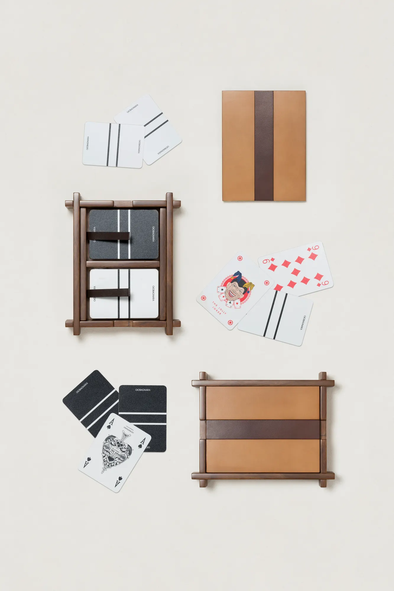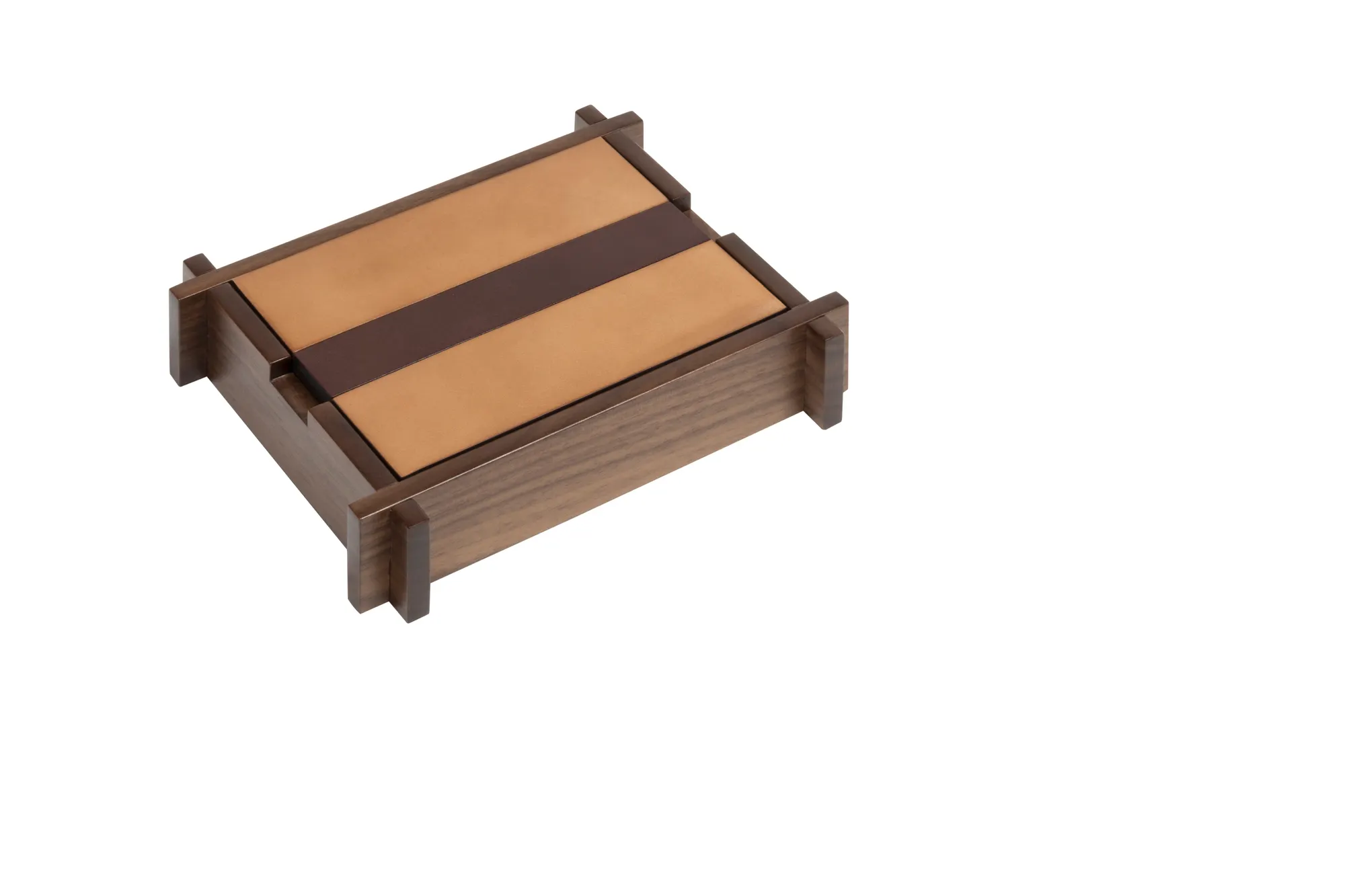 Walnut wood structure with sole leather cover featuring an engraved decorative stripe. The design is solid yet light in appearance, while the material projects a vintage look that will age gracefully.