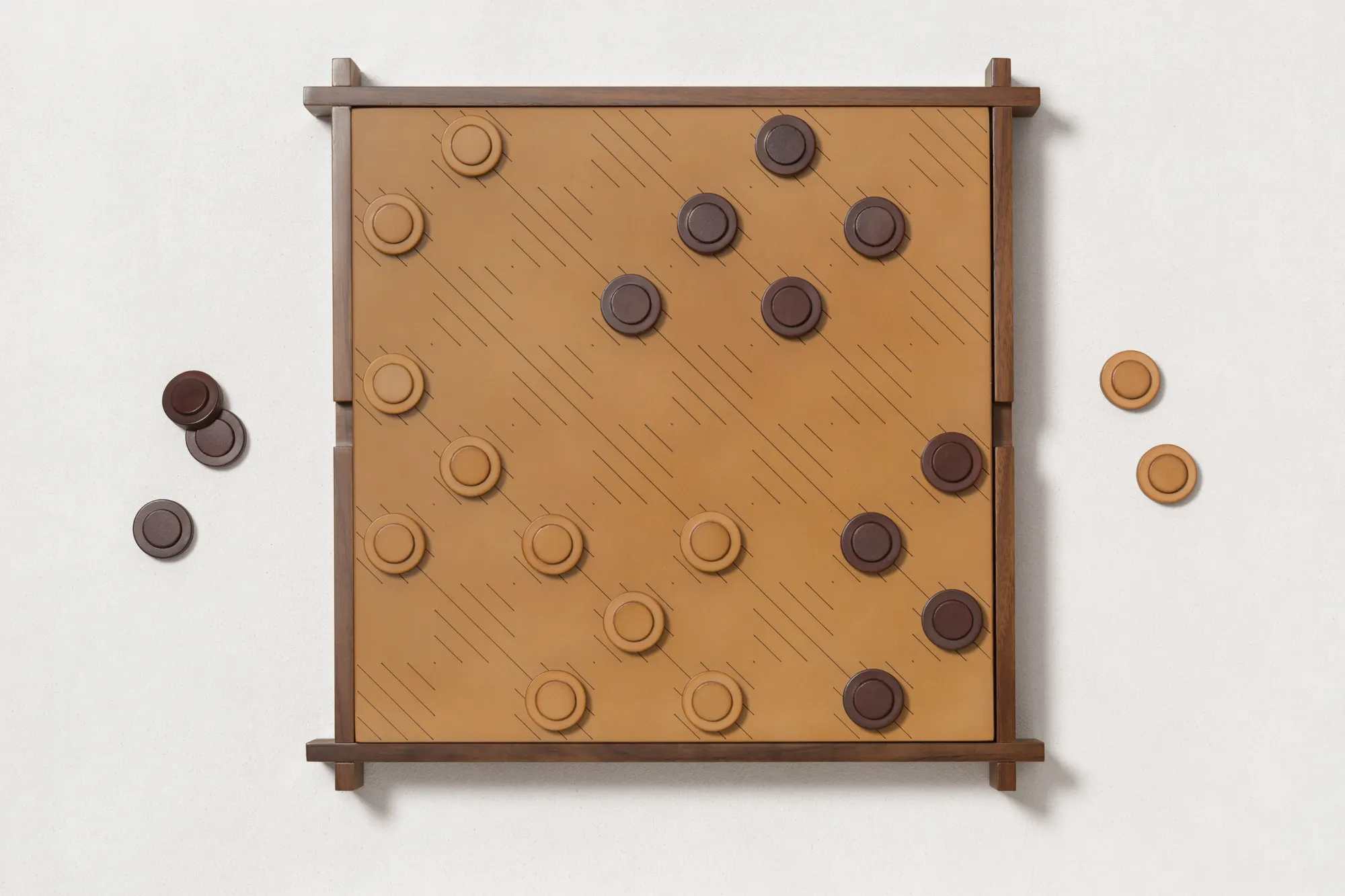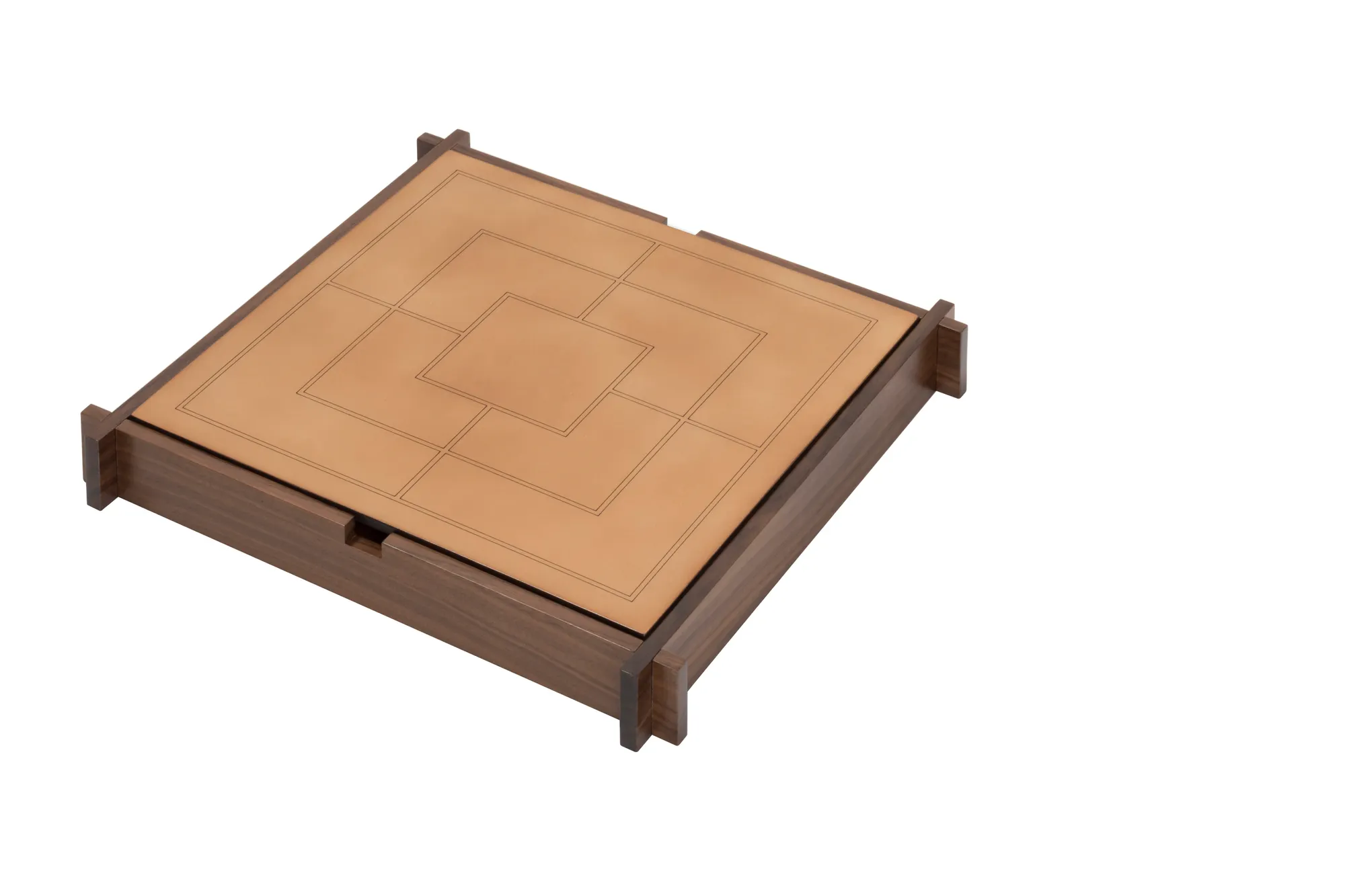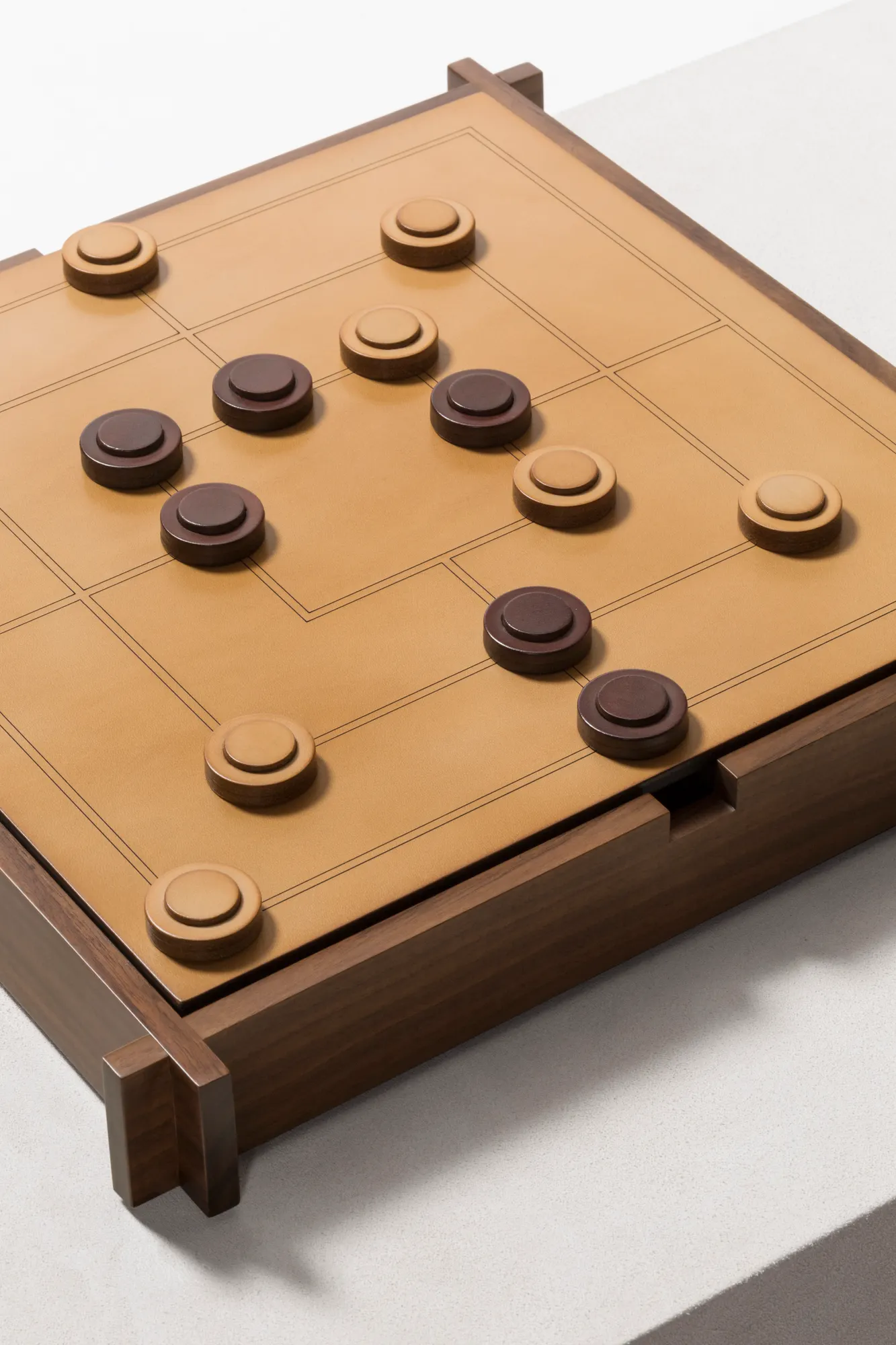 Walnut wood structure with sole leather cover featuring an engraved chess and draughts field on one side and a muehle field on the other. Includes sole leather chess and draughts made in brown (SL09) and natural (SL51) colors. The box features inner partitions to host the playing pawns. The design is solid yet light in appearance, while the material projects a vintage look that will age gracefully. Custom sizes available on request.