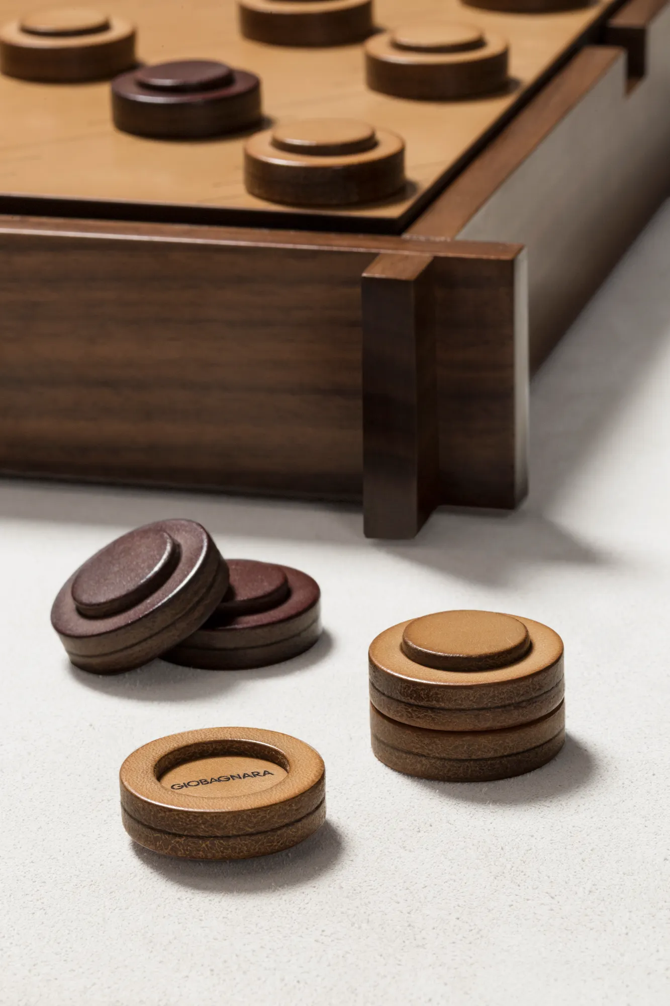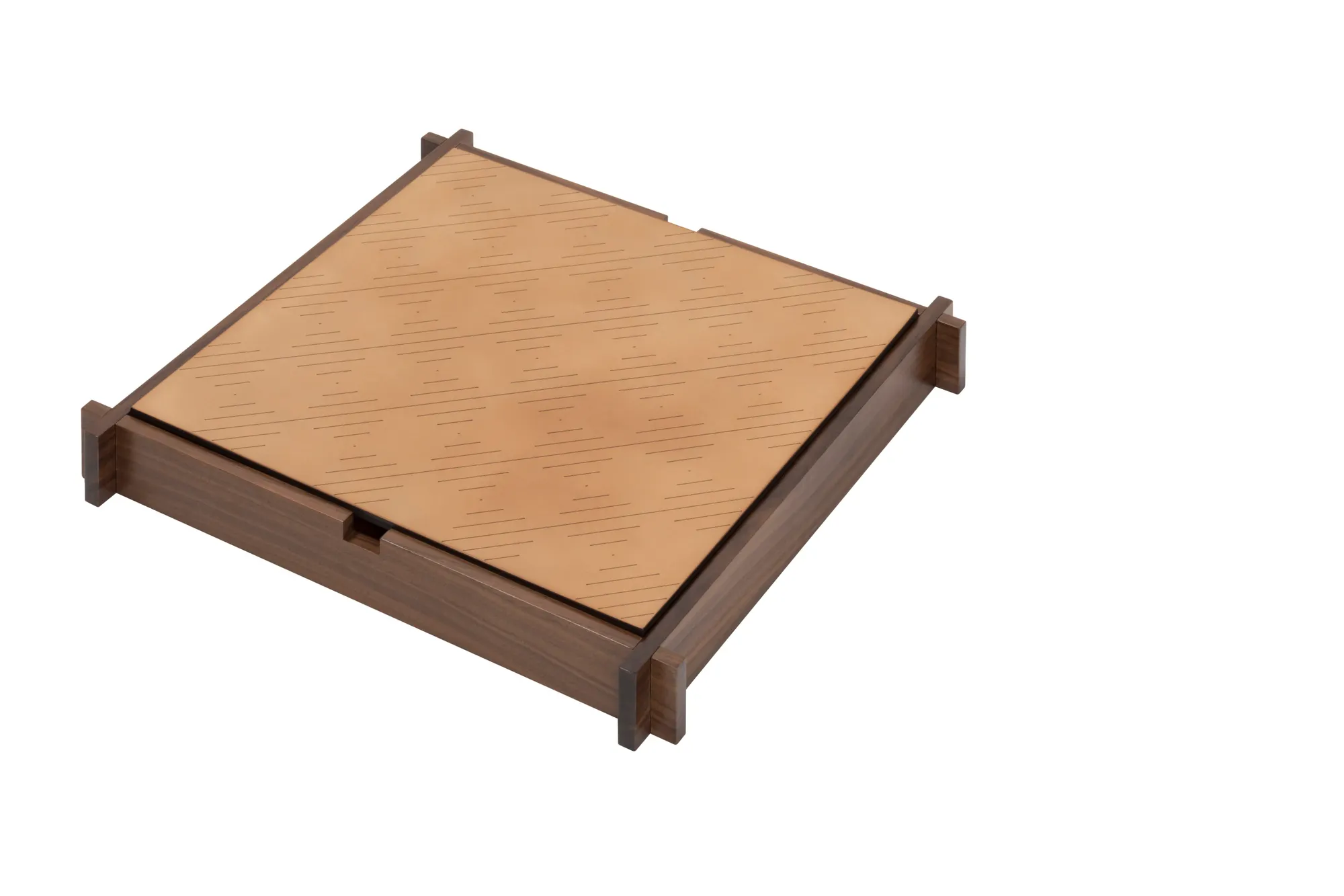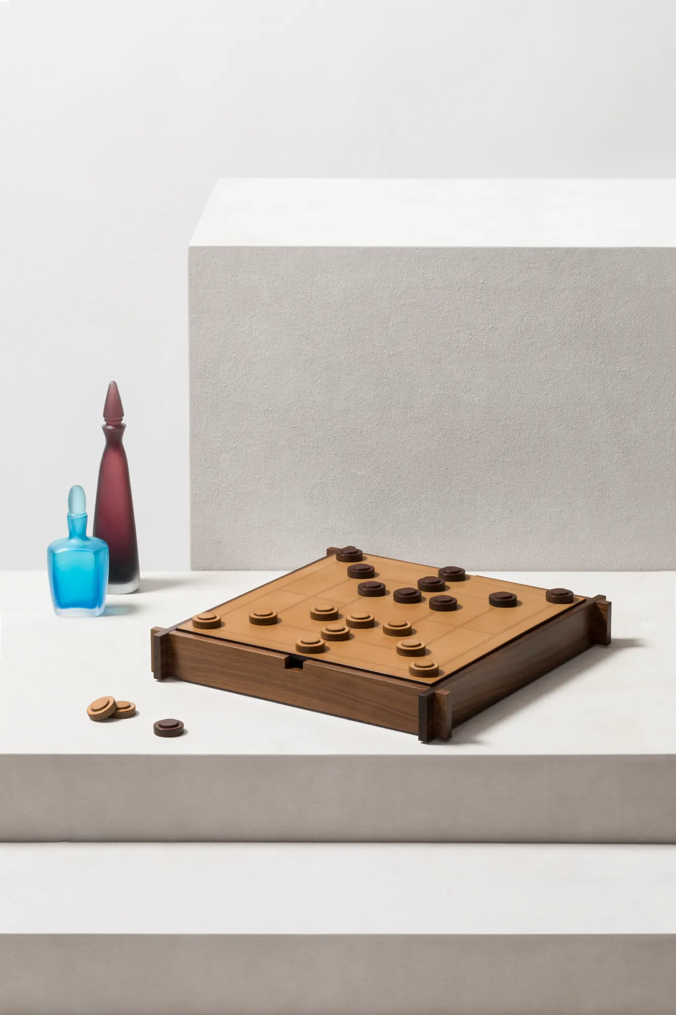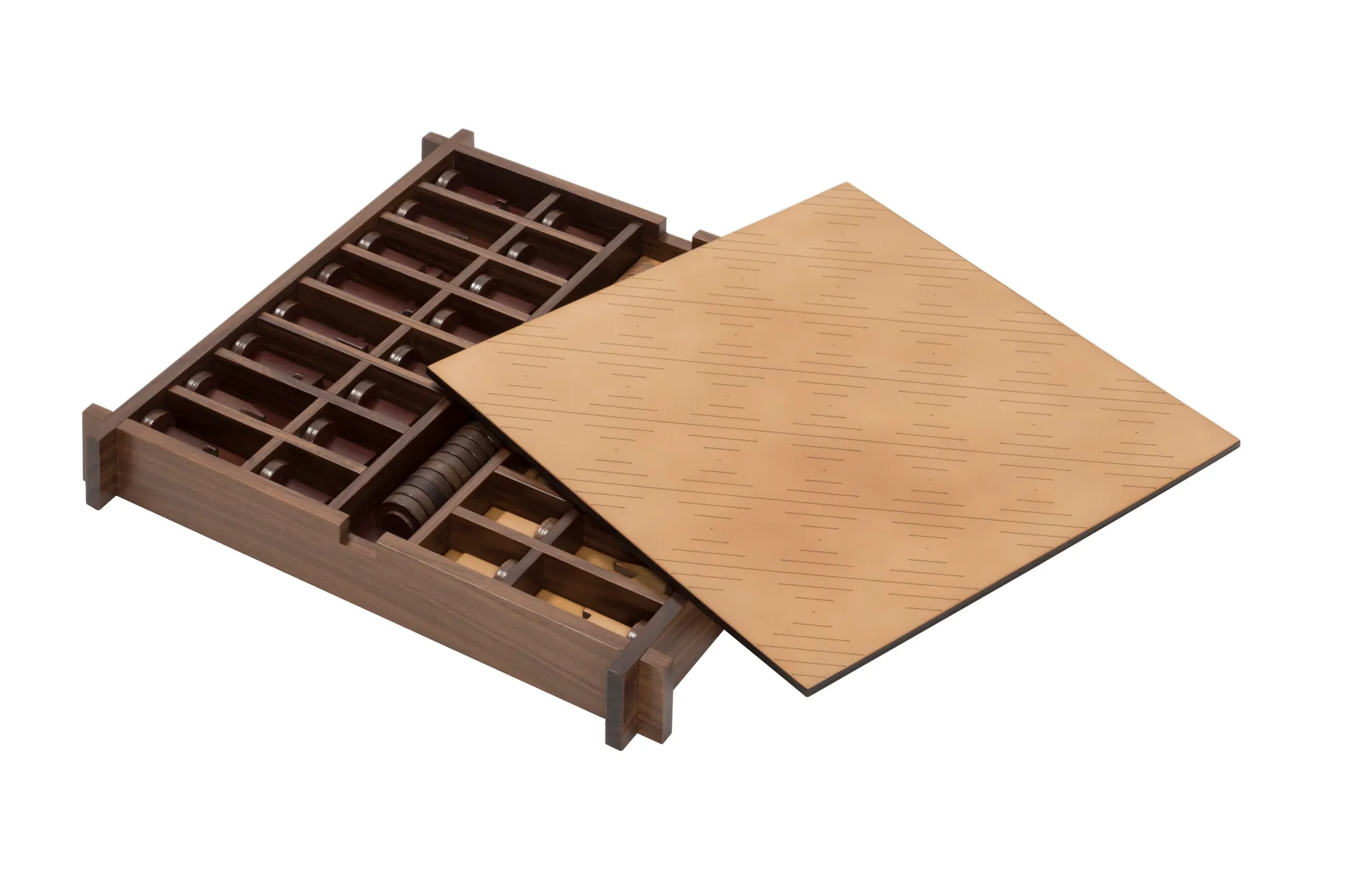 Walnut wood structure with sole leather cover featuring an engraved chess and draughts field on one side and a muehle field on the other. Includes sole leather chess and draughts made in brown (SL09) and natural (SL51) colors. The box features inner partitions to host the playing pawns. The design is solid yet light in appearance, while the material projects a vintage look that will age gracefully. Custom sizes available on request.