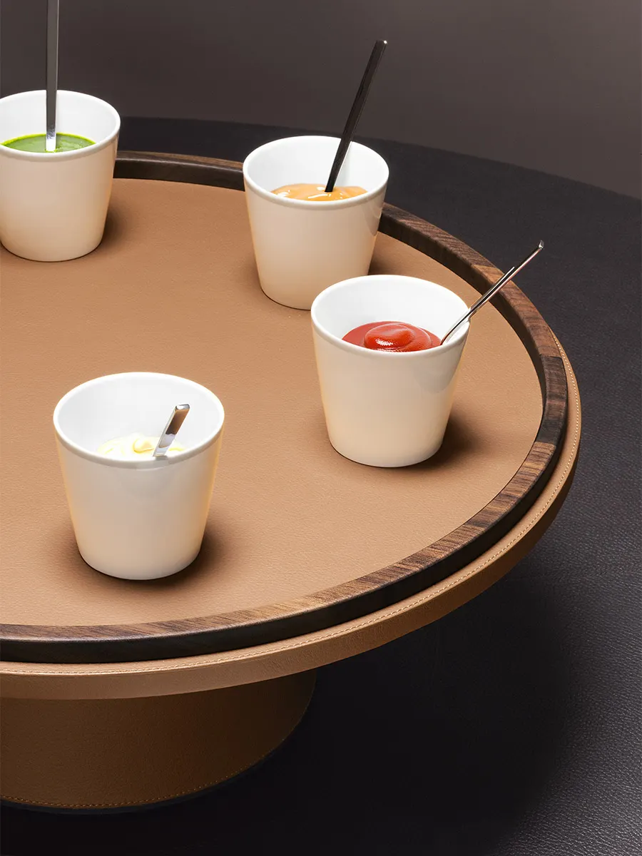 The Beautilities collections encompass everyday objects and accessories designed to enrich and enhance certain aspects of our lives, in all types of contexts and situations: the table, the office, outdoor spaces or our relationship with household pets. Small luxury items crafted to perfection in every detail that help lift our mood and make us feel good every time we see, touch, or simply walk past them. The Tableware Collection, created in cobranding with Giobagnara, is a family of coordinated dining table accessories, designed to add a sophisticated and precious touch to even the simplest dinner party. The collection offers a wide range of elegant and practical elements to enrich the social gathering, all upholstered in Pelle Frau® leather and meticulously handcrafted down to the finest of details. The Tableware Collection accessories evoke a warm and inviting atmosphere and a spirit of hospitality, reflecting thoughtfulness and consideration for others, enhancing the pleasure of every dining experience.