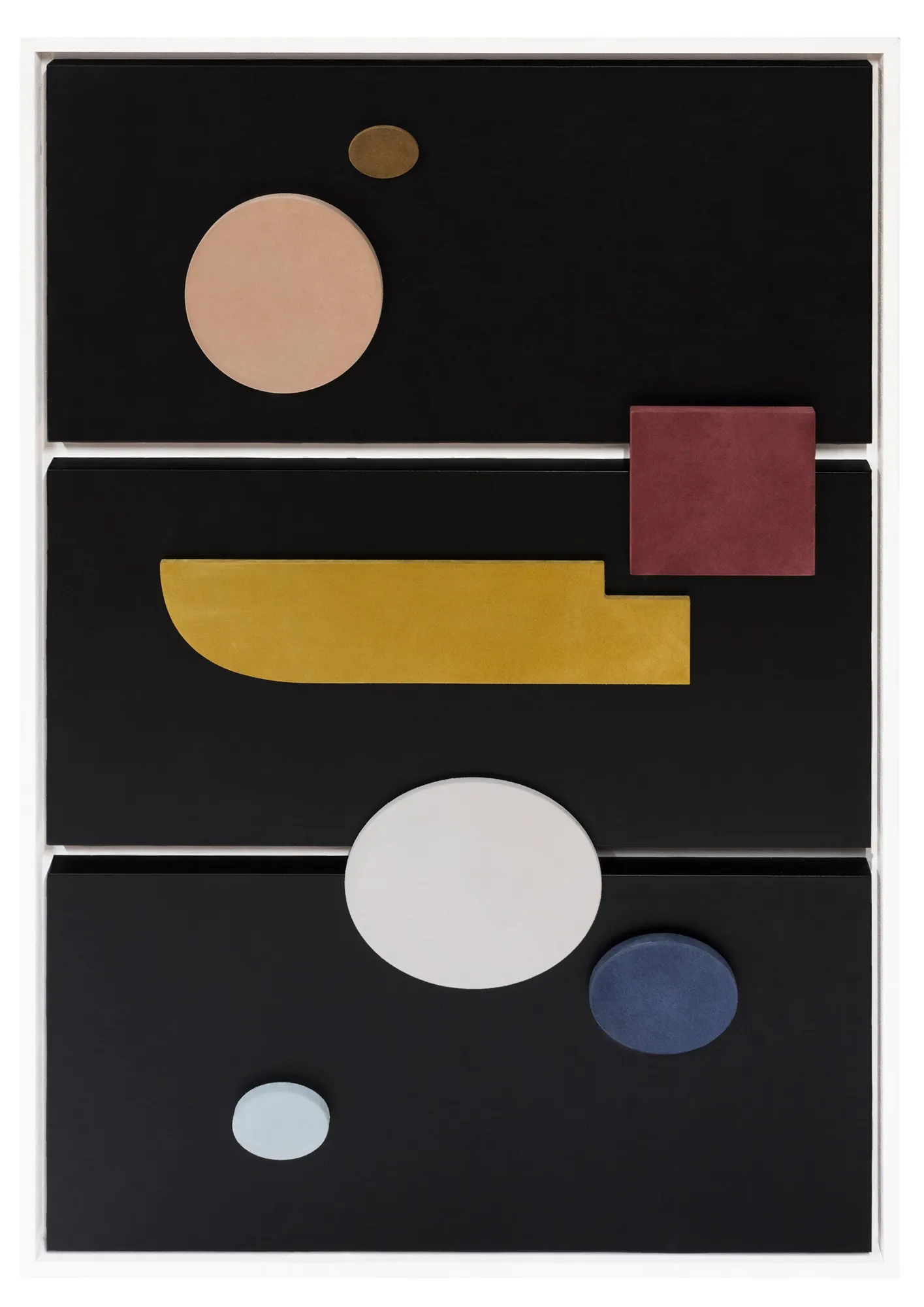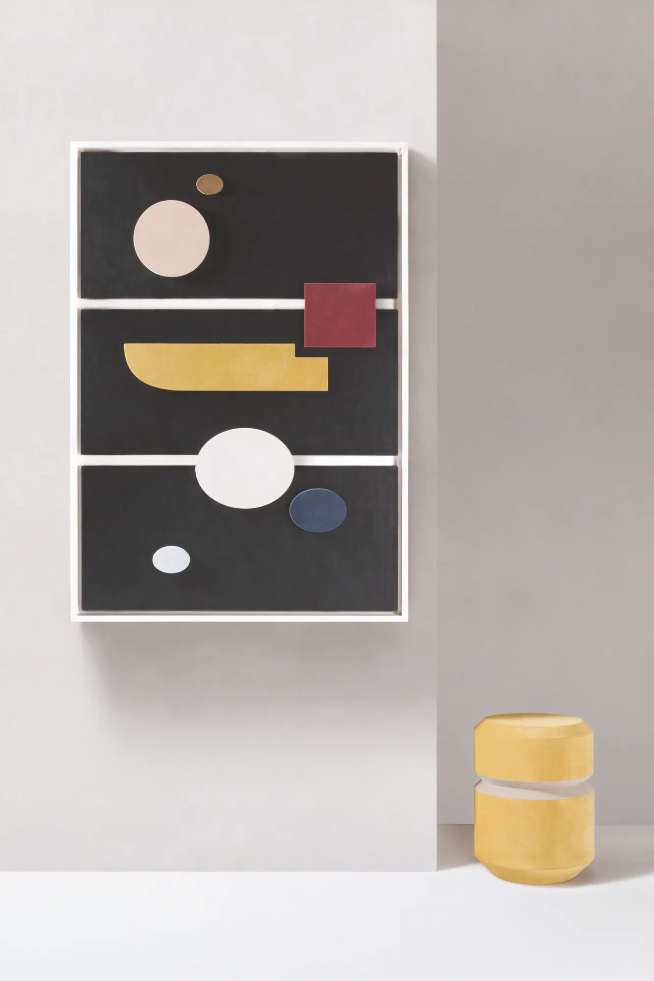 This leather-covered wood structure wall sculpture is framed in white suede. The interaction between colours and shapes makes it a decorative piece based on pure geometry, where abstraction and figuration create formal structures that allow colour to dominate. The fluid forms are covered in suede on a black nappa background.
