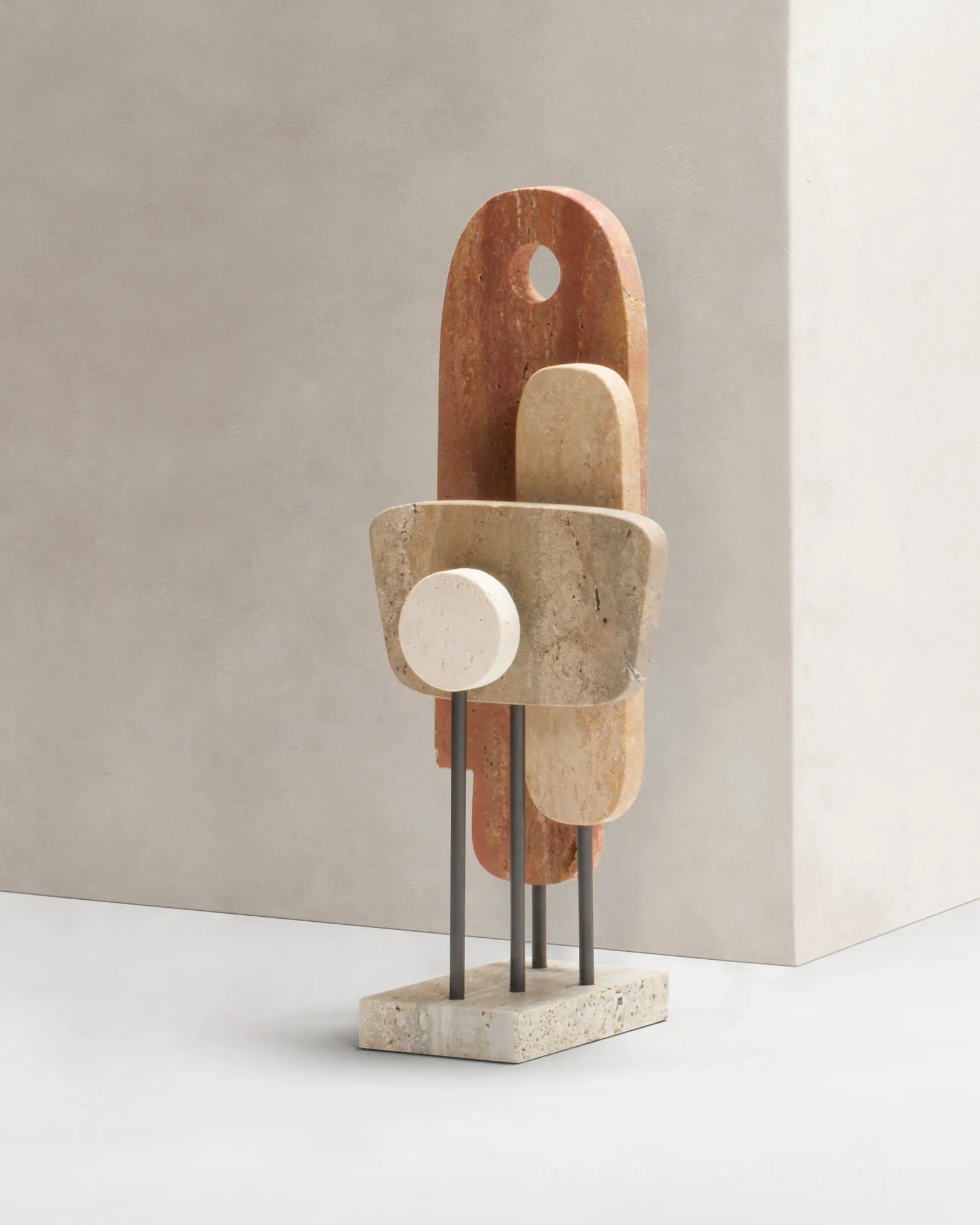 The Tabou collection's statement pieces are now declined in their all-travertine version, featuring a selection of elegant nuances. Marble shapes in 5 varieties of travertine and bronze sticks.