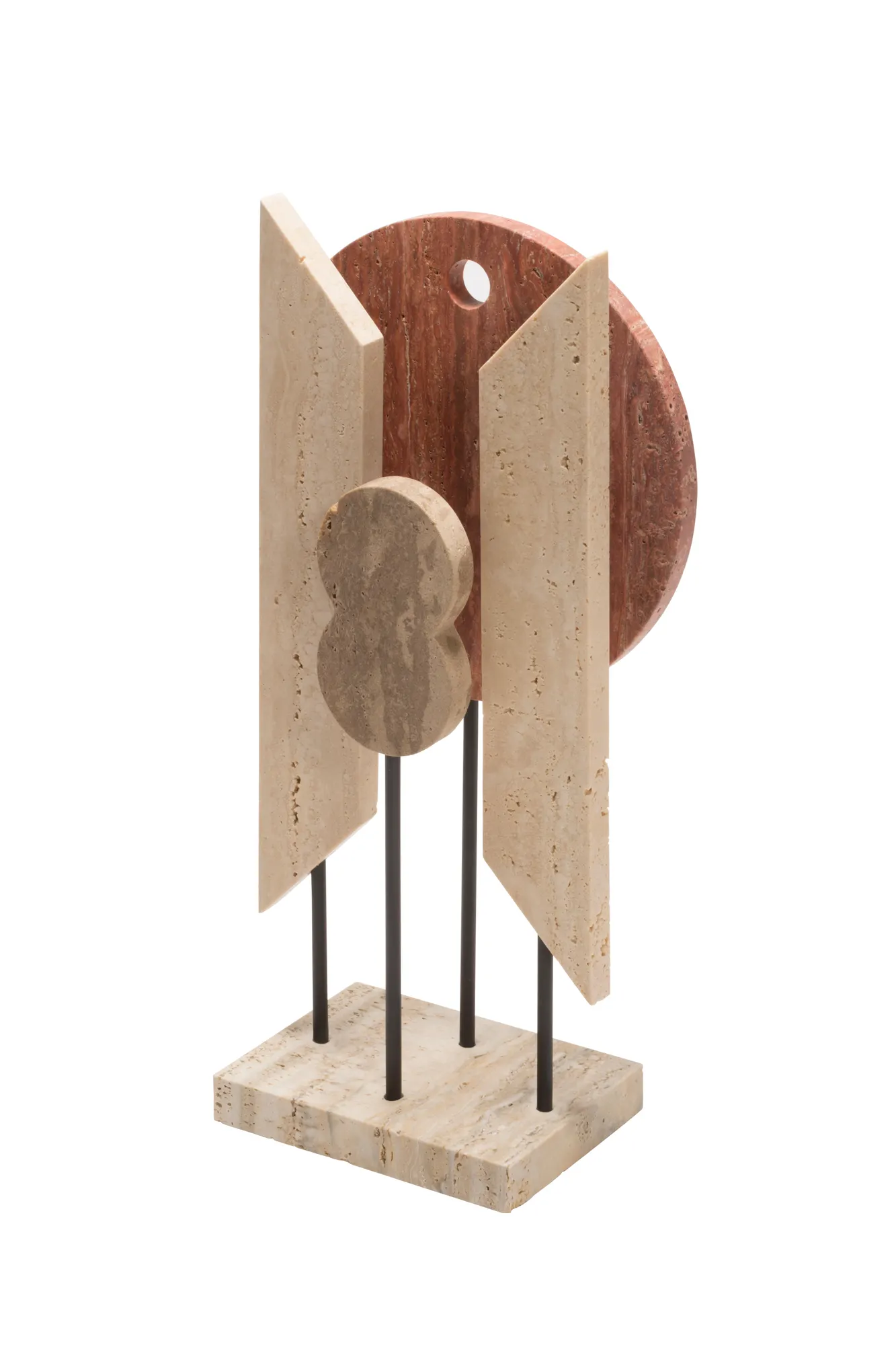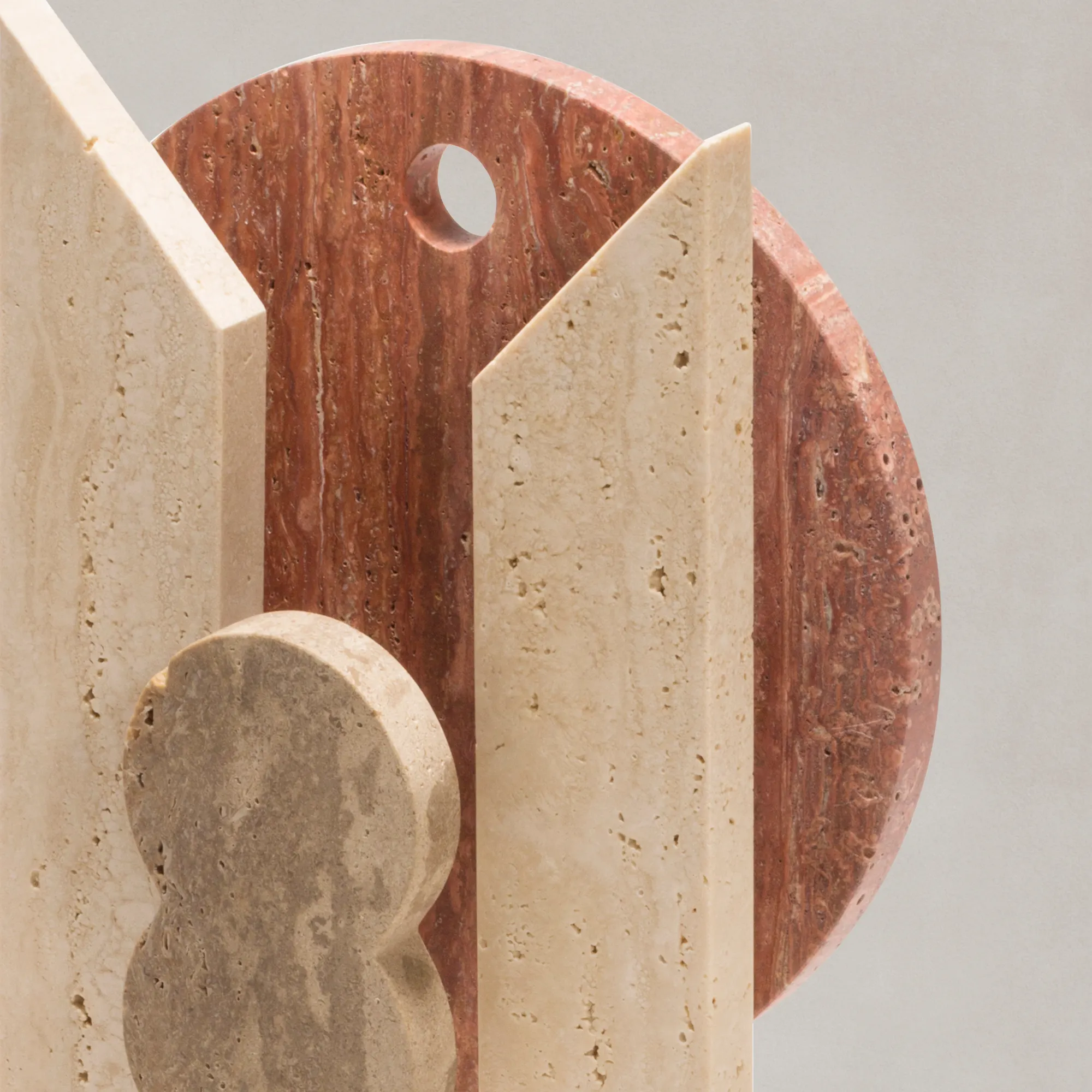 The Tabou collection's statement pieces are now declined in their all-travertine version, featuring a selection of elegant nuances. Marble shapes in 5 varieties of travertine and bronze sticks.