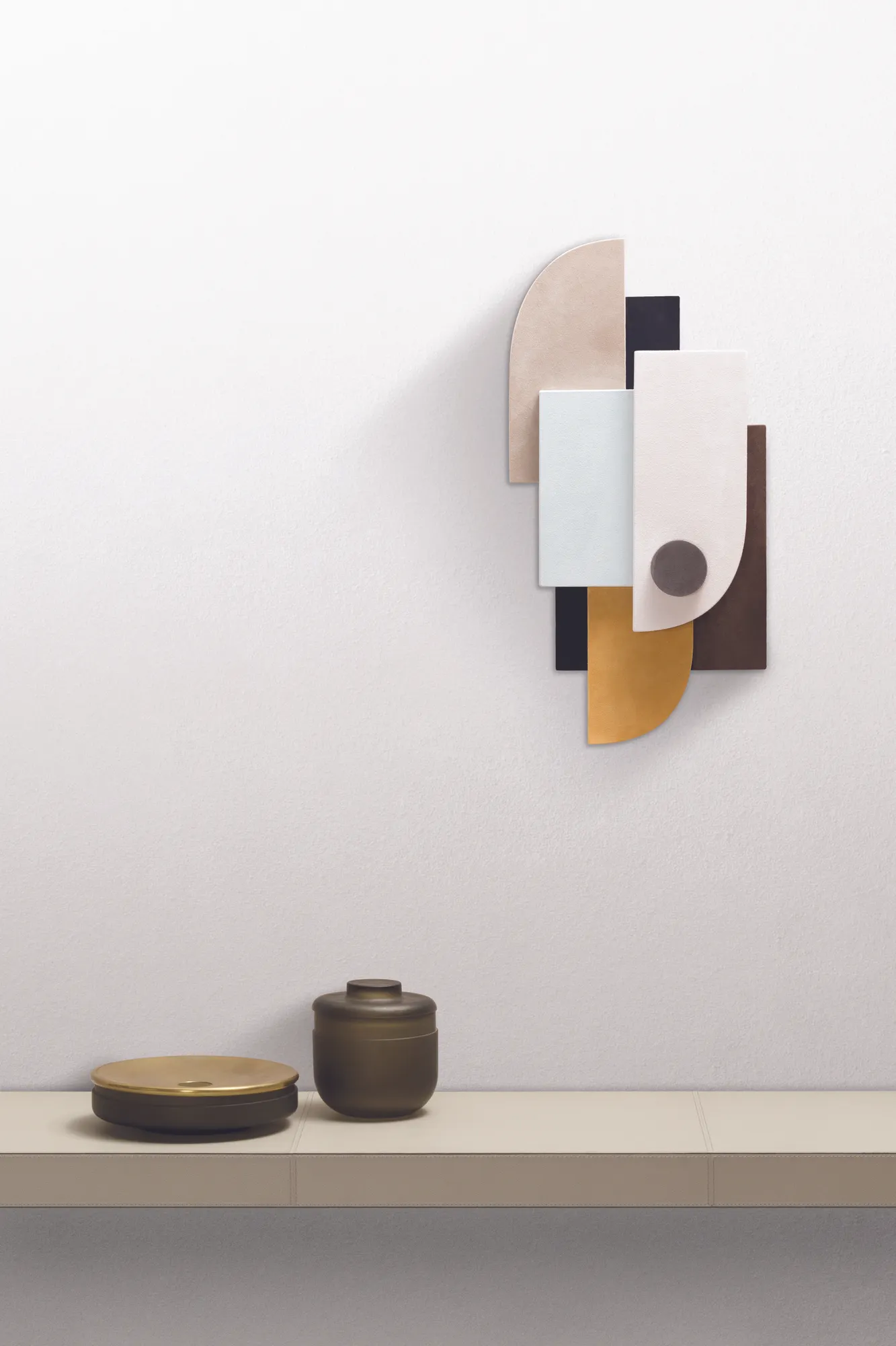 Almost like three-dimensional paintings, these artworks are great decorative pieces able to create a connection between abstraction and figuration. Suede-covered wood shapes.