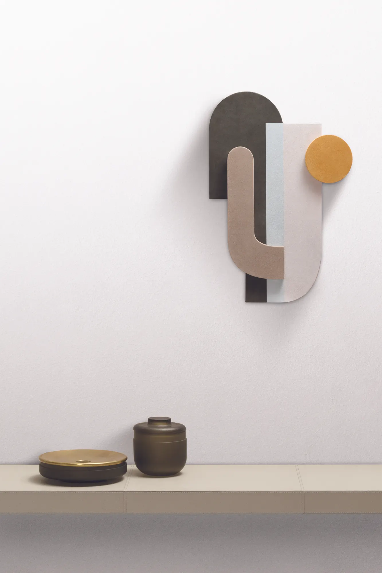 Almost like three-dimensional paintings, these artworks are great decorative pieces able to create a connection between abstraction and figuration. Suede-covered wood shapes.