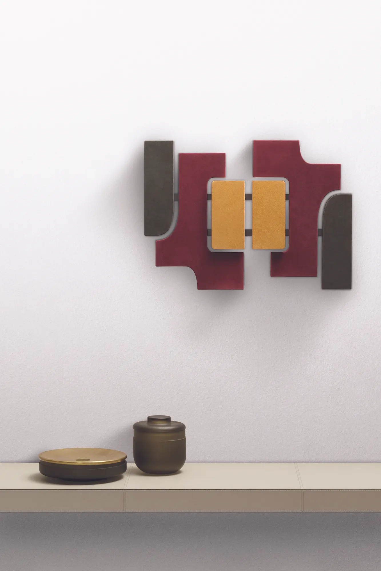 Almost like three-dimensional paintings, these artworks are great decorative pieces able to create a connection between abstraction and figuration. Suede-covered wood shapes and bronze inserts.