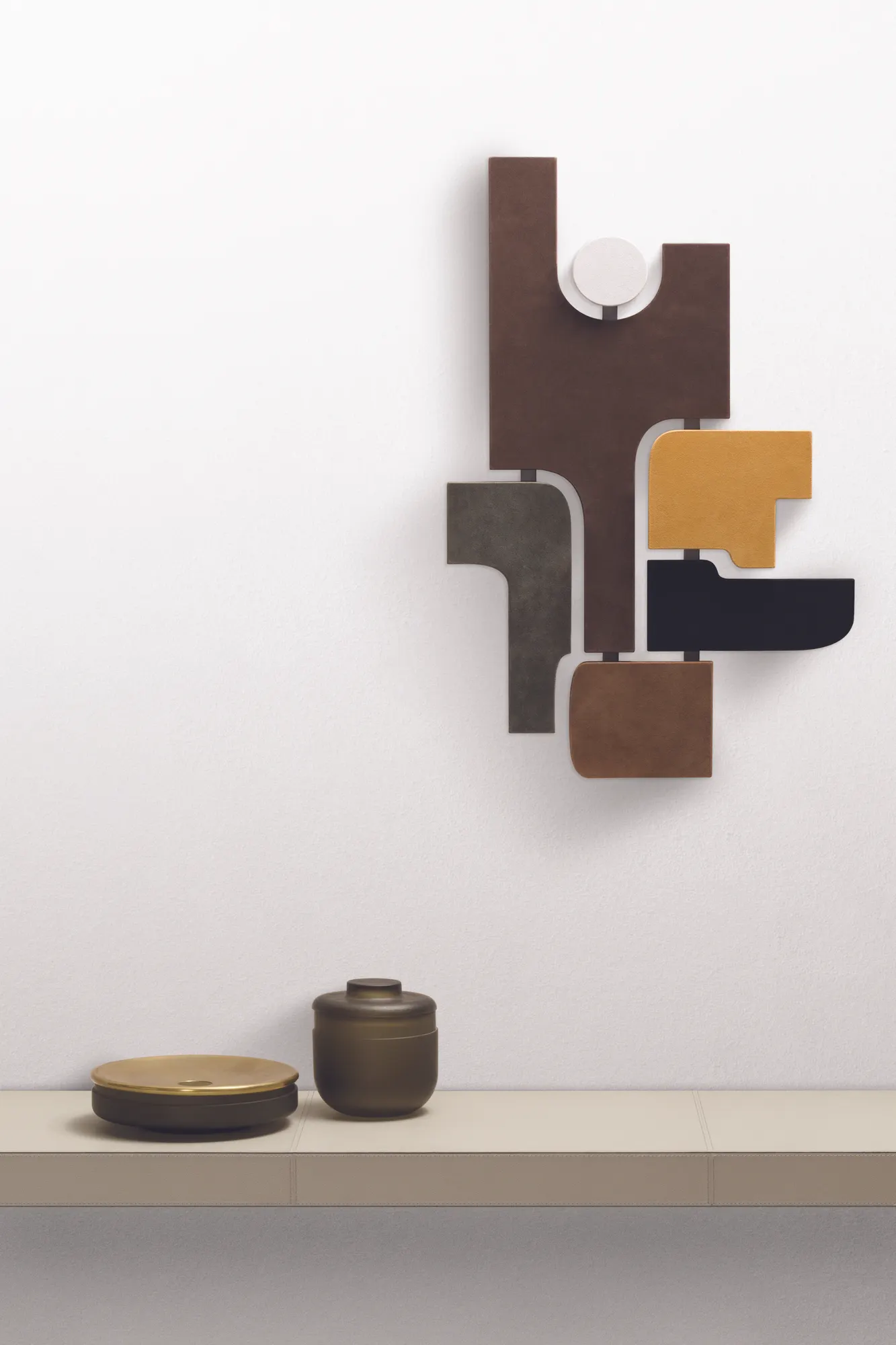 Almost like three-dimensional paintings, these artworks are great decorative pieces able to create a connection between abstraction and figuration. Suede-covered wood shapes and bronze inserts.