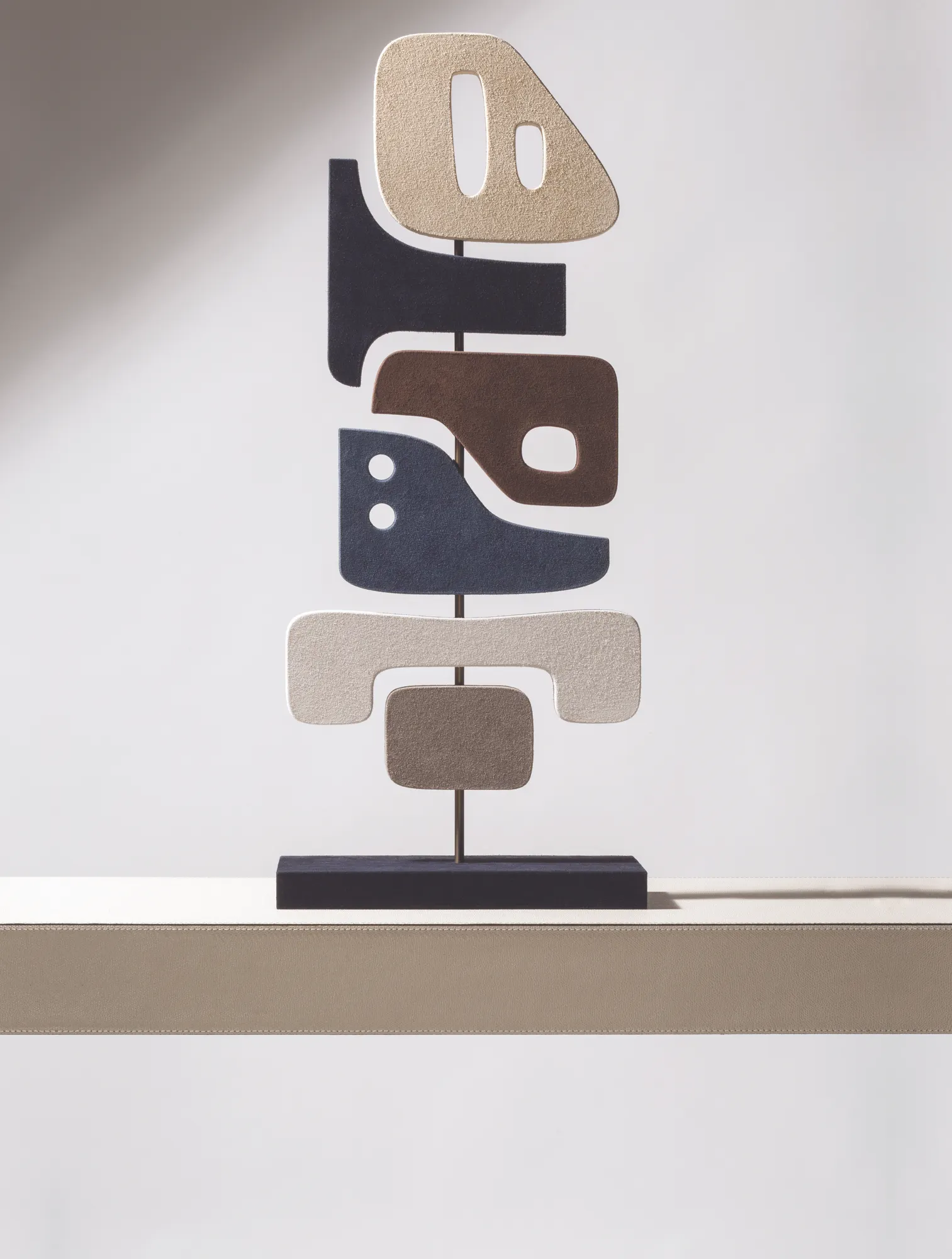 A mix of space-age design and tribal art, these contemporary totems are great decorative pieces able to create a connection between abstraction and figuration. Suede-covered wood shapes and bronze sticks.