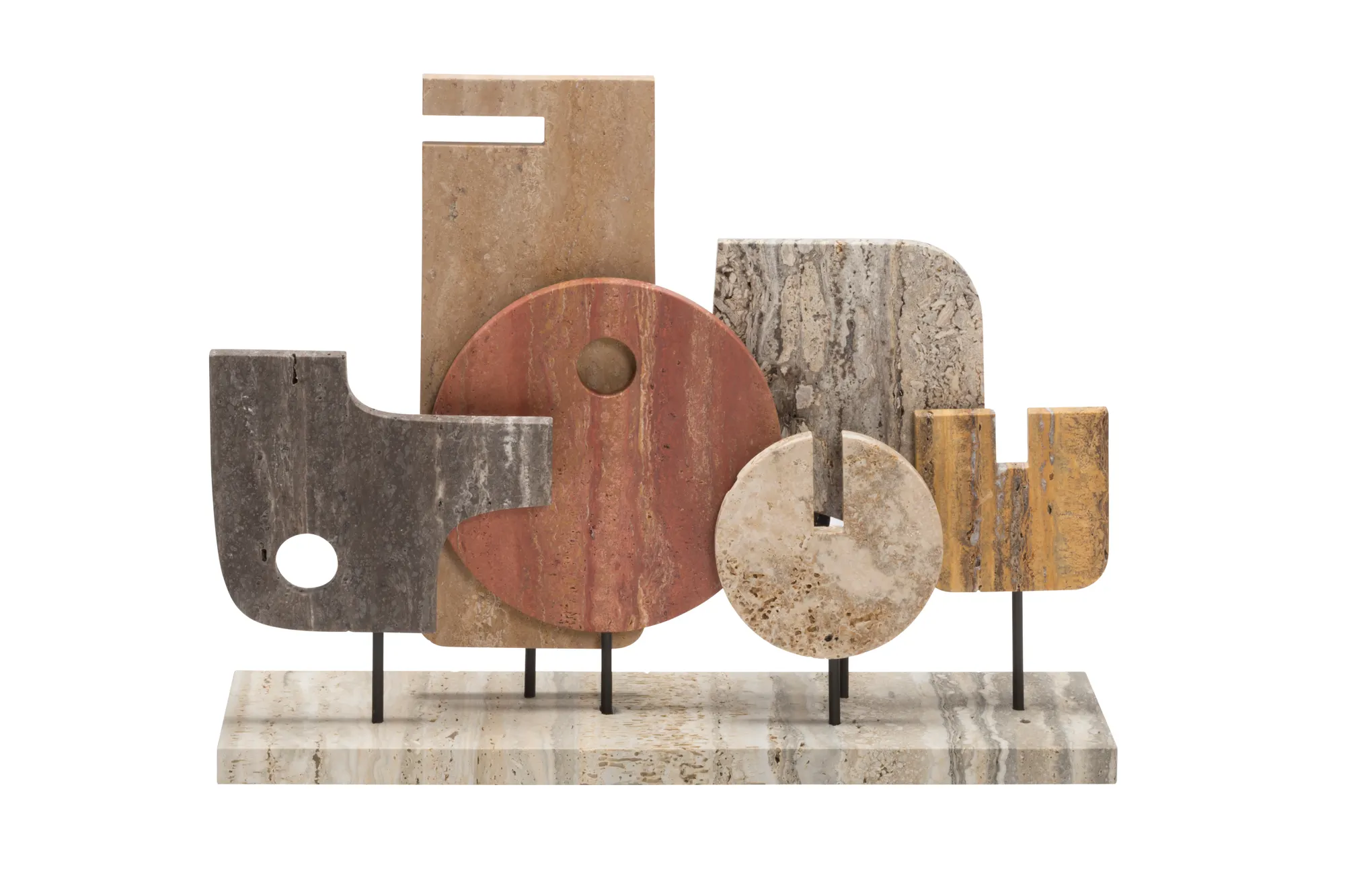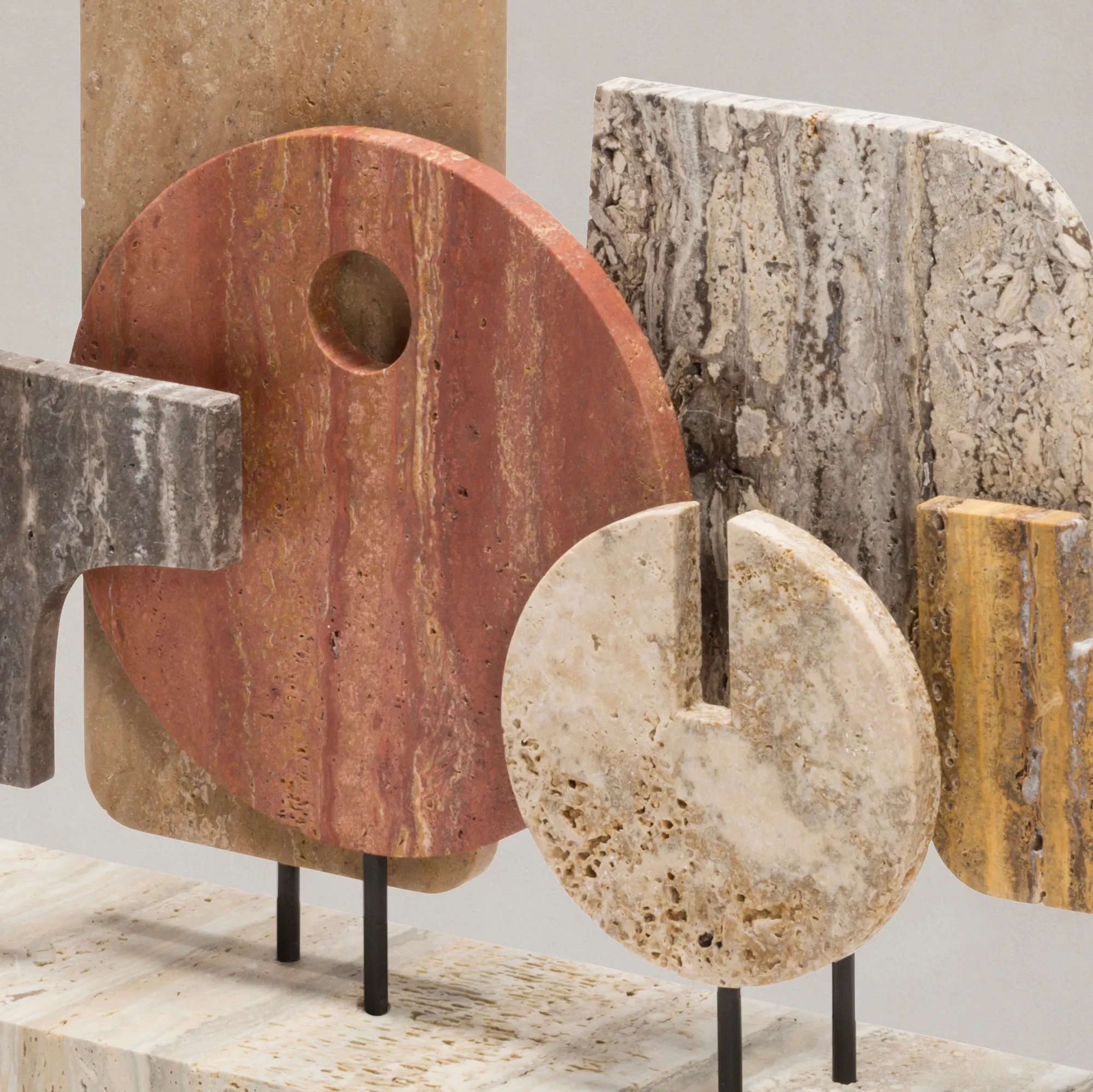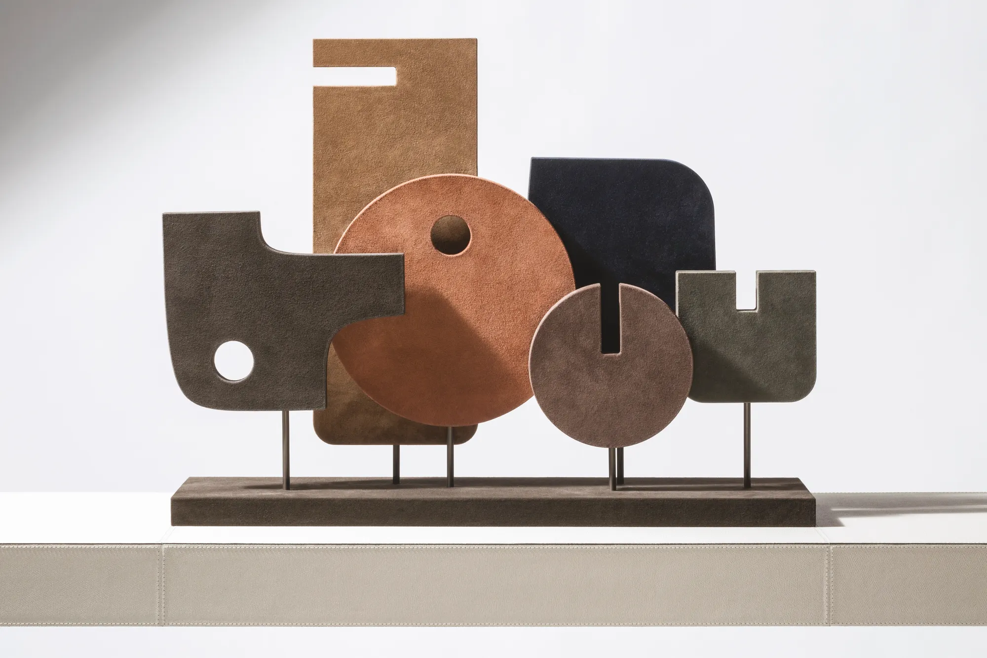 A mix of space-age design and tribal art, these contemporary totems are great decorative pieces able to create a connection between abstraction and figuration. Suede-covered wood shapes and bronze sticks.