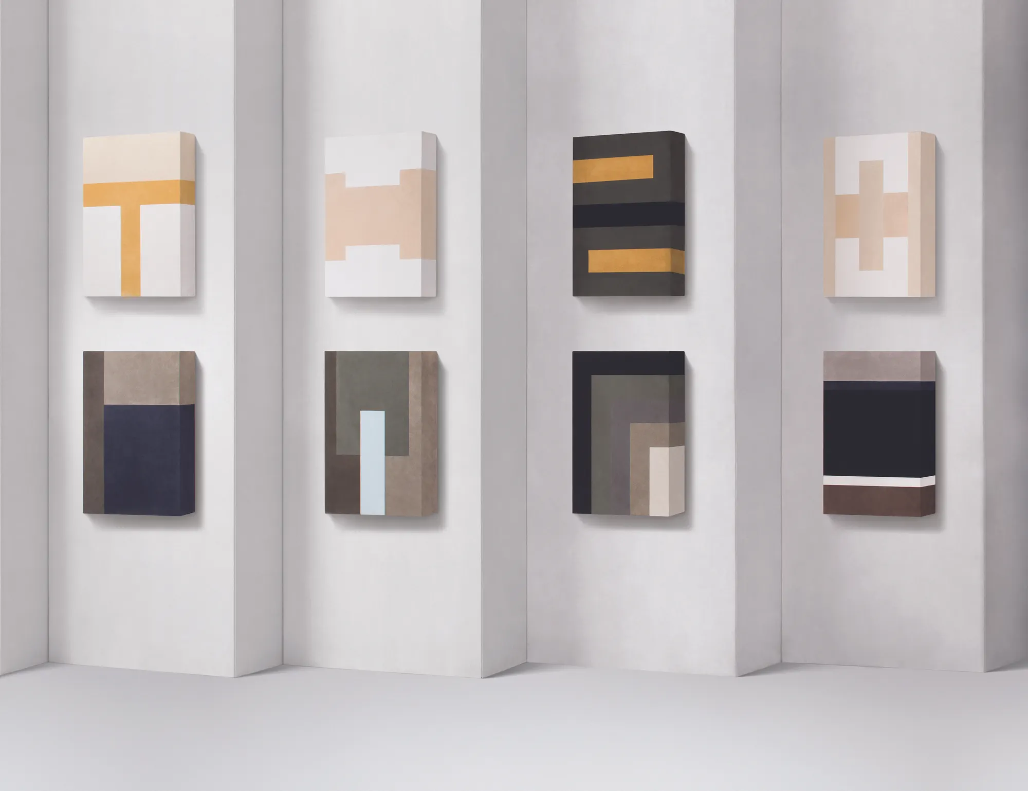 Hung on a wall like paintings or used as decorative elements on a shelf, these three-dimensional units covered in suede, used individually or in multiple compositions, create a connection between the minimalist sculptures by Donald Judd and the graphic geometries of Ettore Sottsass. Leather-covered wood structure.