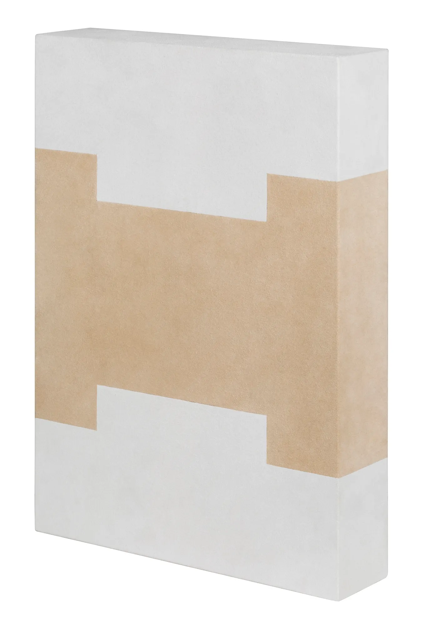 Hung on a wall like paintings or used as decorative elements on a shelf, these three-dimensional units covered in suede, used individually or in multiple compositions, create a connection between the minimalist sculptures by Donald Judd and the graphic geometries of Ettore Sottsass. Leather-covered wood structure.