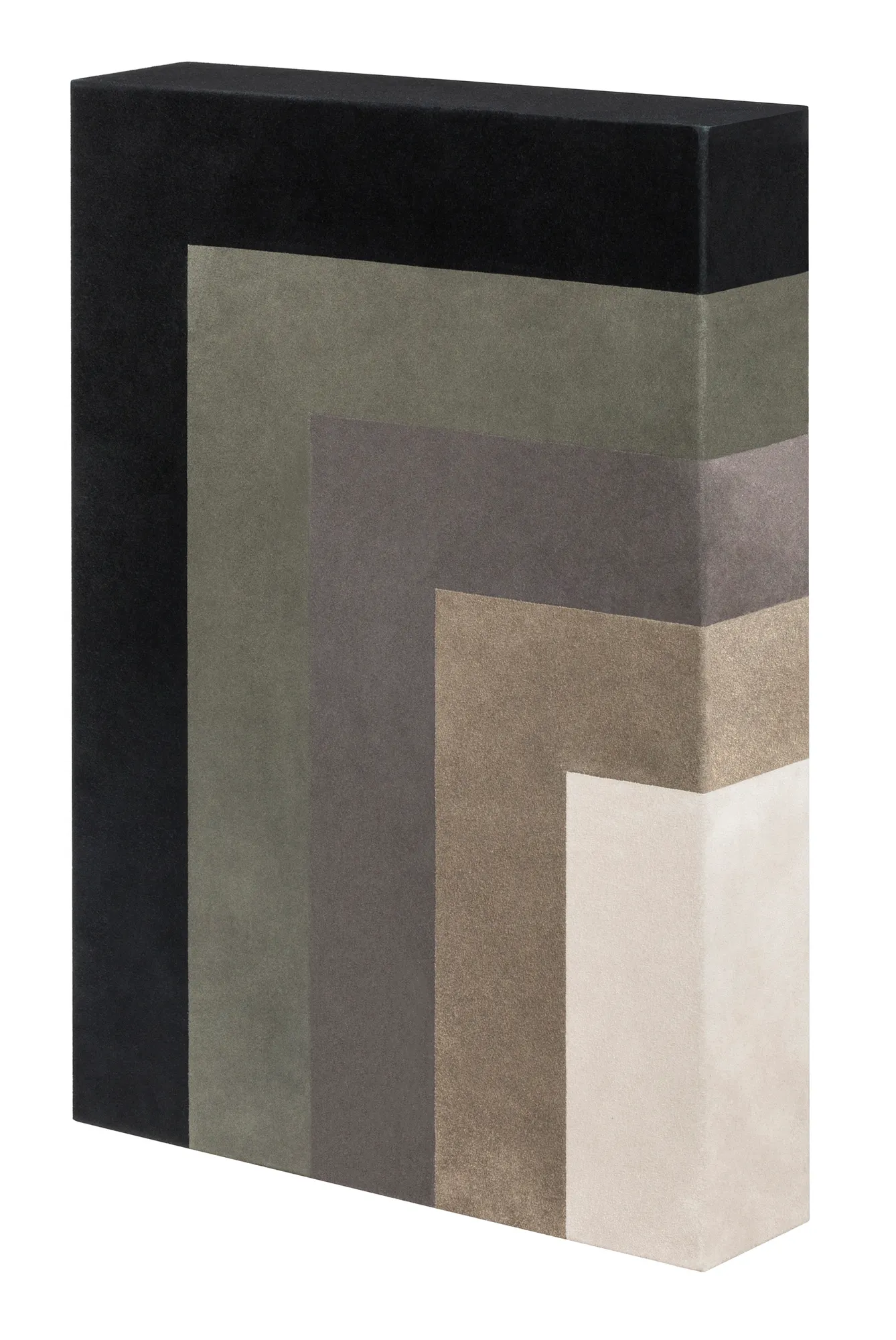 Hung on a wall like paintings or used as decorative elements on a shelf, these three-dimensional units covered in suede, used individually or in multiple compositions, create a connection between the minimalist sculptures by Donald Judd and the graphic geometries of Ettore Sottsass. Leather-covered wood structure.