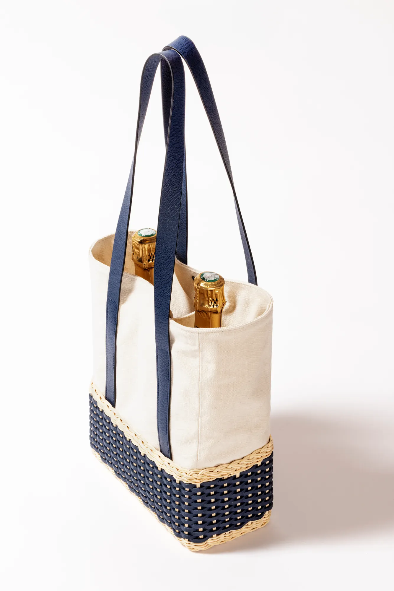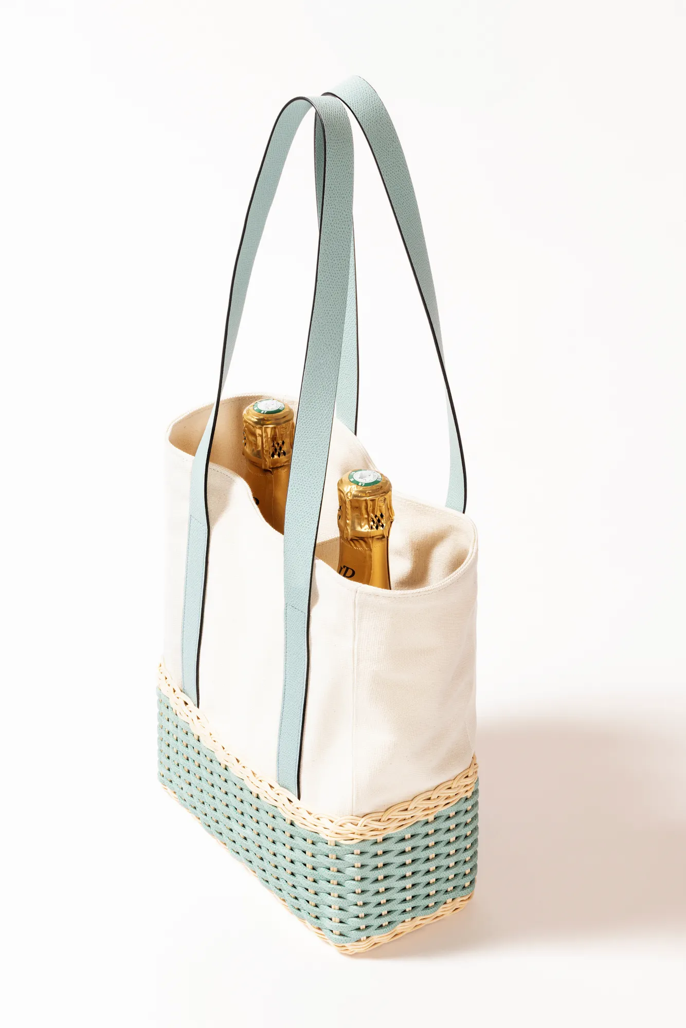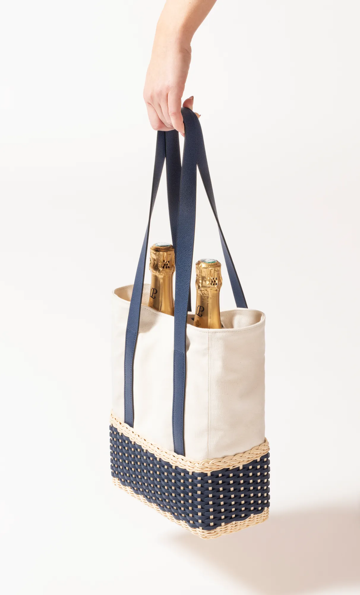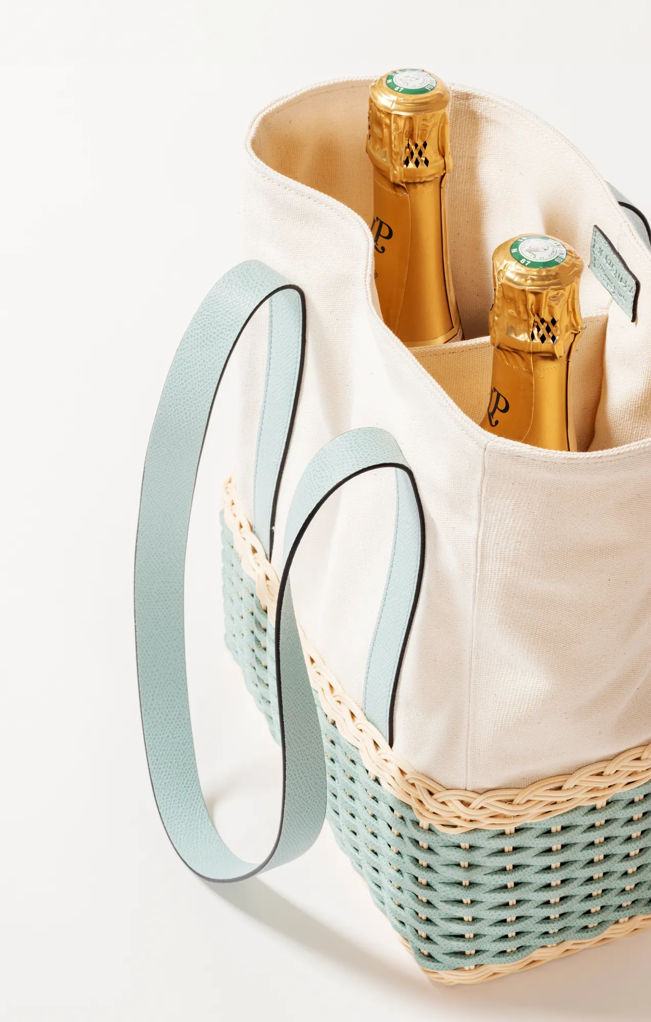 This bottle carrier boasts a simple yet sophisticated design able to enhance the quality of materials: the rigid base, made of the finest woven leather and rattan, is combined with a soft, cream-colored cotton lining with partitions to host bottles. A pair of long handles made of shiny calfskin elegantly characterize the piece not only as a functional part of the structure, but as a graphic distinctive feature.