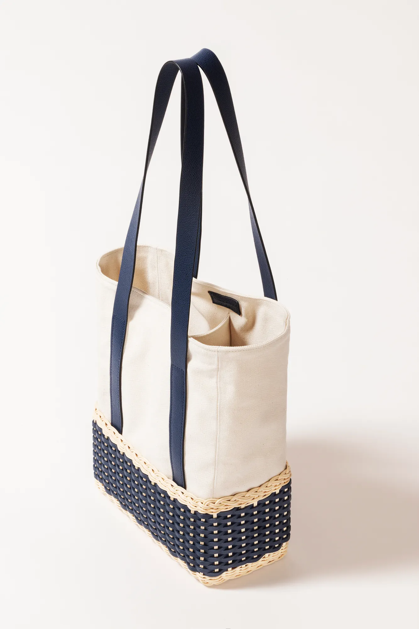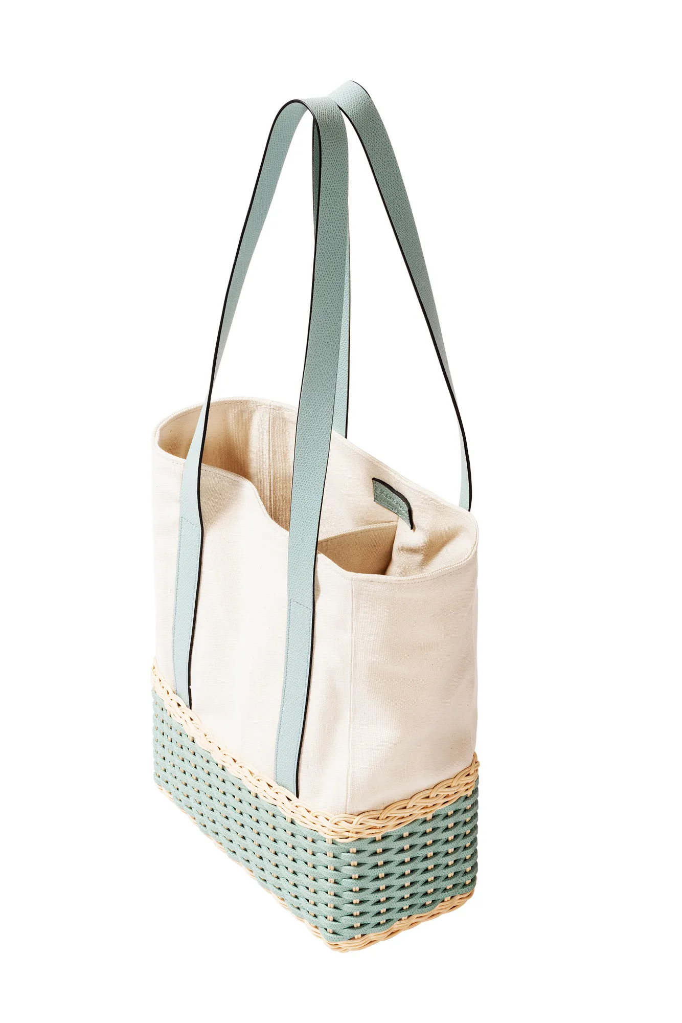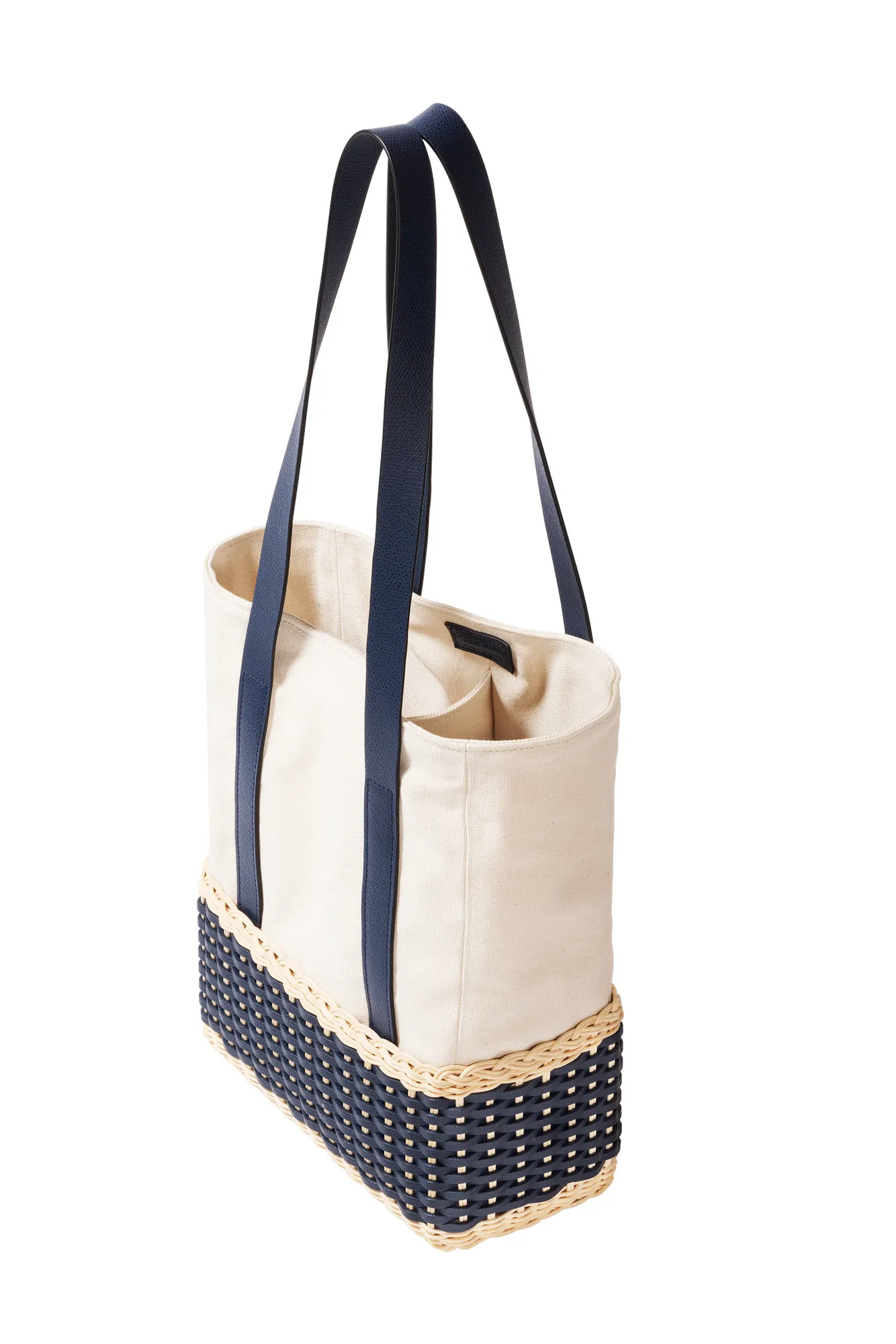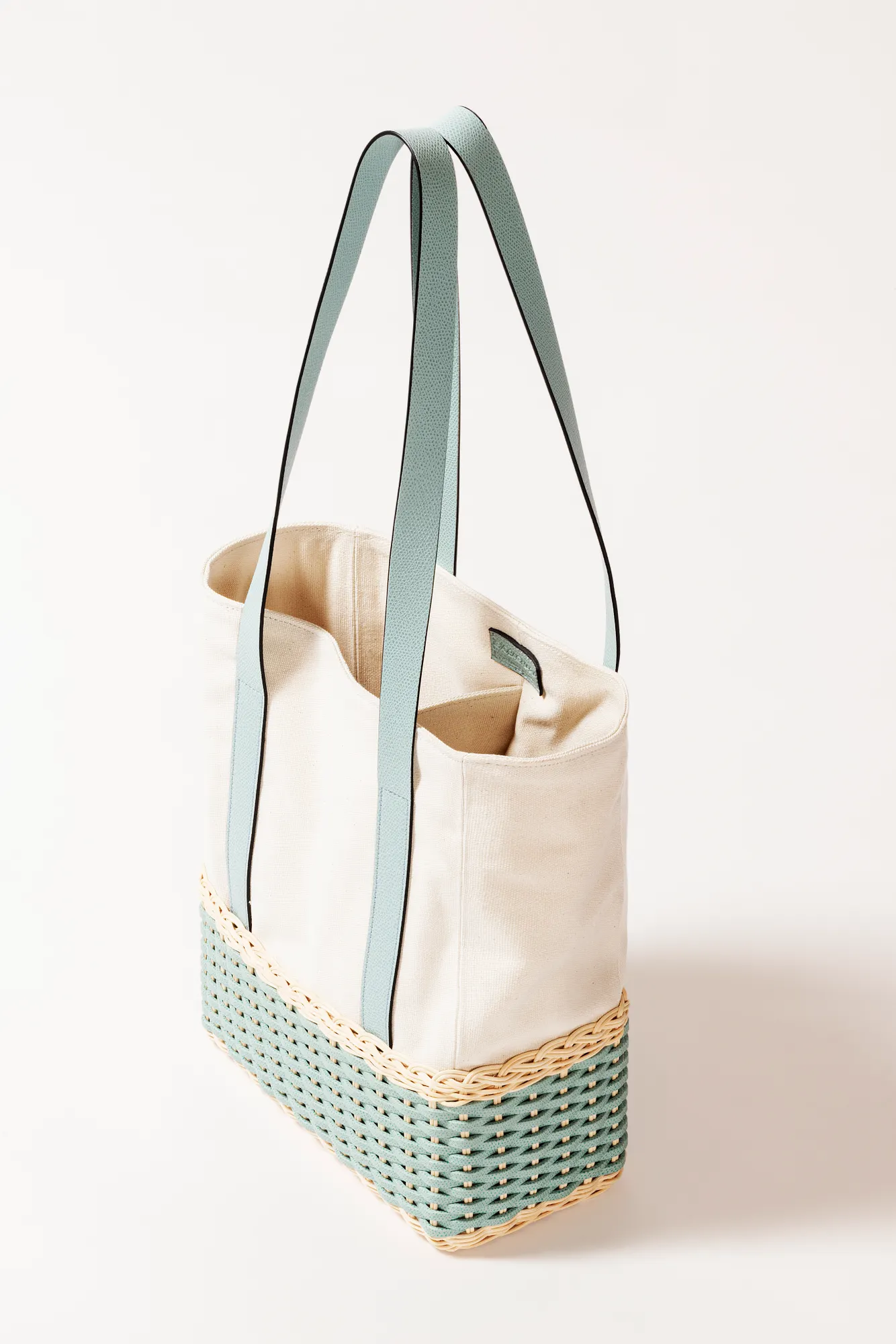This bottle carrier boasts a simple yet sophisticated design able to enhance the quality of materials: the rigid base, made of the finest woven leather and rattan, is combined with a soft, cream-colored cotton lining with partitions to host bottles. A pair of long handles made of shiny calfskin elegantly characterize the piece not only as a functional part of the structure, but as a graphic distinctive feature.