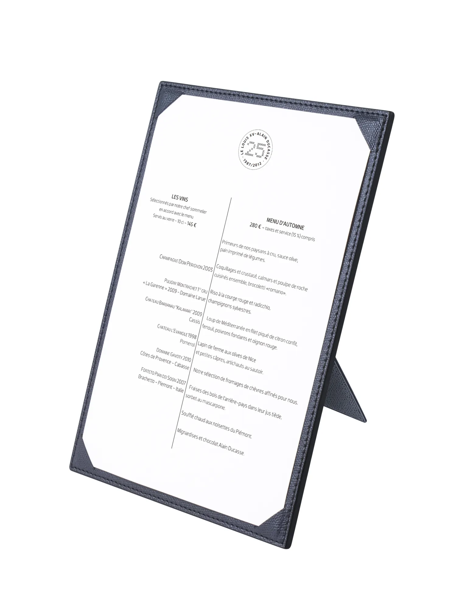Leather covered rigid structure. Hosts two sheets with sizes cm 29.7 x 10.5. Hosts one paper.