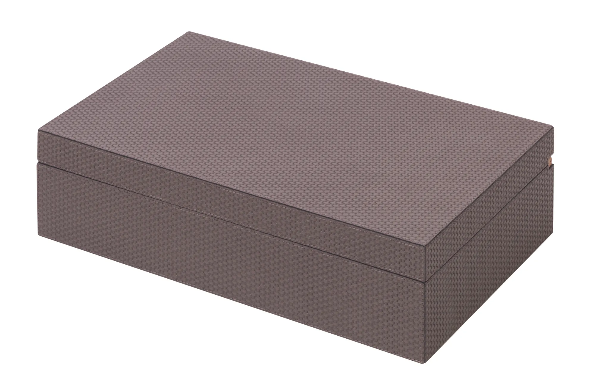 Leather covered aged cedar case. Inner removable dividers with 12 compartments. Leather covered wood structure with hinged lid. Comes with a plexiglass panel able to host 30 Nespresso capsules.