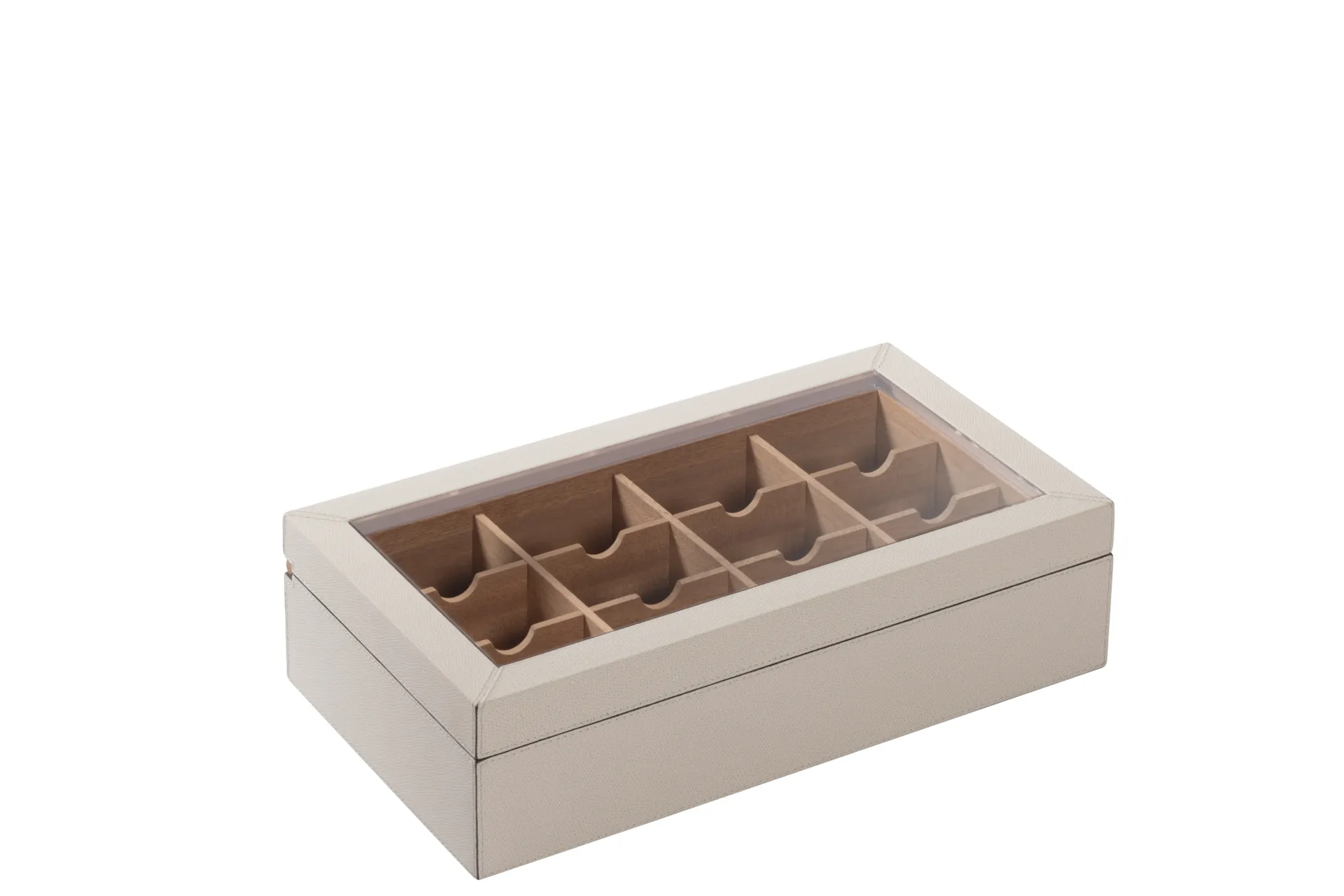 Leather covered aged cedar case with hinged lid featuring a plexiglass insert. Inner removable dividers with 12 compartments.