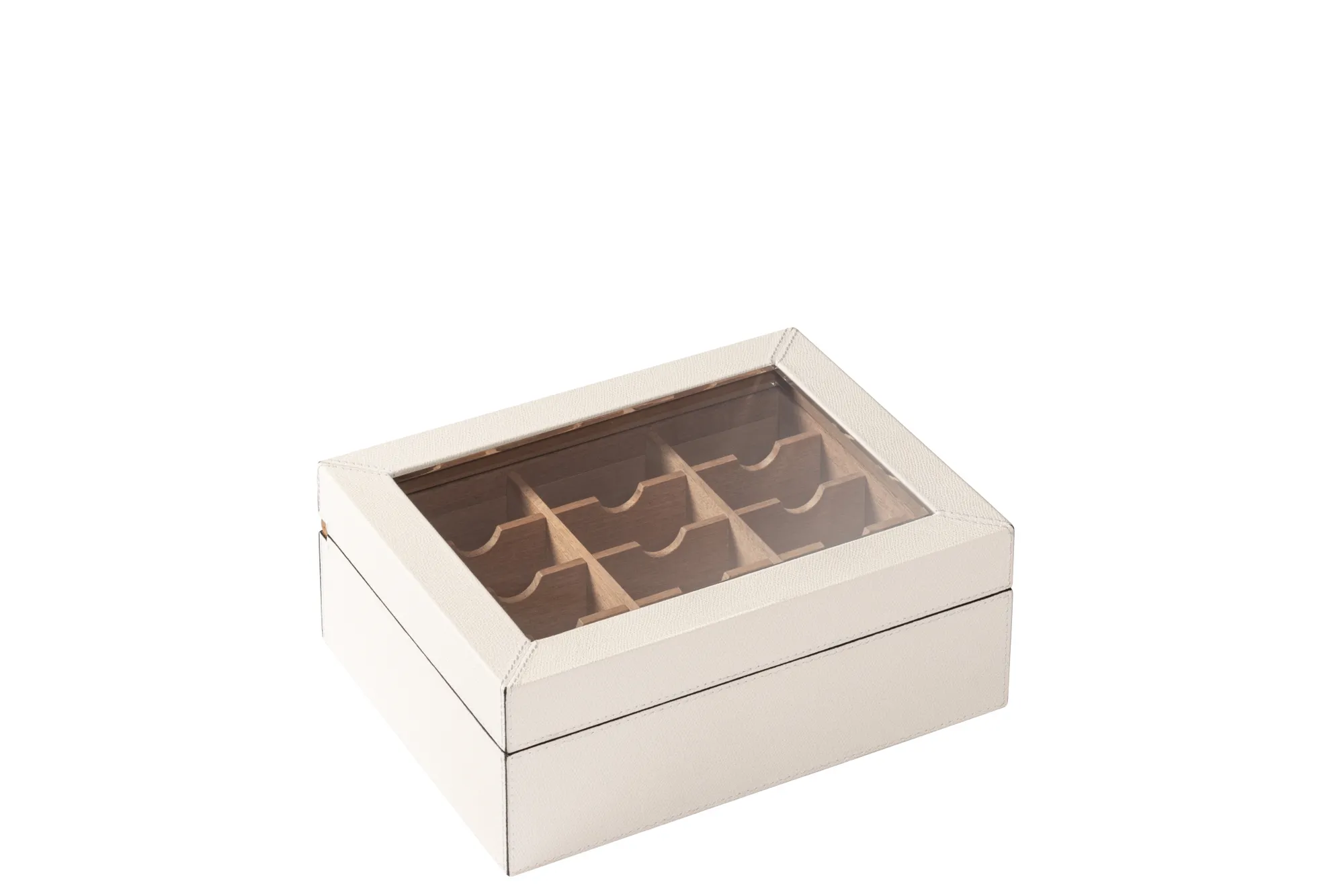 Leather covered aged cedar case with hinged lid featuring a plexiglass insert. Inner removable dividers with 12 compartments.