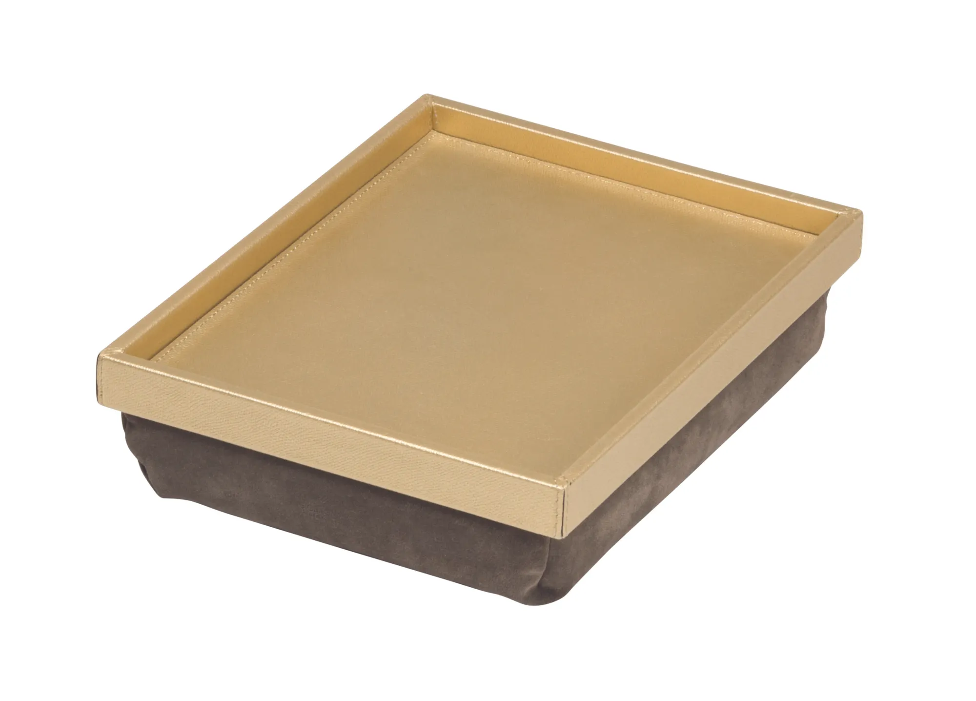 Leather covered wood structure with suede padding underneath (available in all the suede finished calfskin colours from the colour chart) with microbead filling. Ideal for working and reading with smartphones, tablets and laptops, for a coffee or breakfast in bed. Can fit on the arm of the sofa.