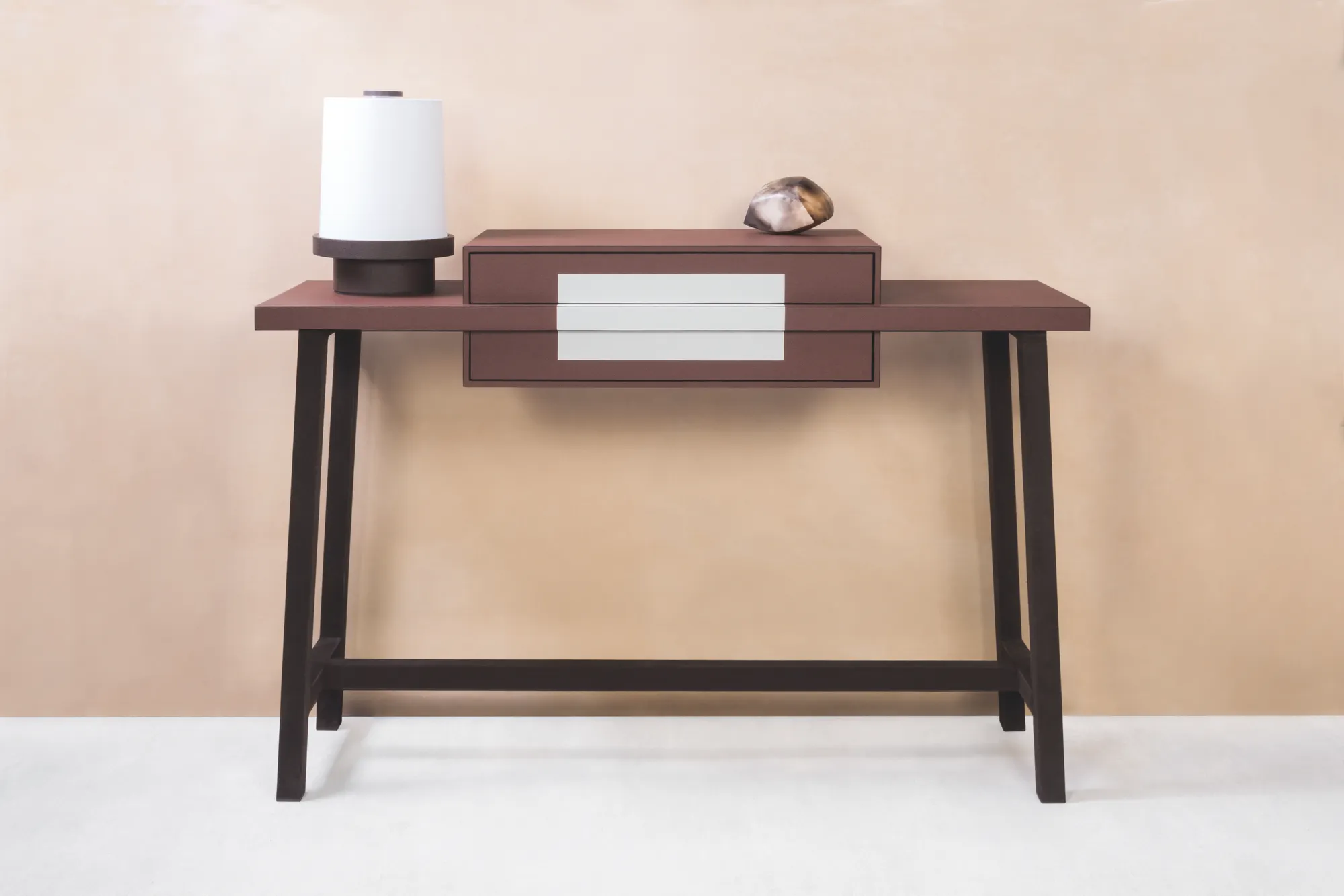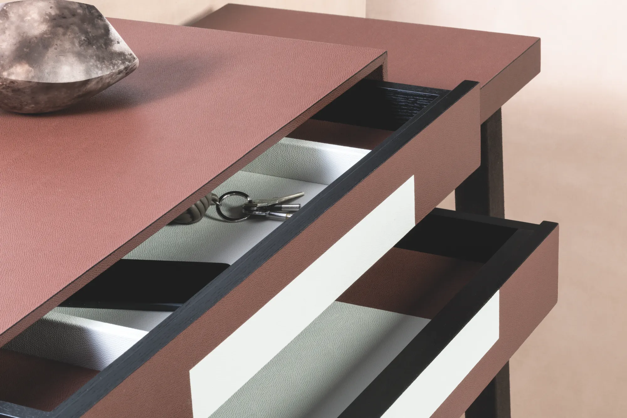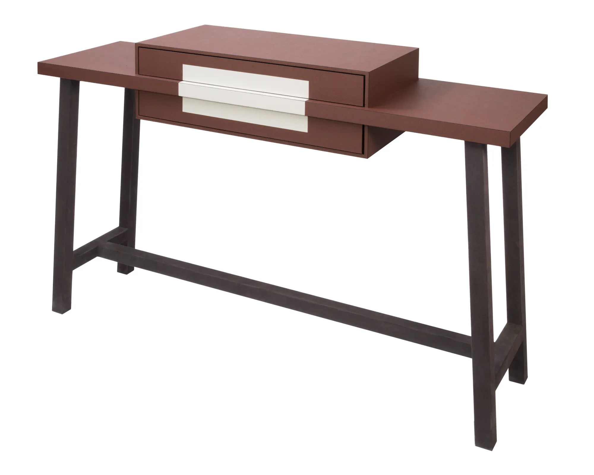 Ideal for the home office, bedroom or reception area, the console features two drawers for storage and is supported by slender legs. Sharp corners are accentuated by precision-cut leather inlay that adds three-dimensionality to the piece and highlights the superior craftsmanship.