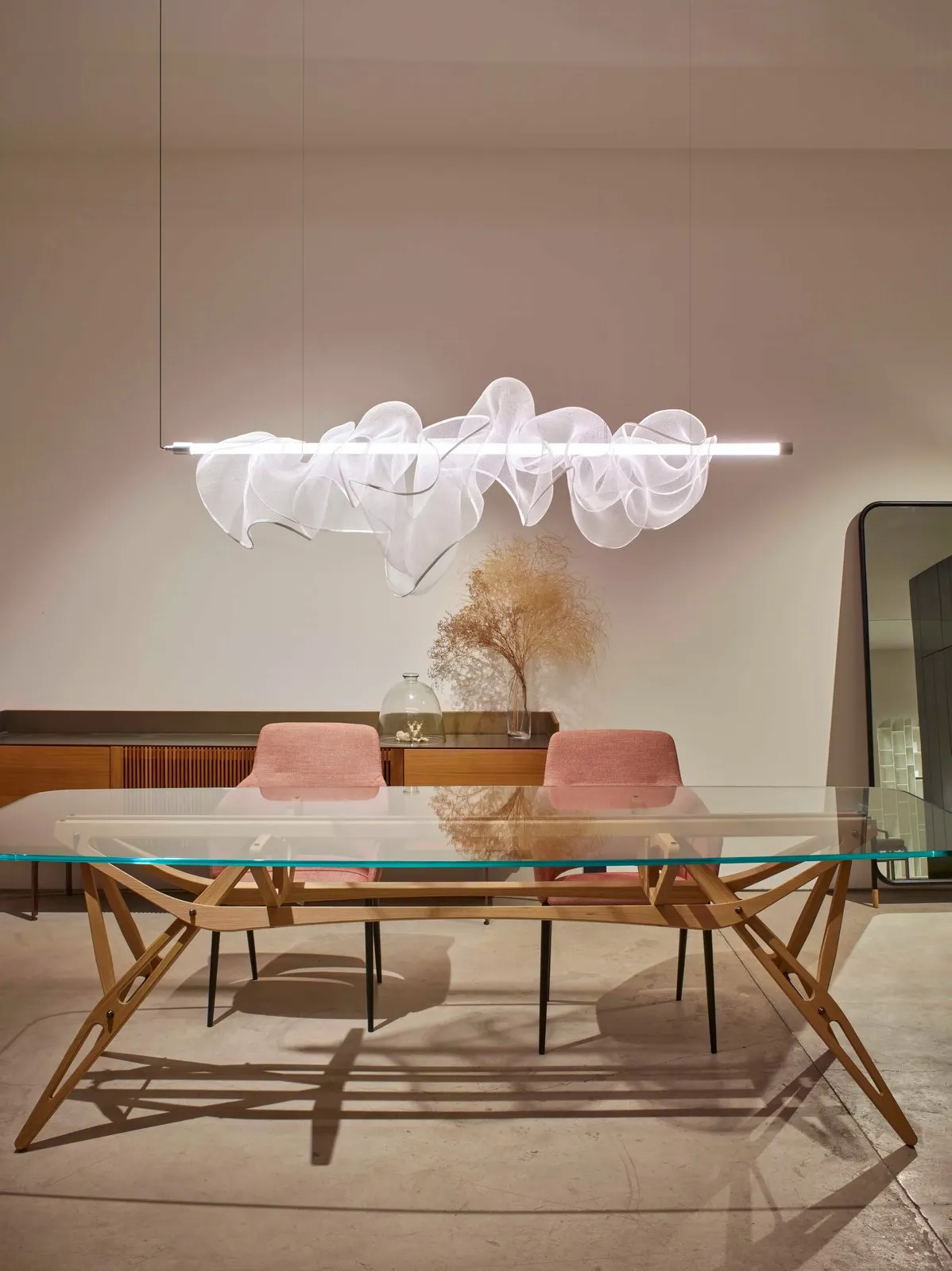 THE CLOUD THE VALUE OF EXCLUSIVE. True to her spirit, Candela Cort believes that genuine luxury is intertwined with simplicity, shaping her fantasy into beautiful objects that bring a touch of joy to the world. Her preference for working with humble and recycled materials reflects her mastery and skill in transforming them into objects of desire: unique pieces that are elegant, subtle yet striking. This dreamlike light pays homage to the movement of clouds that appear, re-form and disappear. It echoes fantasy and speaks of the dexterity with which Candela Cort handcrafts her clouds from her subtle translucent fabrics. Like real clouds, each cloud has a distinct, handmade, random shape. And this is Cort's hallmark, as if it had a life of its own, each luminaire is unique, it can be altered effortlessly, it plays with change. He has achieved with just a veil what time achieves by playing with water and wind. Suspension luminaires of different sizes. Unique and numbered pieces. Signed by the artist.