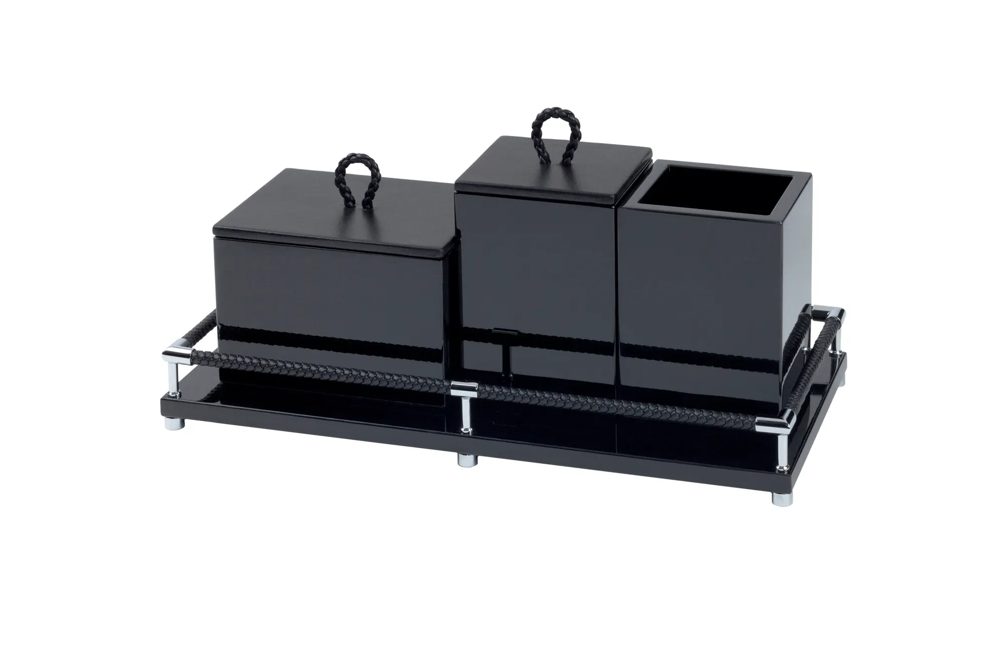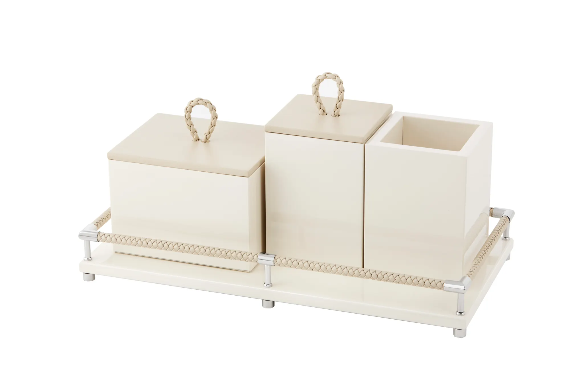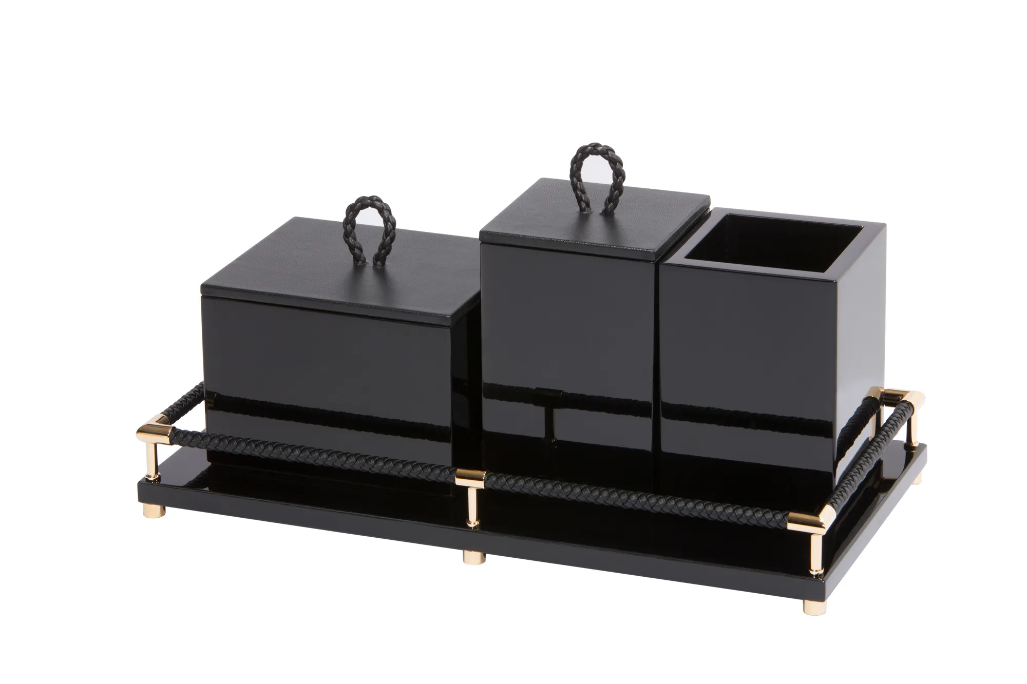 Vanity tray with two trinket boxes and one container, lacquered wood base and braided leather railing, chrome or gold details.