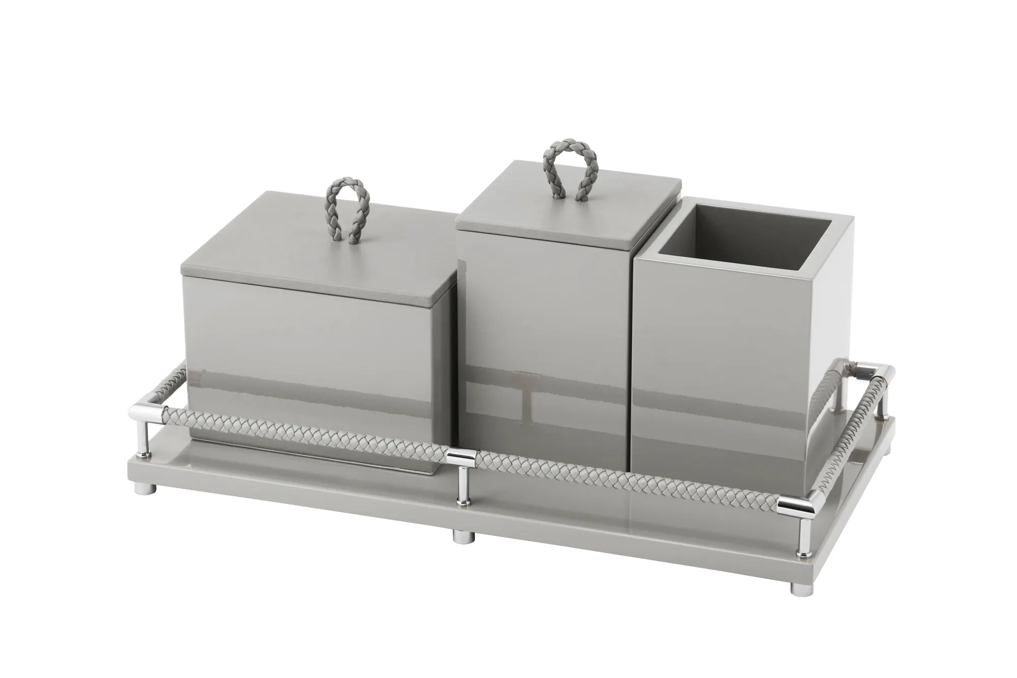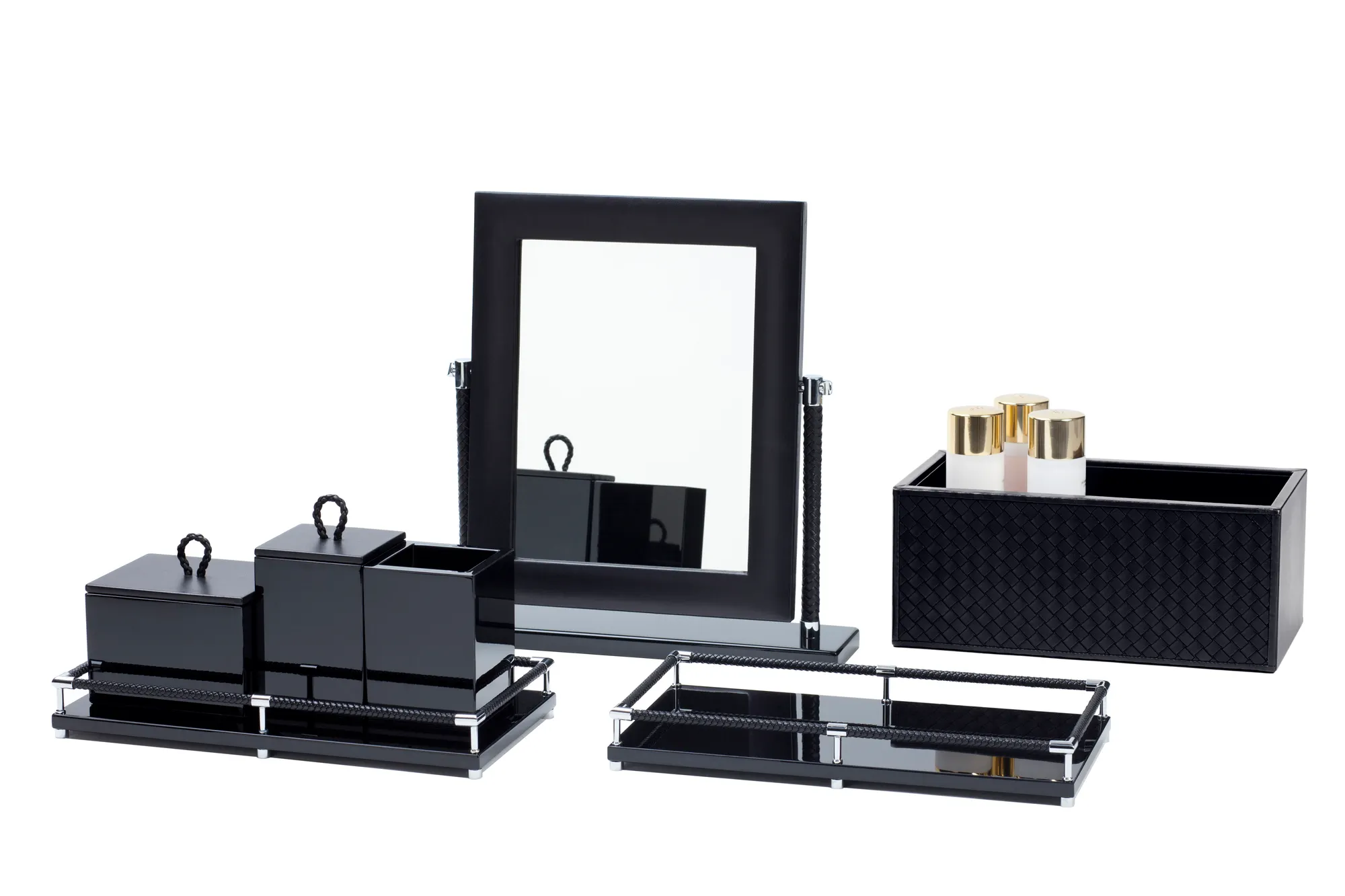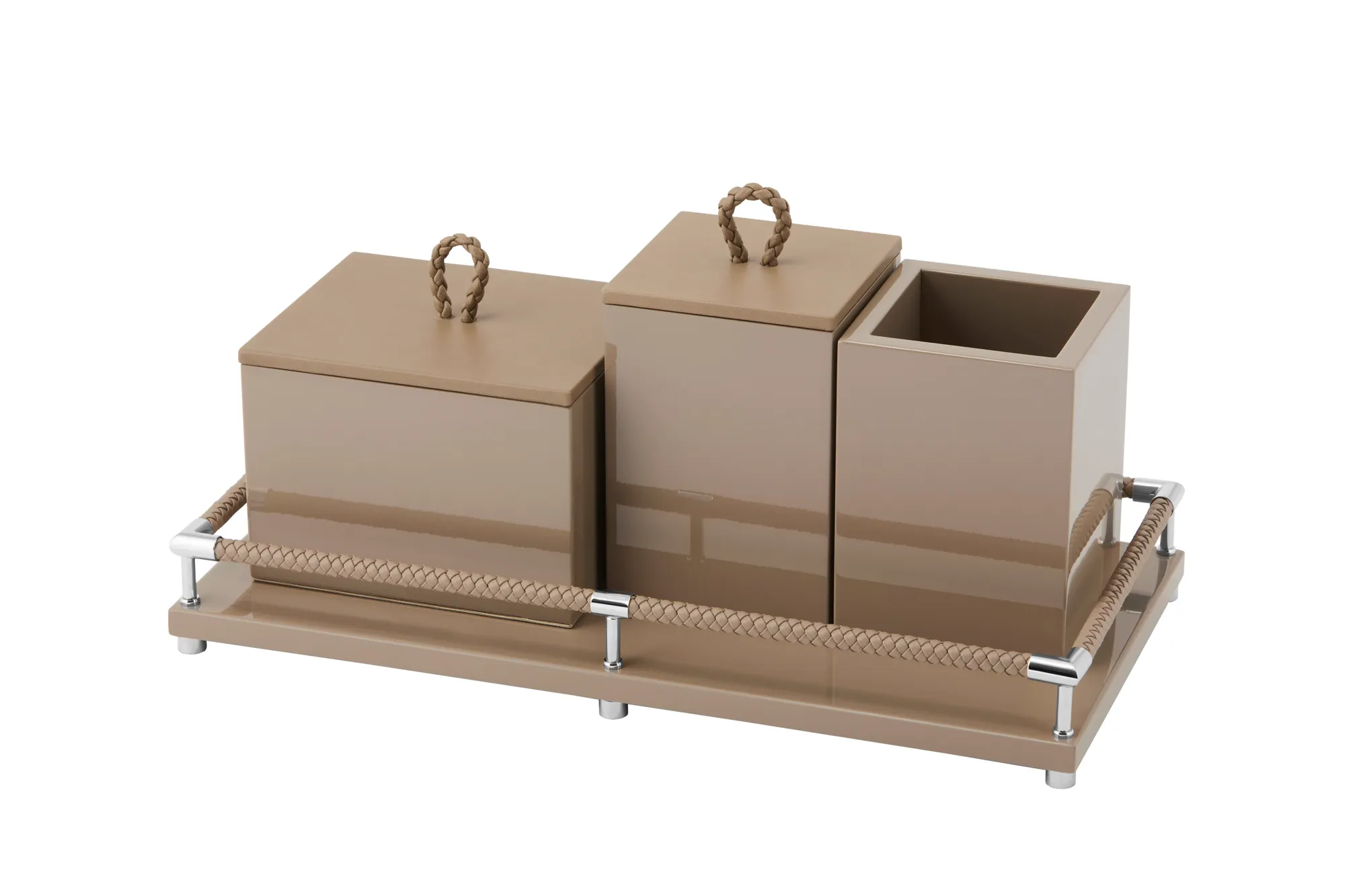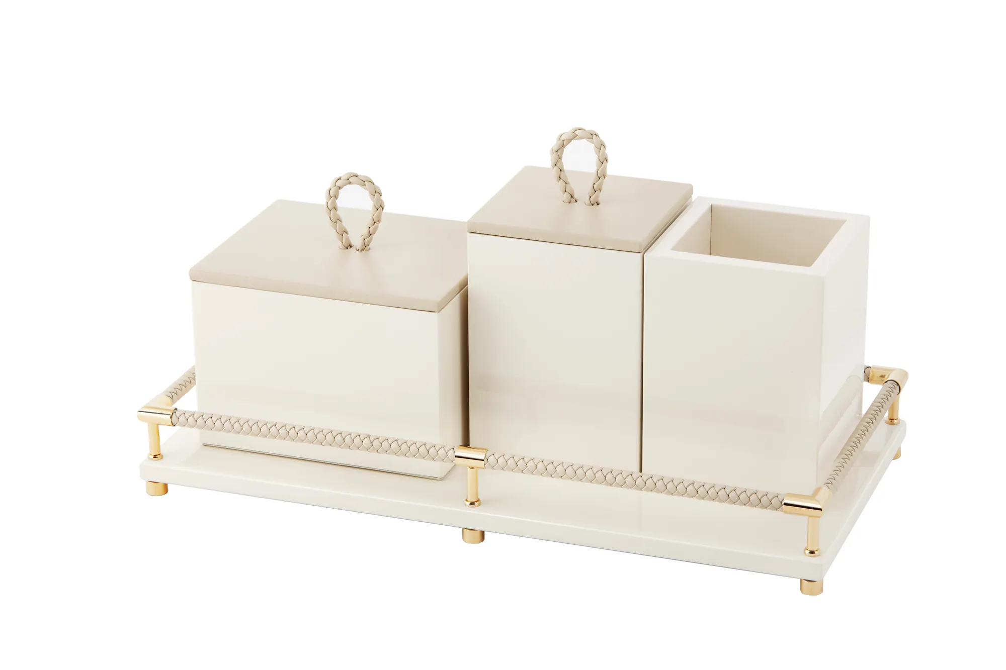 Vanity tray with two trinket boxes and one container, lacquered wood base and braided leather railing, chrome or gold details.