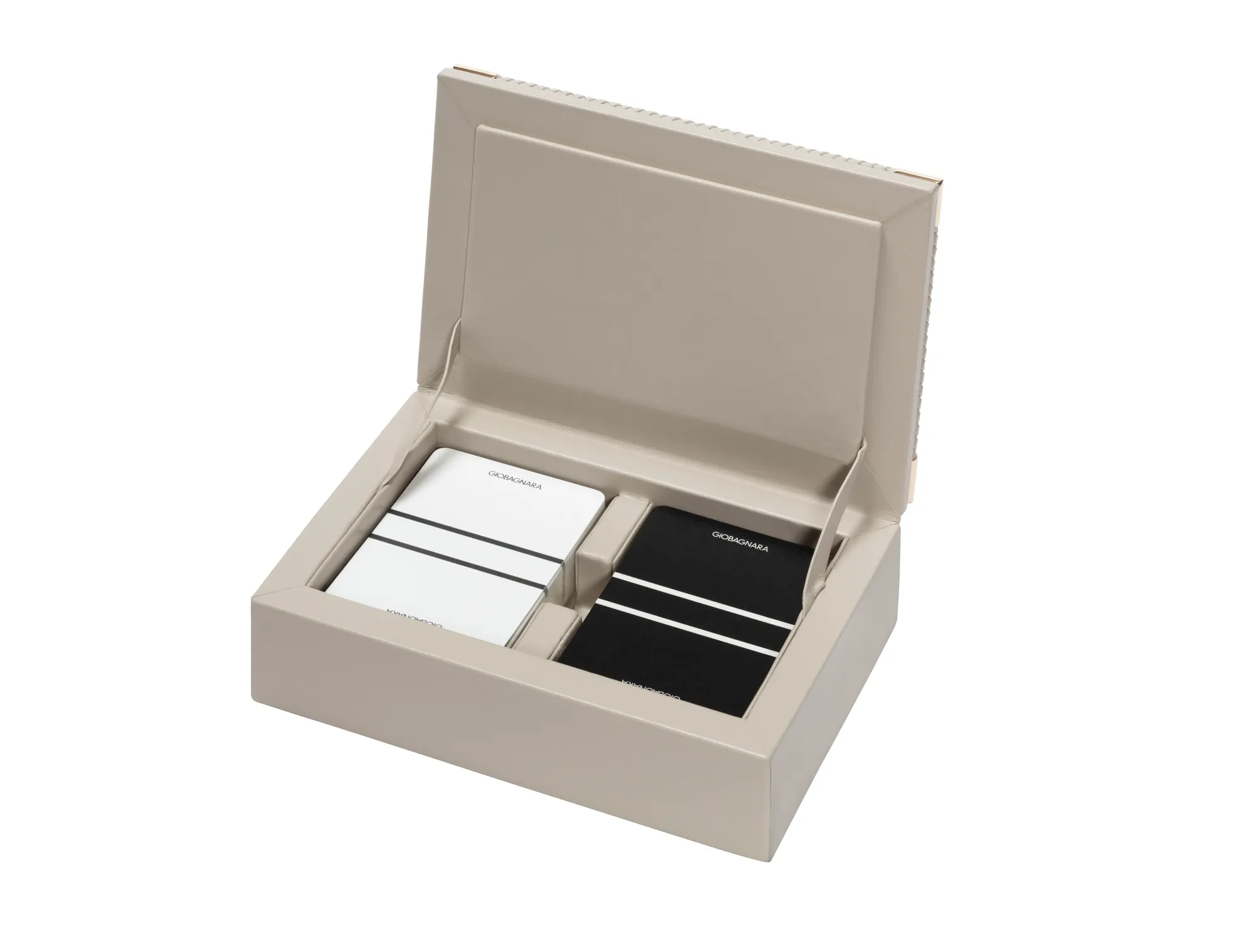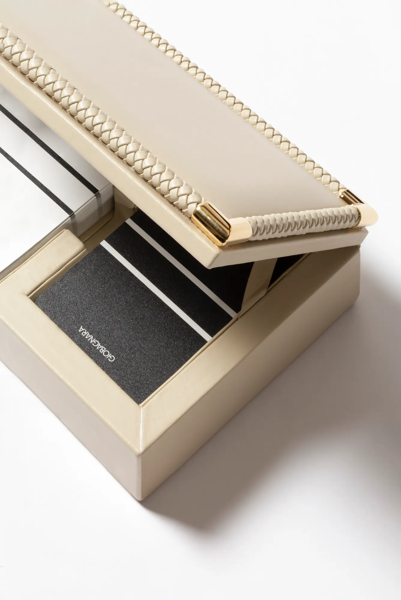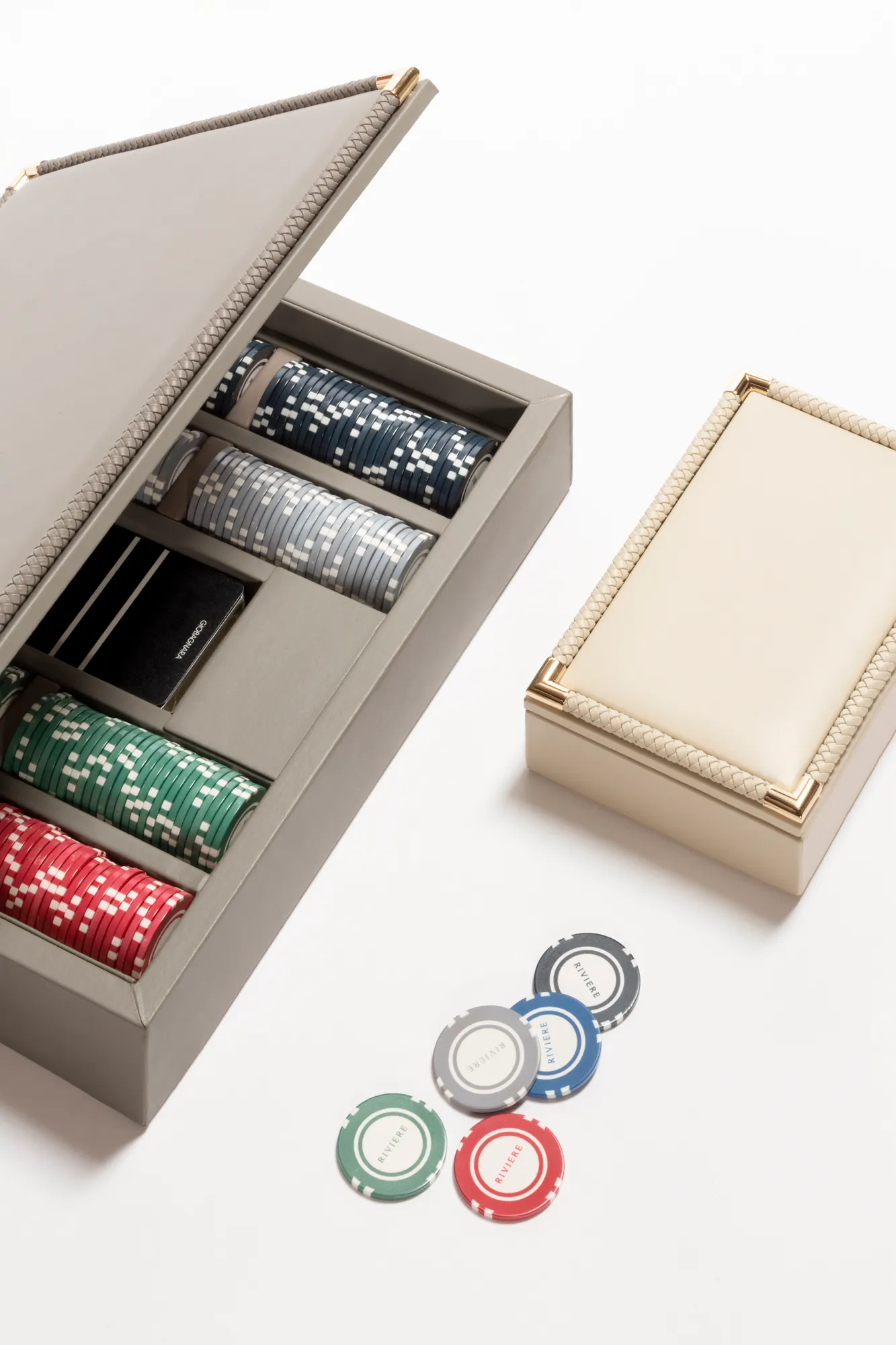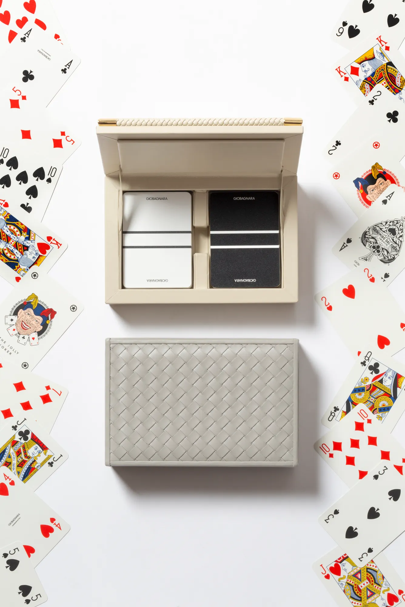 Leather box with braided leather trim and chrome or gold metal details. Includes 2 decks of high quality playing cards.