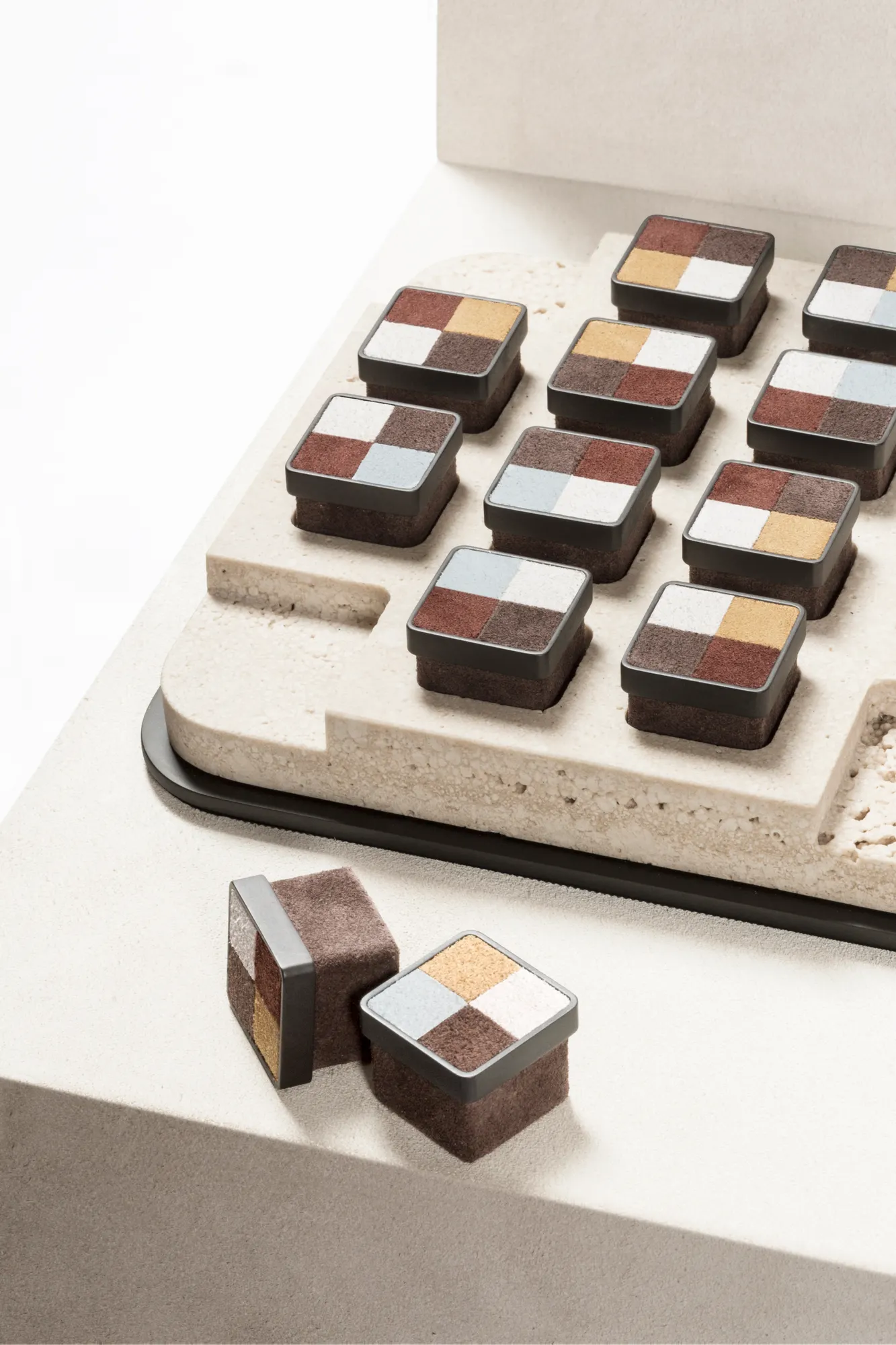 Marble playing field featuring a metal base. The set is equipped with pieces made of brushed bronze with leather inserts.