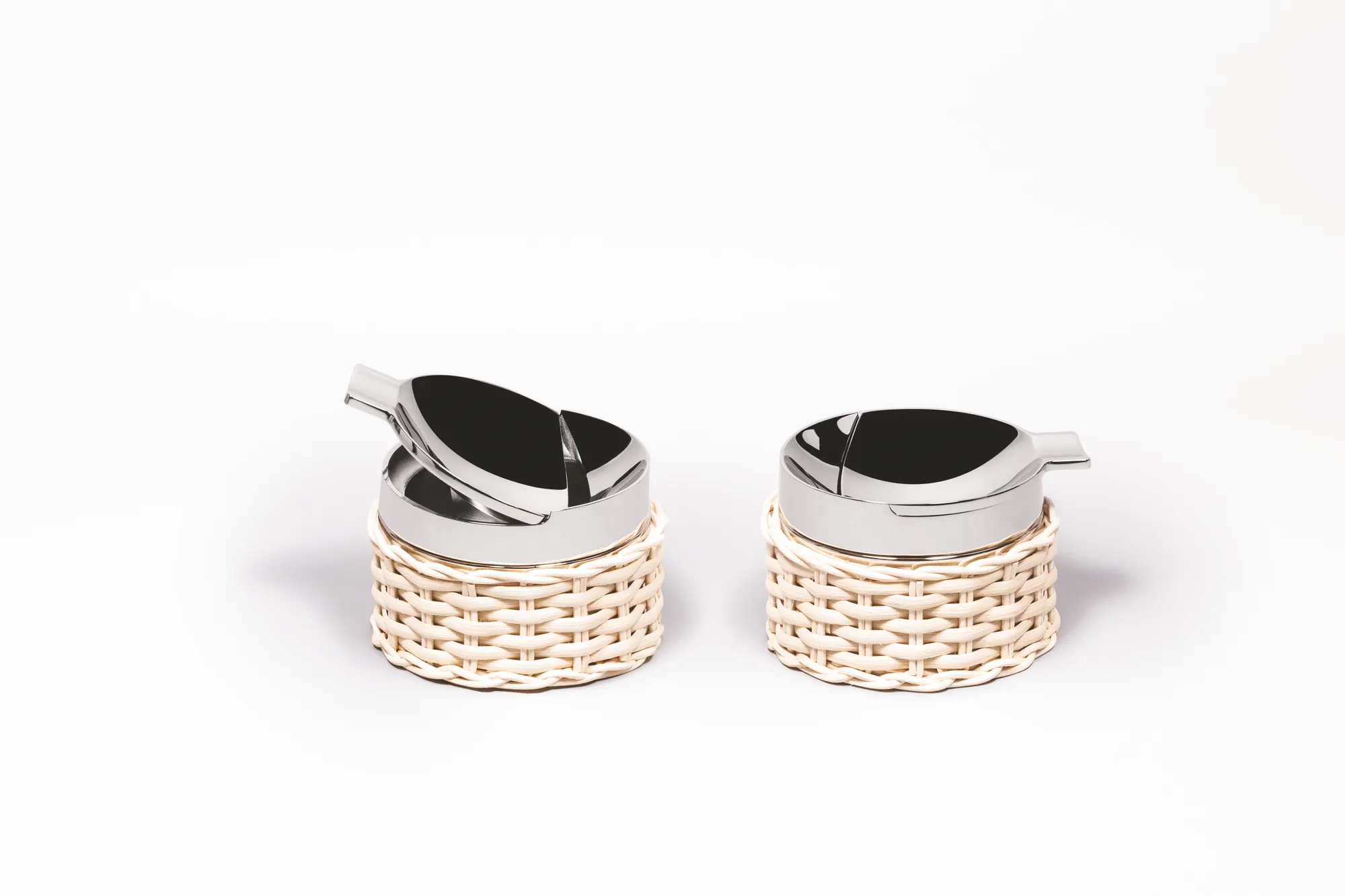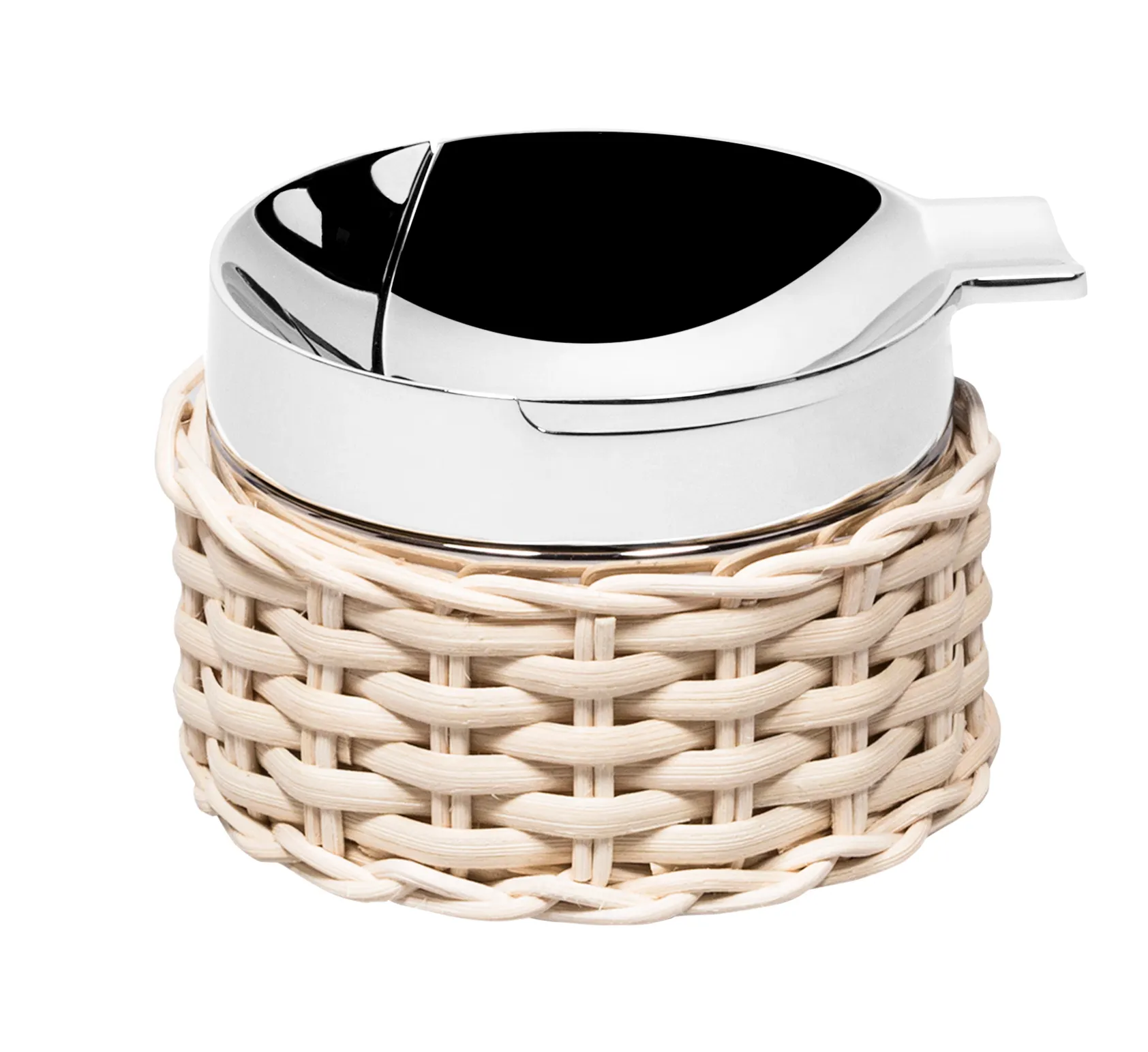 Chrome plated brass structure partially dressed in rattan. Featuring an easy-to-clean ash basin, this windproof ashtray keeps spaces tidy by enclosing cigarette butts and ashes in a sealed chamber which can be emptied when needed.