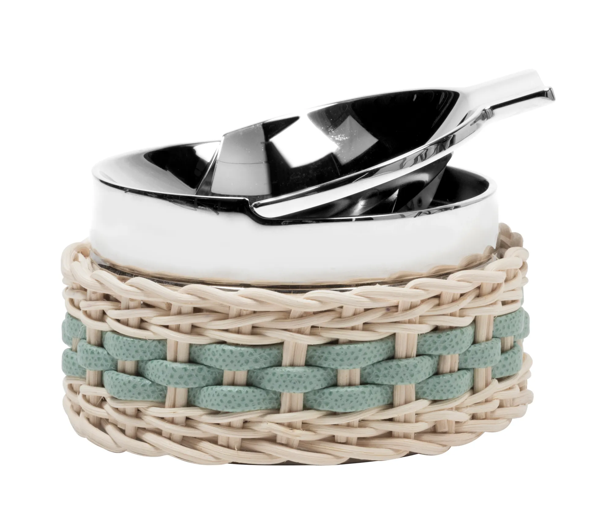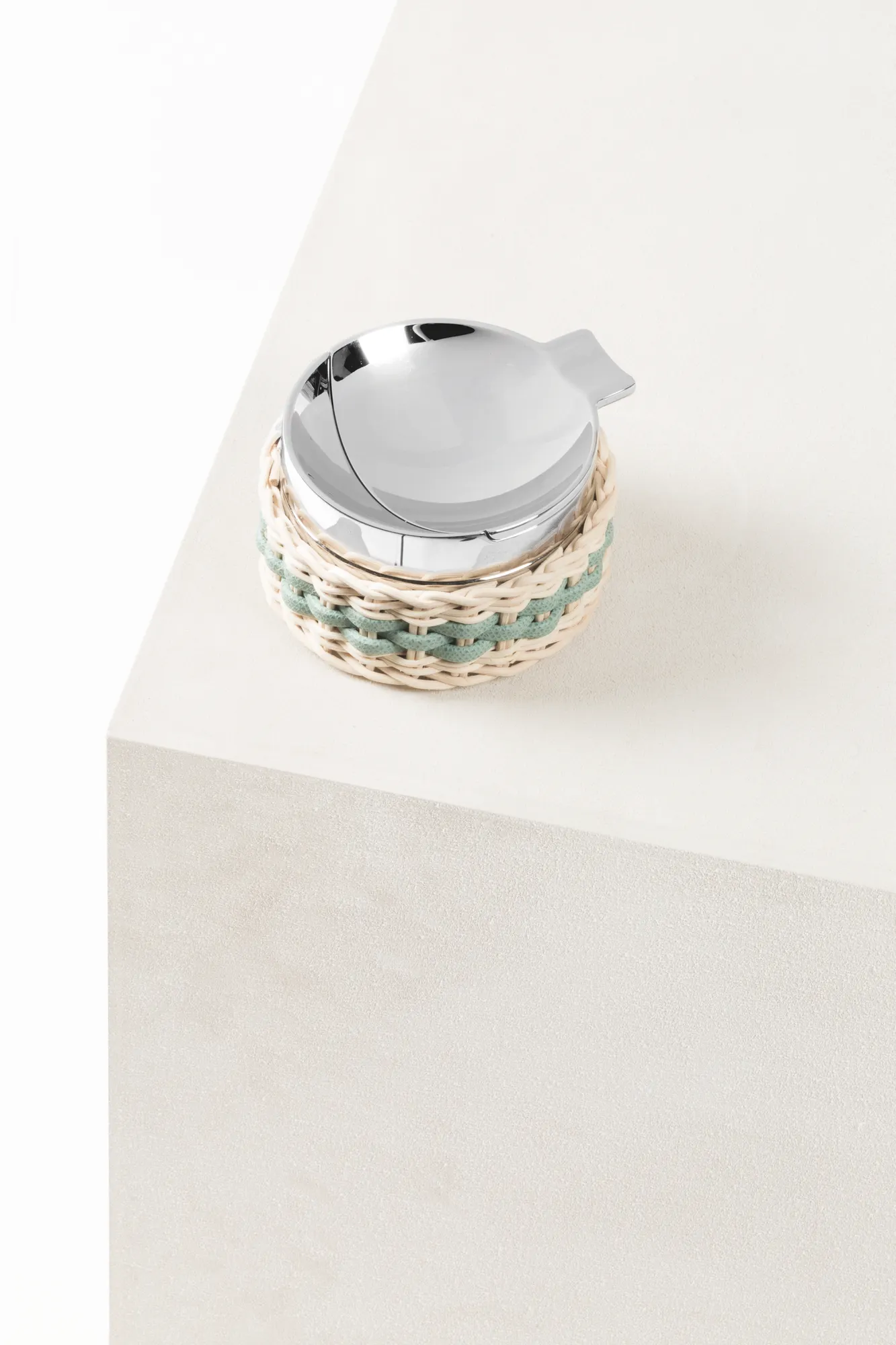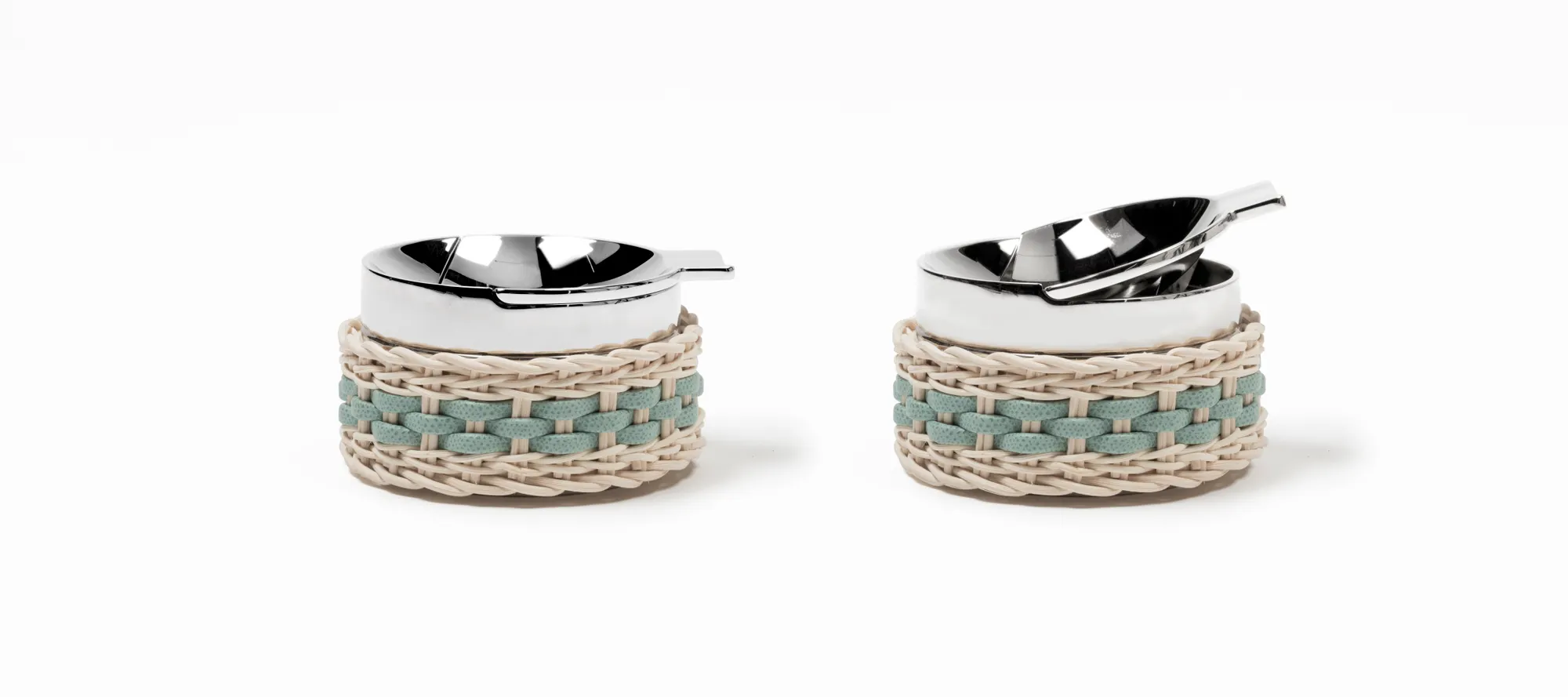 Chrome plated brass structure partially dressed in woven leather and rattan. Featuring an easy-to-clean ash basin, this windproof ashtray keeps spaces tidy by enclosing cigarette butts and ashes in a sealed chamber which can be emptied when needed.